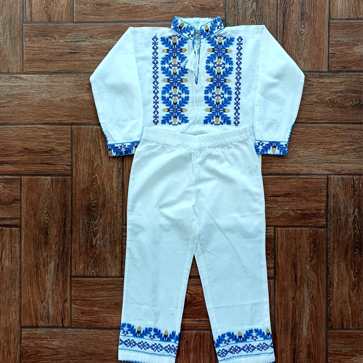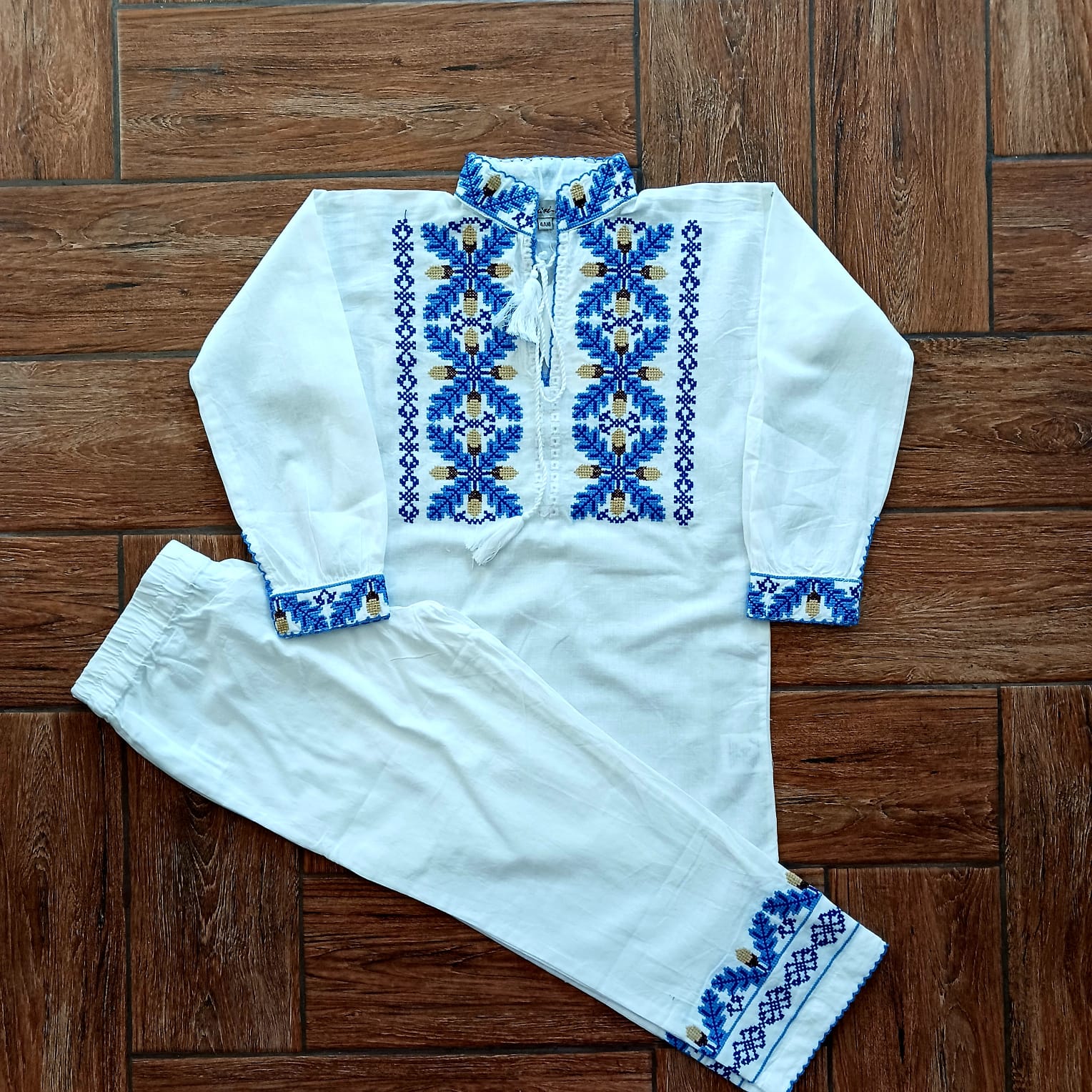Costum traditional pentru baiat , compus din 2 piese , camasa cu pantaloni. Este brodat cu ata albastra si bej, motiv  geometric si floral . Se poarta cu mandrie la evenimente traditionale si culturale. Se poate accesoriza prin legarea in talie a unui brau .