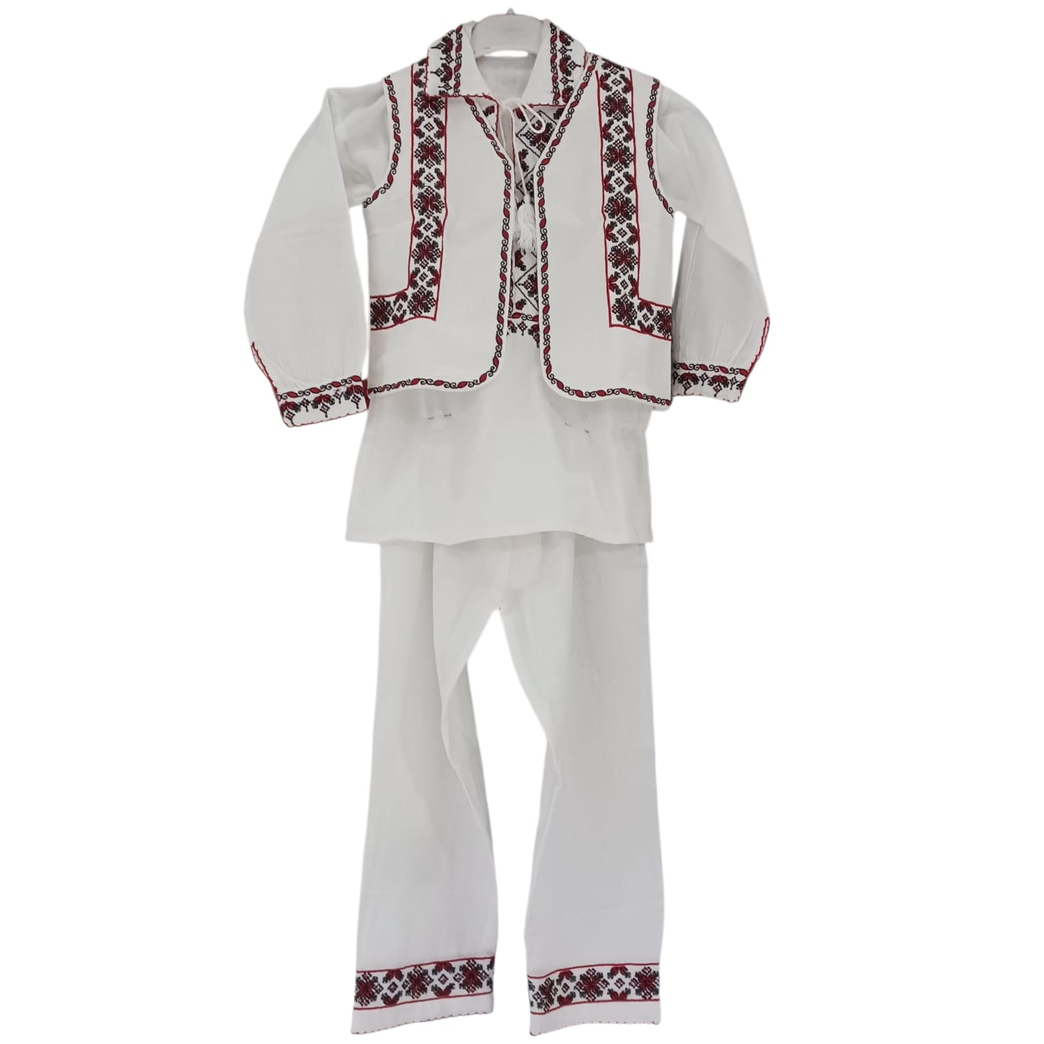 Costum traditional pentru baiat , compus din 3 piese , camasa, vesta, pantaloni. Este brodat cu ata rosie si neagra, motiv  geometric . Se poarta cu mandrie la evenimente traditionale si culturale. Se poate accesoriza prin legarea in talie a unui brau .