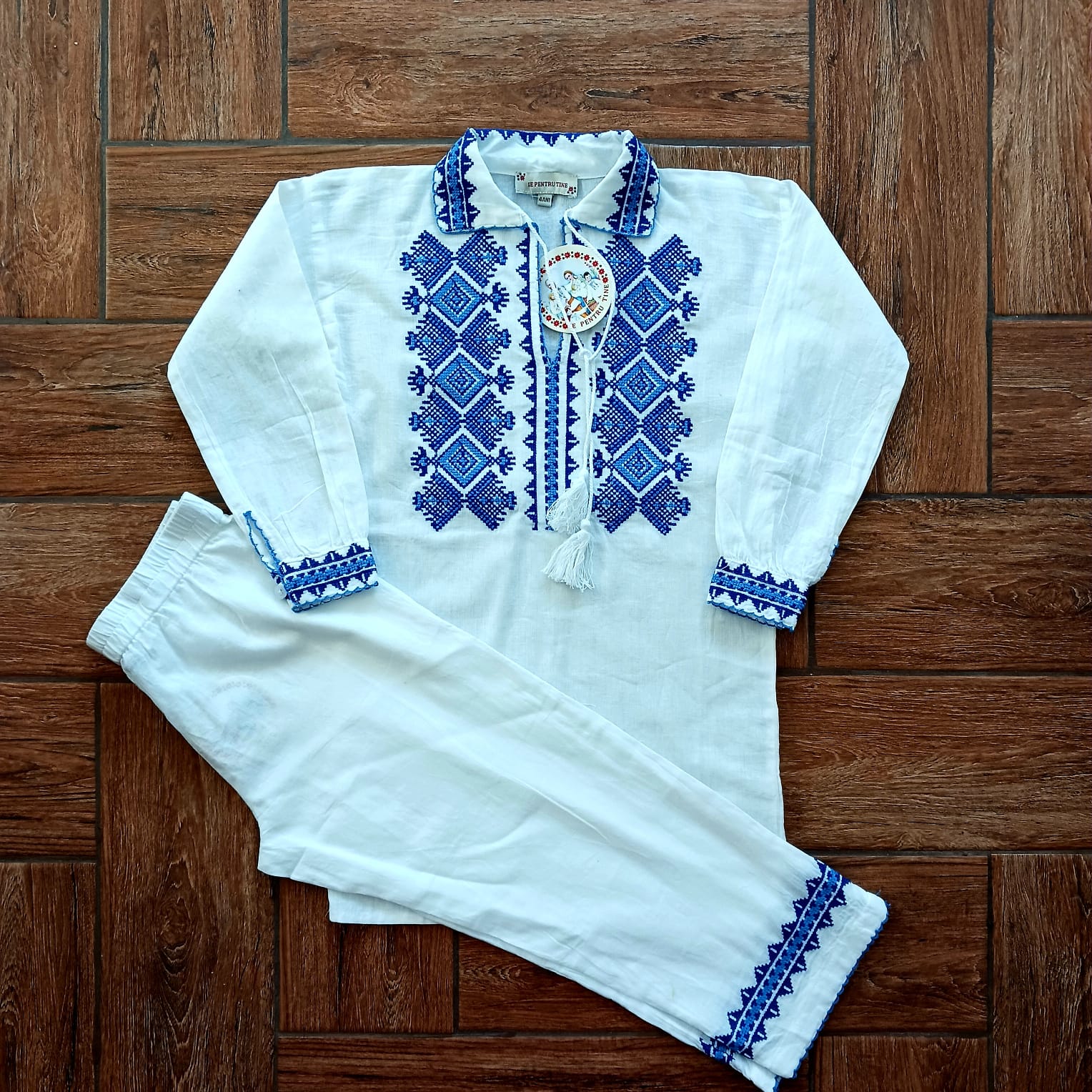 Costum traditional pentru baiat , compus din 2 piese , camasa, pantaloni. Este brodat cu ata albastra si bleo, motiv  geometric . Se poarta cu mandrie la evenimente traditionale si culturale. Se poate accesoriza prin legarea in talie a unui brau .