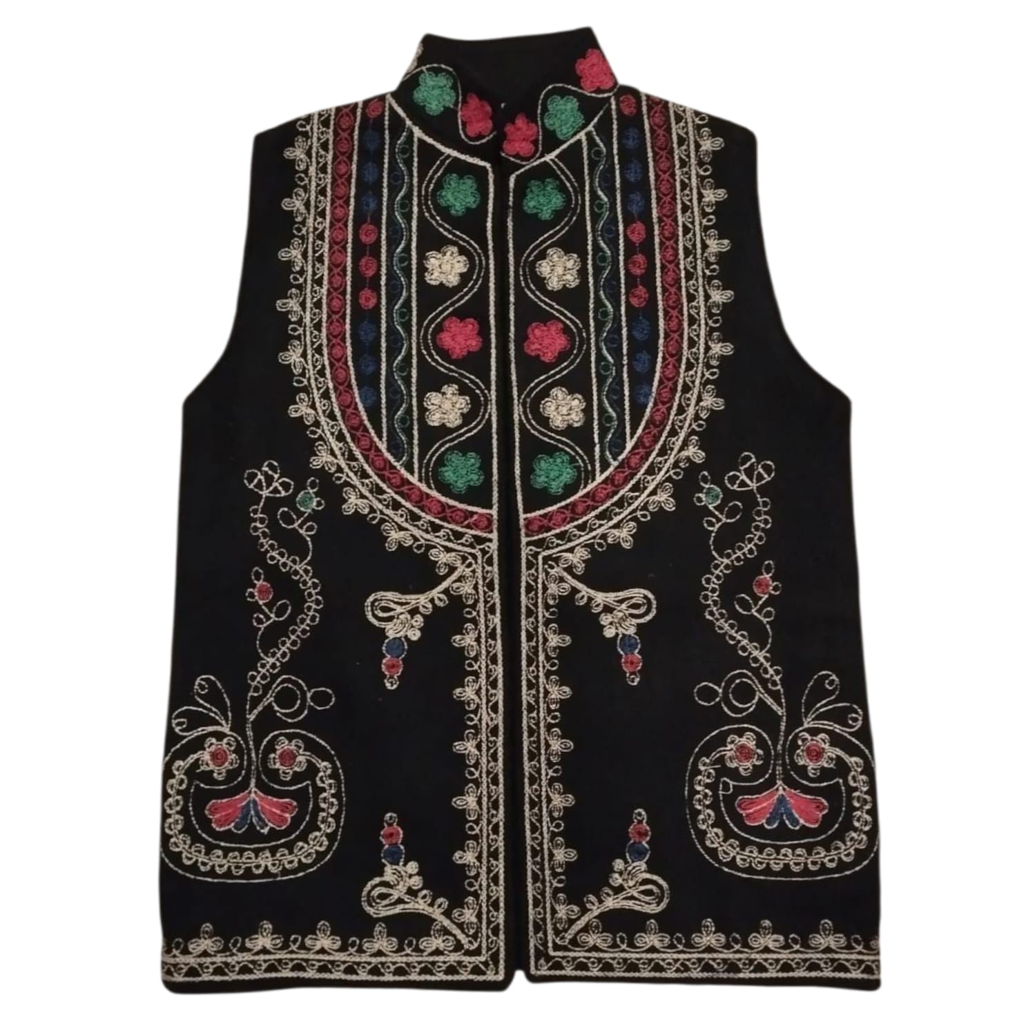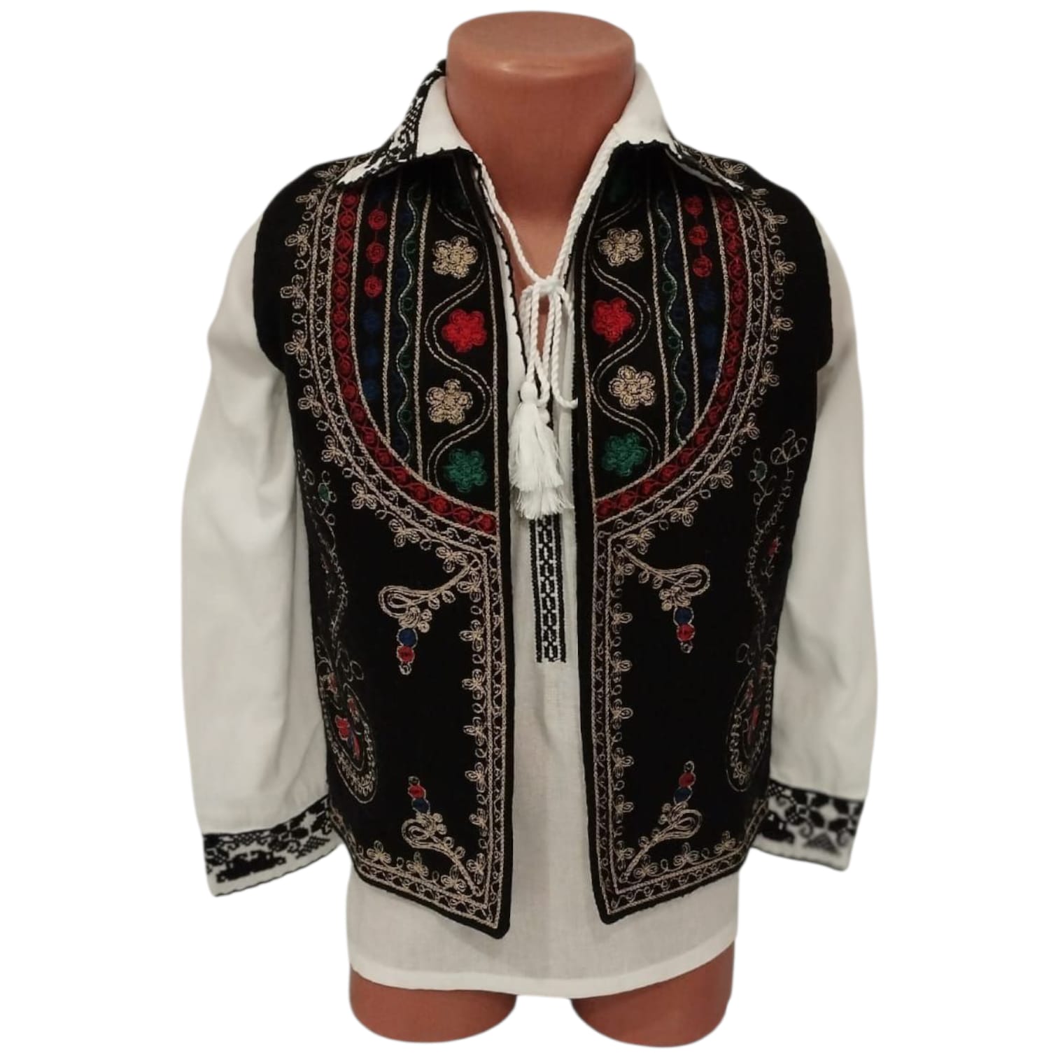 Vesta traditionala baiat , fond negru guler tunica, brodata cu motiv geometric, brodata cu ata colorata. Material deosebit, stofa , captusita se aseaza si asorteaza usor.