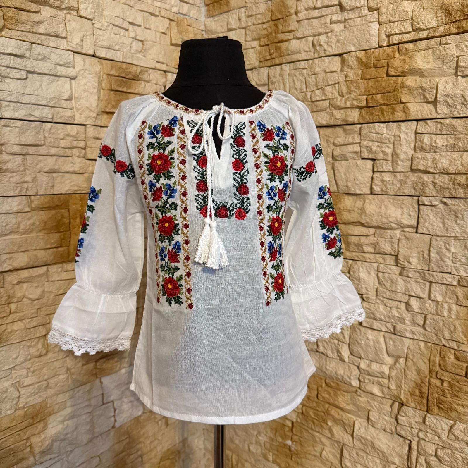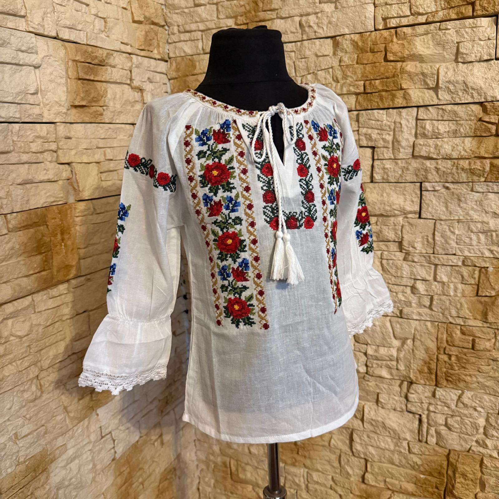 Ie traditionala fond alb, brodata cu ata colorata , motiv floral. La maneca are volan si dantela ca terminatie. Se poarta cu mandrie la evenimente culturale si traditionale.