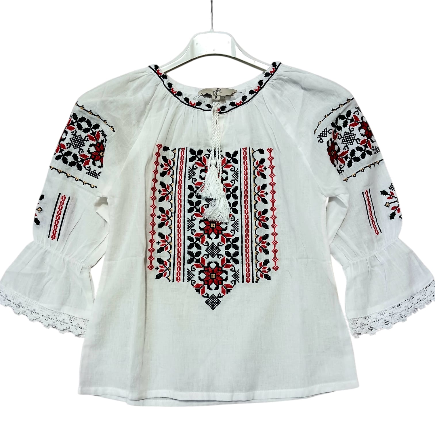 Ie traditionala fetita, brodata , motiv geometric rosu cu negru. La gat are siret reglabil iar la maneci are volan cu dantela ca terminatie. Se poarta cu mandrie zi de zi sau la evenimente culturale.