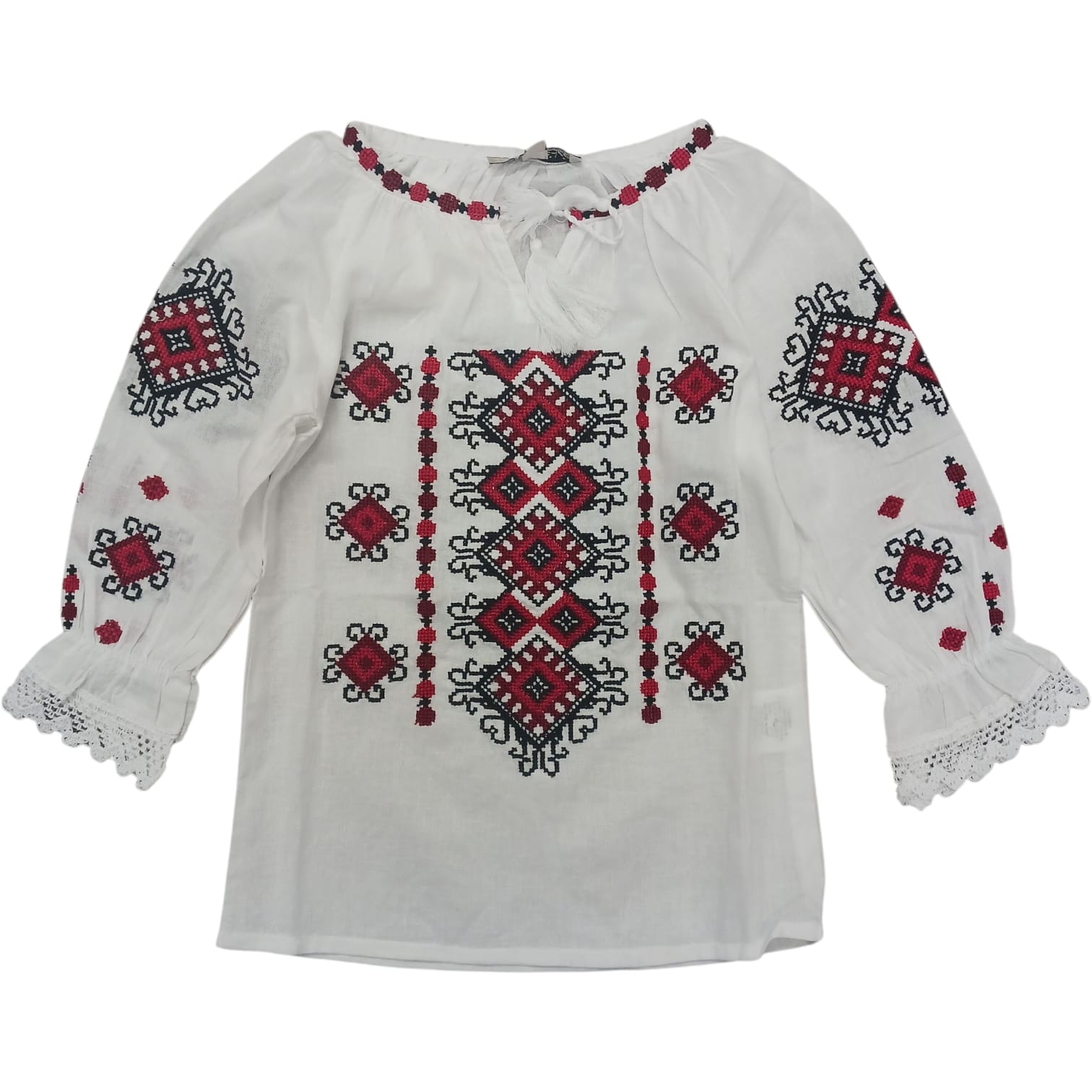 Ie traditionala fetita , brodata motiv geometric rosu cu negru. Maneca este cu volan si terminatie din dantela. La gat are siret reglabil. Se poarta cu mandrie la evenimente traditionale si culturale.