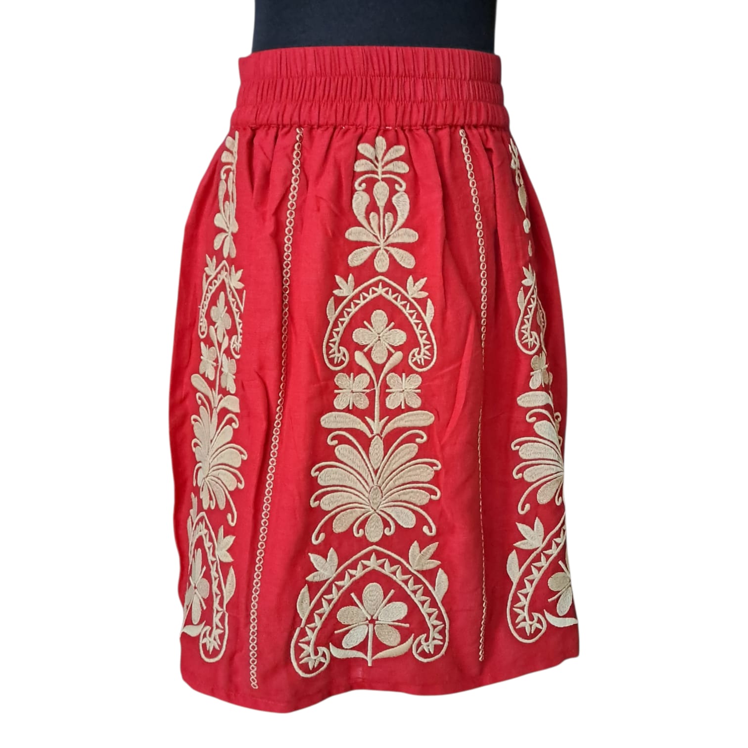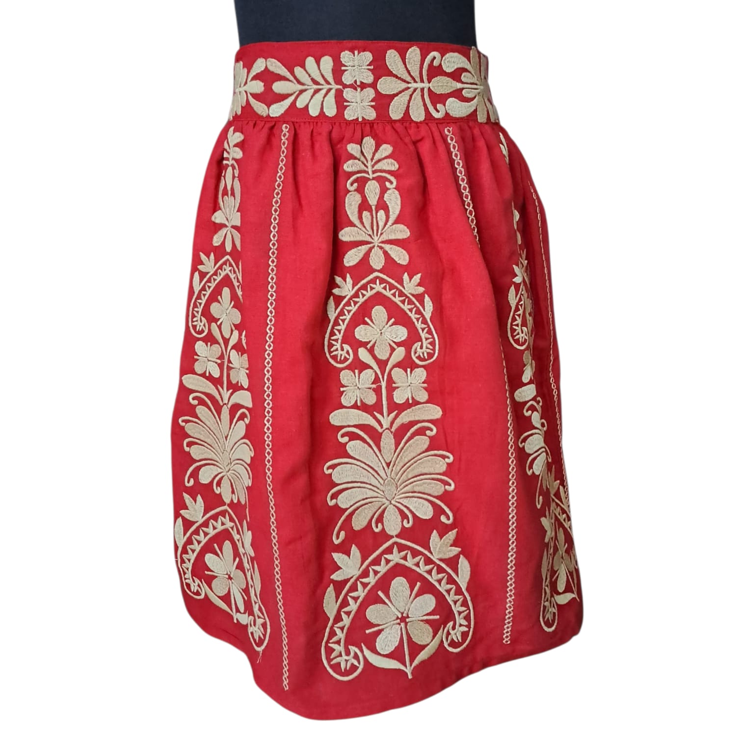 Fustă Tradițională Rosie cu Broderie Florală bej