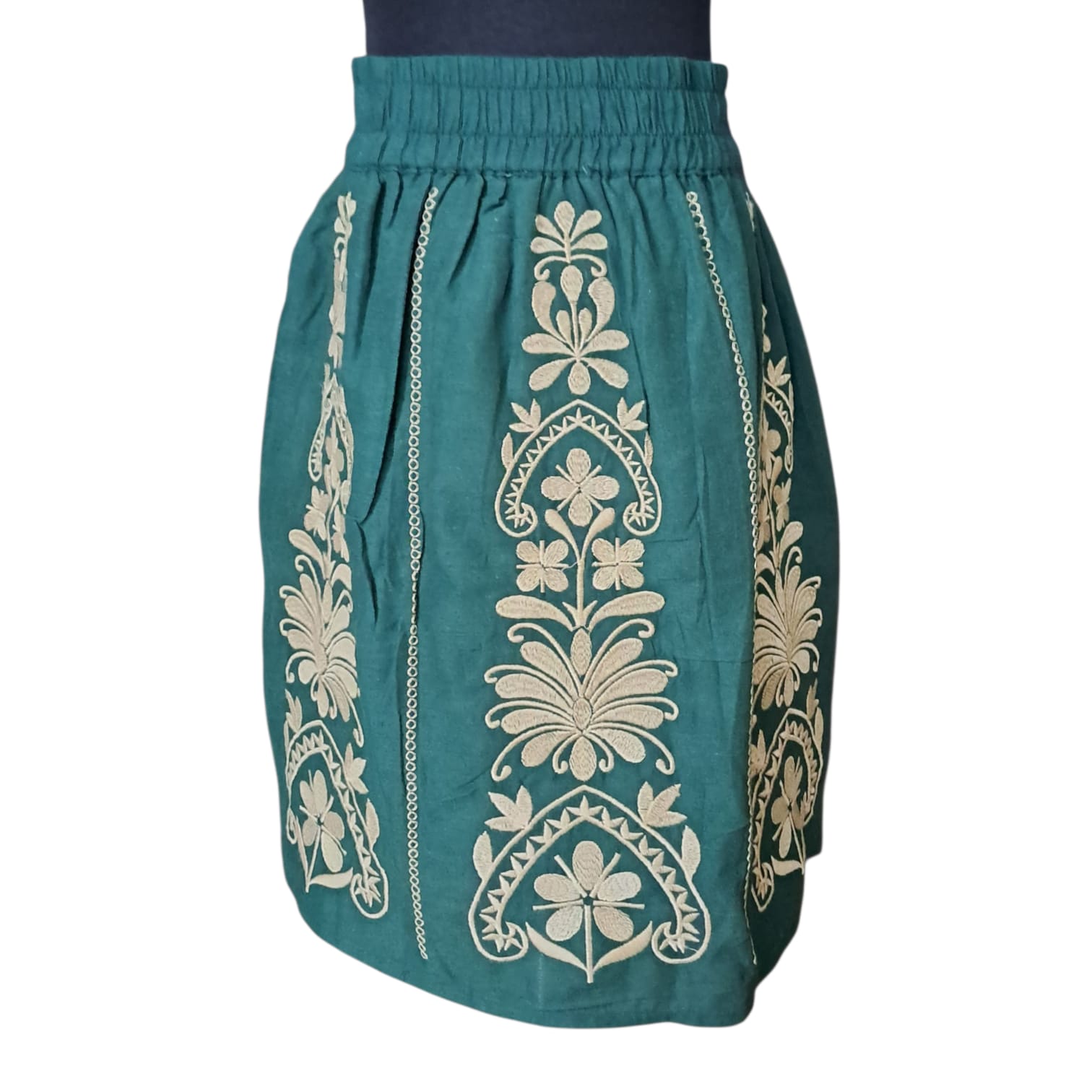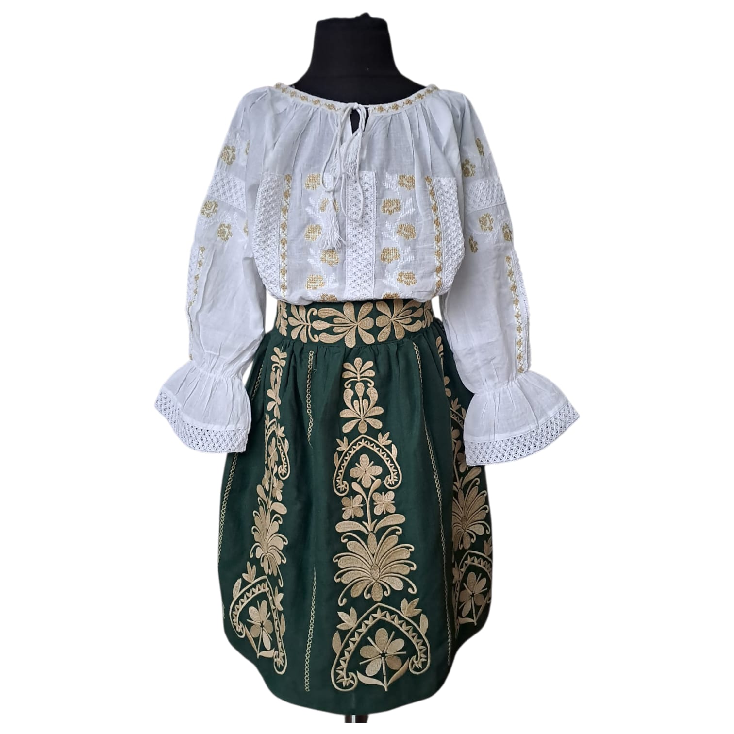 • Design Autentic: Fusta este brodată cu motive florale rafinate, identice atât în partea din față, cât și pe spate, asigurând un aspect unitar și detaliat.