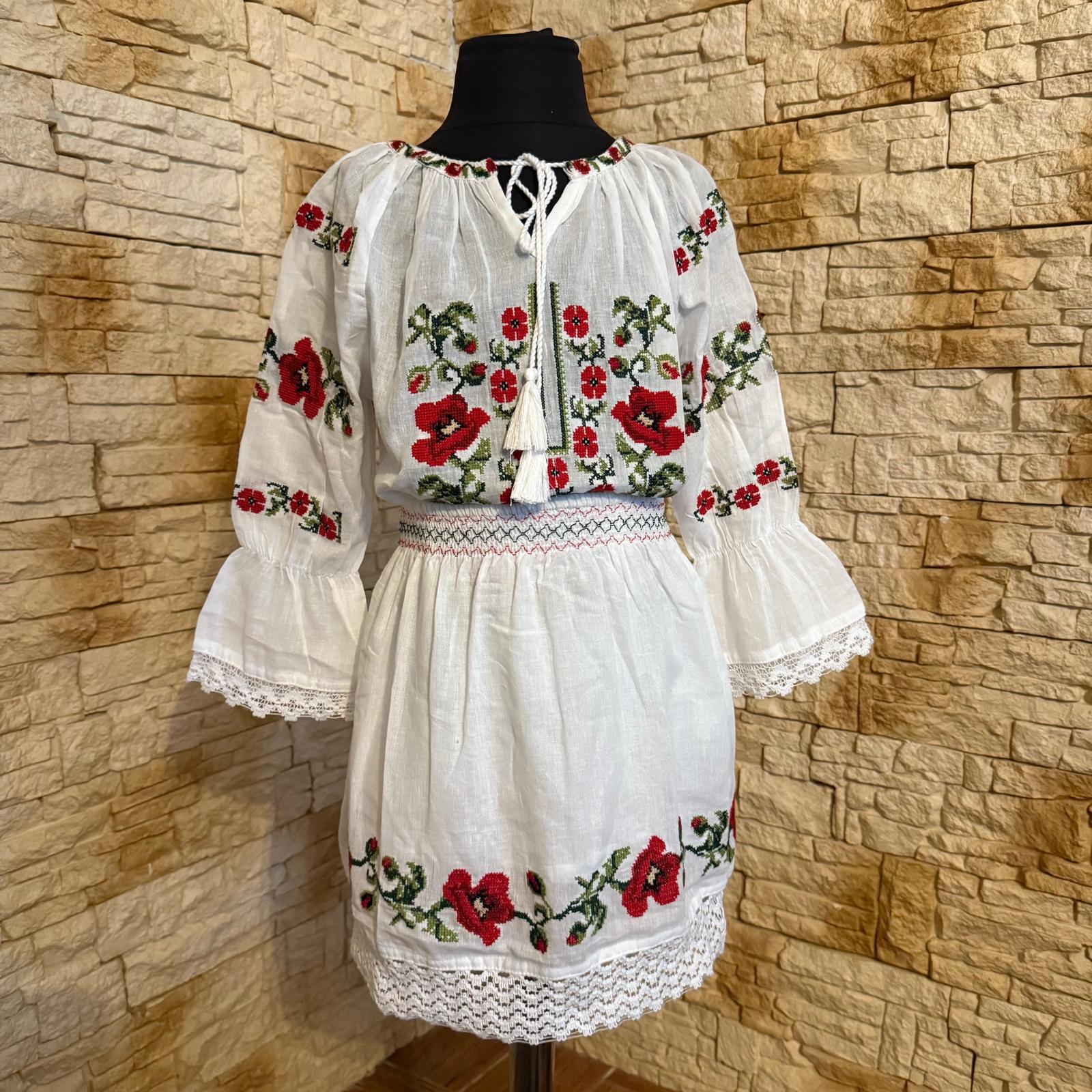 Set traditional 2 piese [ ie cu fusta] , brodat motiv floralcolorat. Ia  la maneci are volan si la gat are siret reglabil ca terminatie. Fusta in talie are elastic iar jos are terminatie cu dantela. Acesta este un set deosebit ce se poate purta la evenimente scolare culturale sau evenimente traditionale.