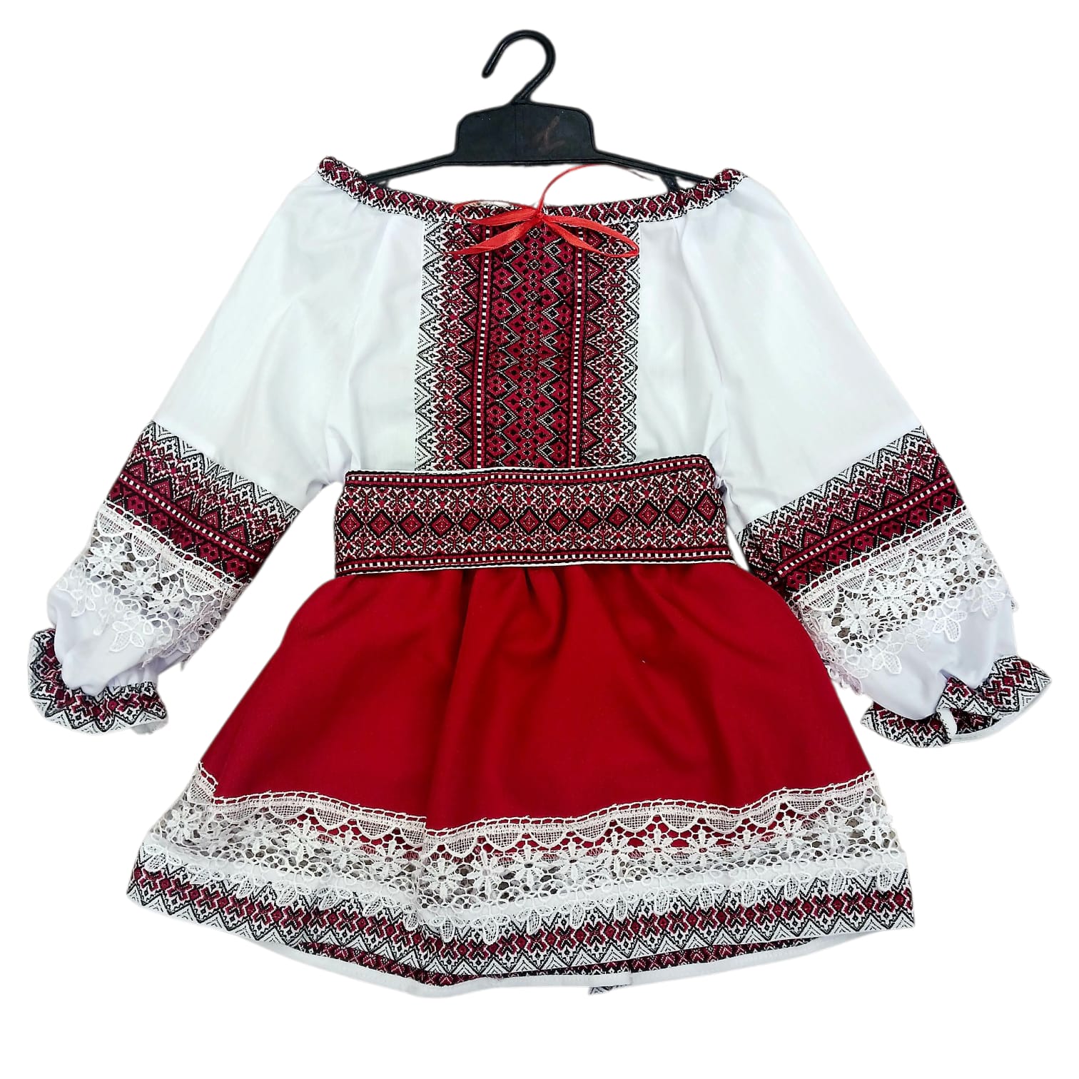 👗 Fustiță roșie elegantă, decorată cu dantelă și motive tradiționale aplicate care adaugă un farmec aparte.