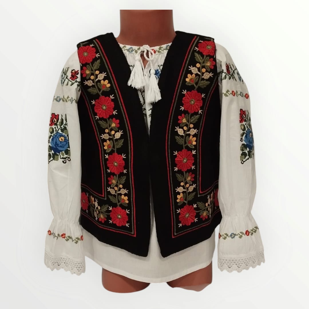 Vesta traditionala fetita fond negru, brodata cu motiv floral colorat. Material deosebit, stofa , captusita se aseaza si asorteaza usor. Se poarta cu mandrie la evenimente traditionale si culturale.
