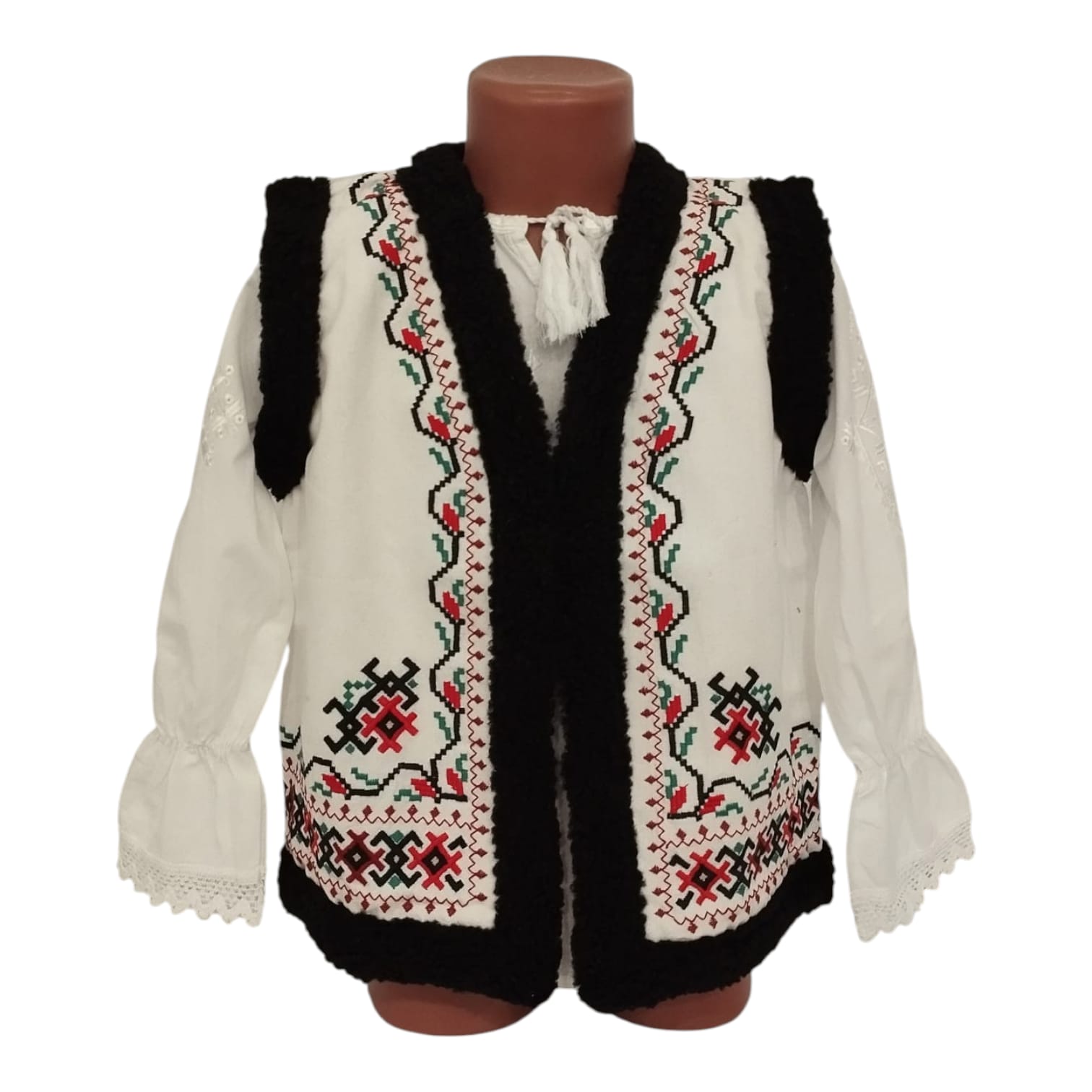 Vesta traditionala fetita fond alb, brodata cu motiv geometric si floral rosu cu negru. Material deosebit, in , captusita se aseaza si asorteaza usor. Ca terminatie are blanita. Se poarta cu mandrie la evenimente traditionale si culturale.