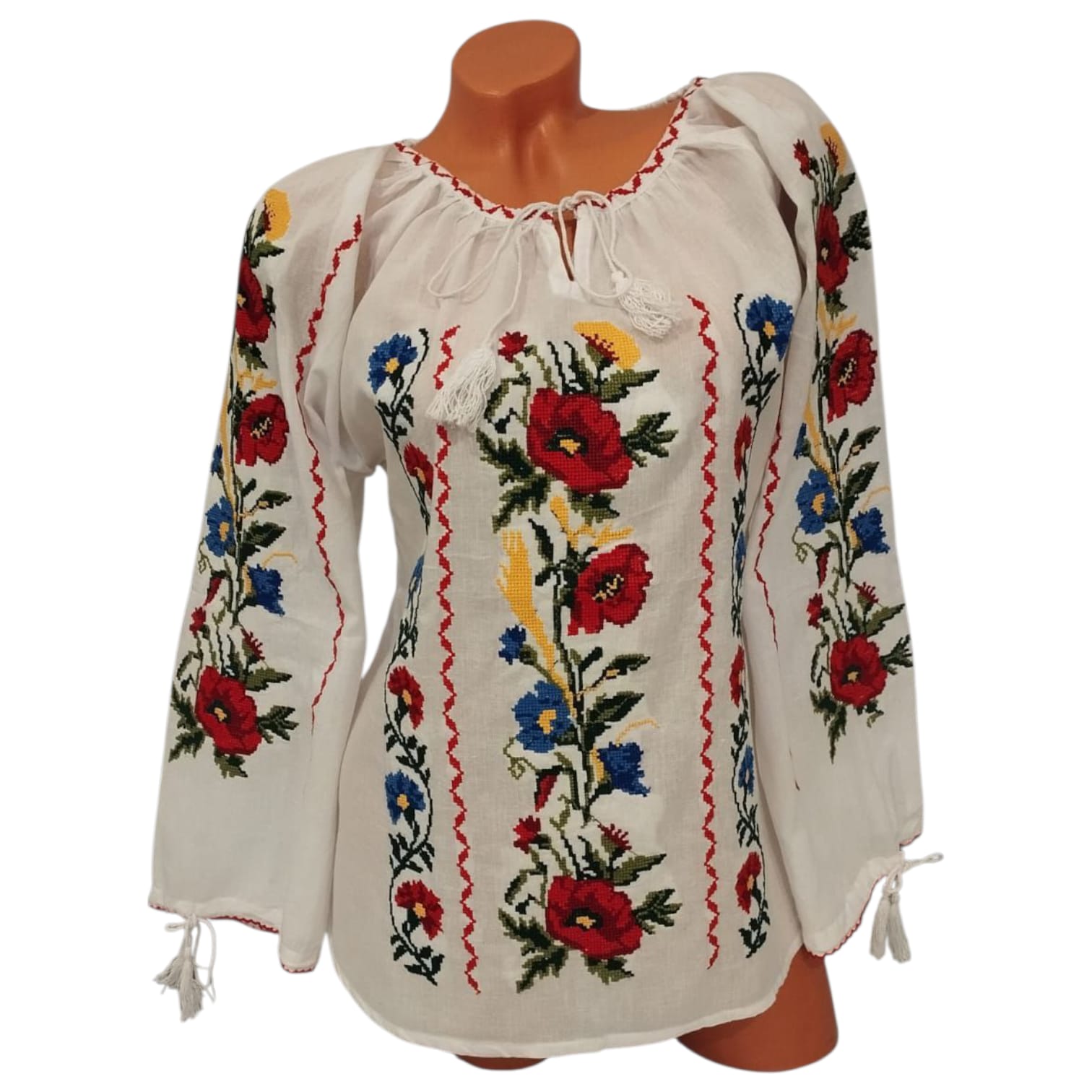 Ie fond alb brodata cu, ata colorata, motiv floral, ce reprezinta identitatea culturala si spirituala a purtatoarei. Aceasta este o piesa vestimentara ce se poarta in zona Bucovinei  dar si in alte zone ale tarii. Maneca are  terminatie cu siret reglabil. La gat are siret reglabil.