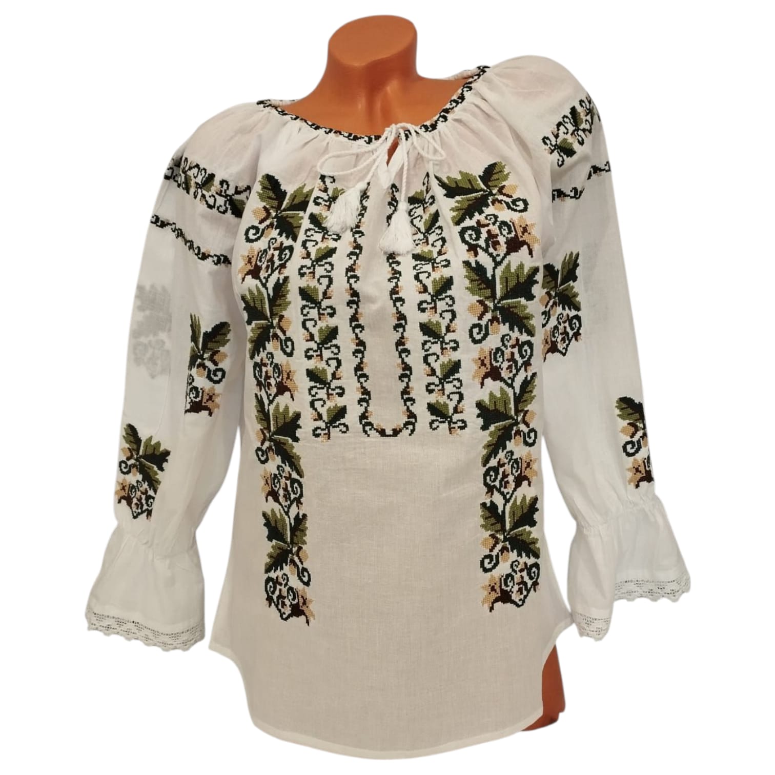 Ie fond alb brodata cu, ata colorata, motiv floral, ce reprezinta identitatea culturala si spirituala a purtatoarei. Aceasta este o piesa vestimentara ce se poarta in multe zone ale tarii. Maneca are terminatie cu volan si dantela. La gat are siret reglabil.