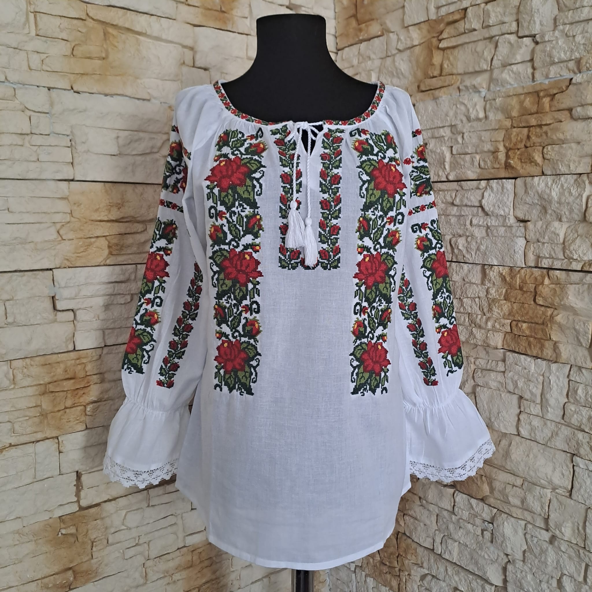 Ie fond alb brodata cu, ata colorata, motiv floral, ce reprezinta identitatea culturala si spirituala a purtatoarei. Aceasta este o piesa vestimentara ce se poarta in multe zone ale tarii. Maneca are terminatie cu volan si dantela. La gat are siret reglabil.