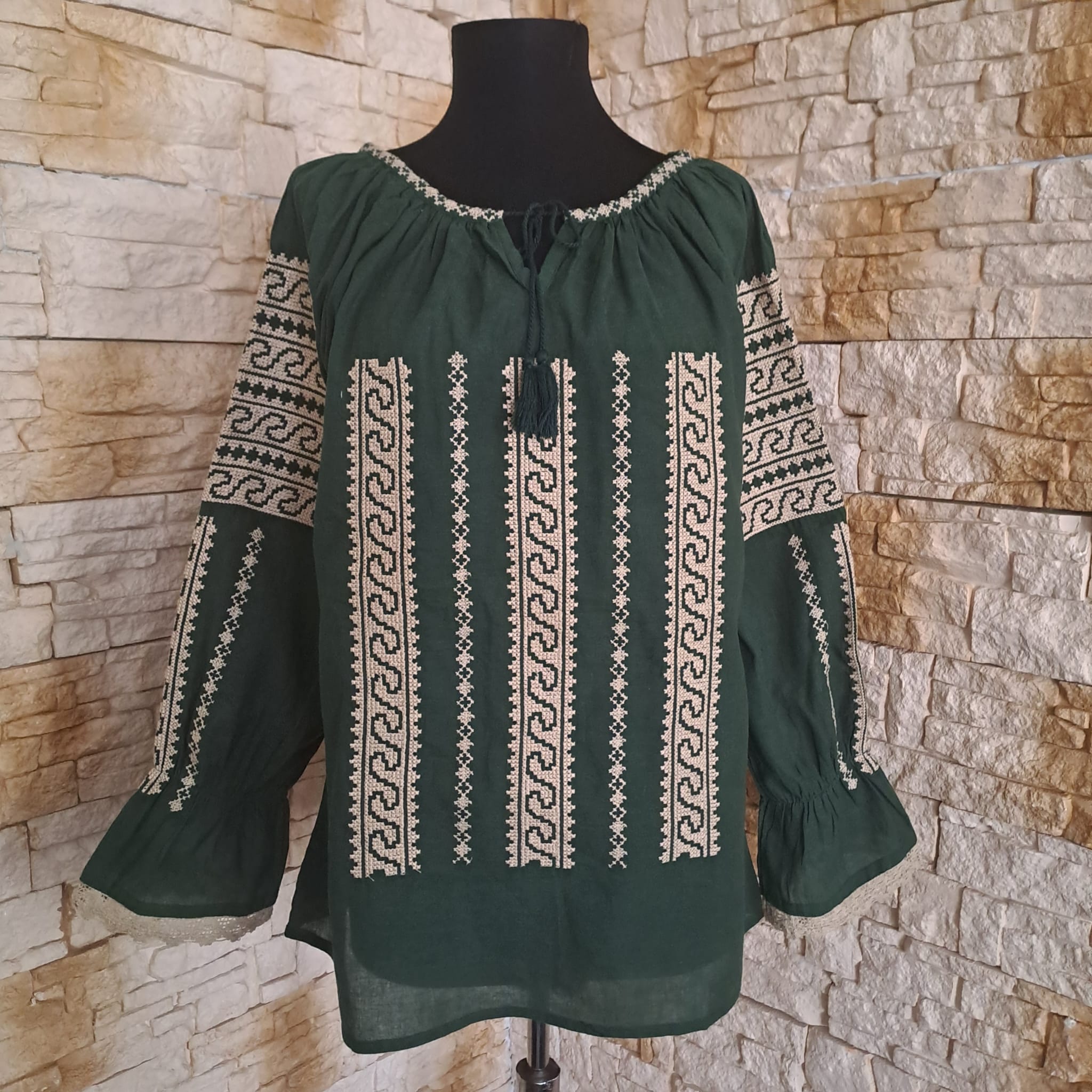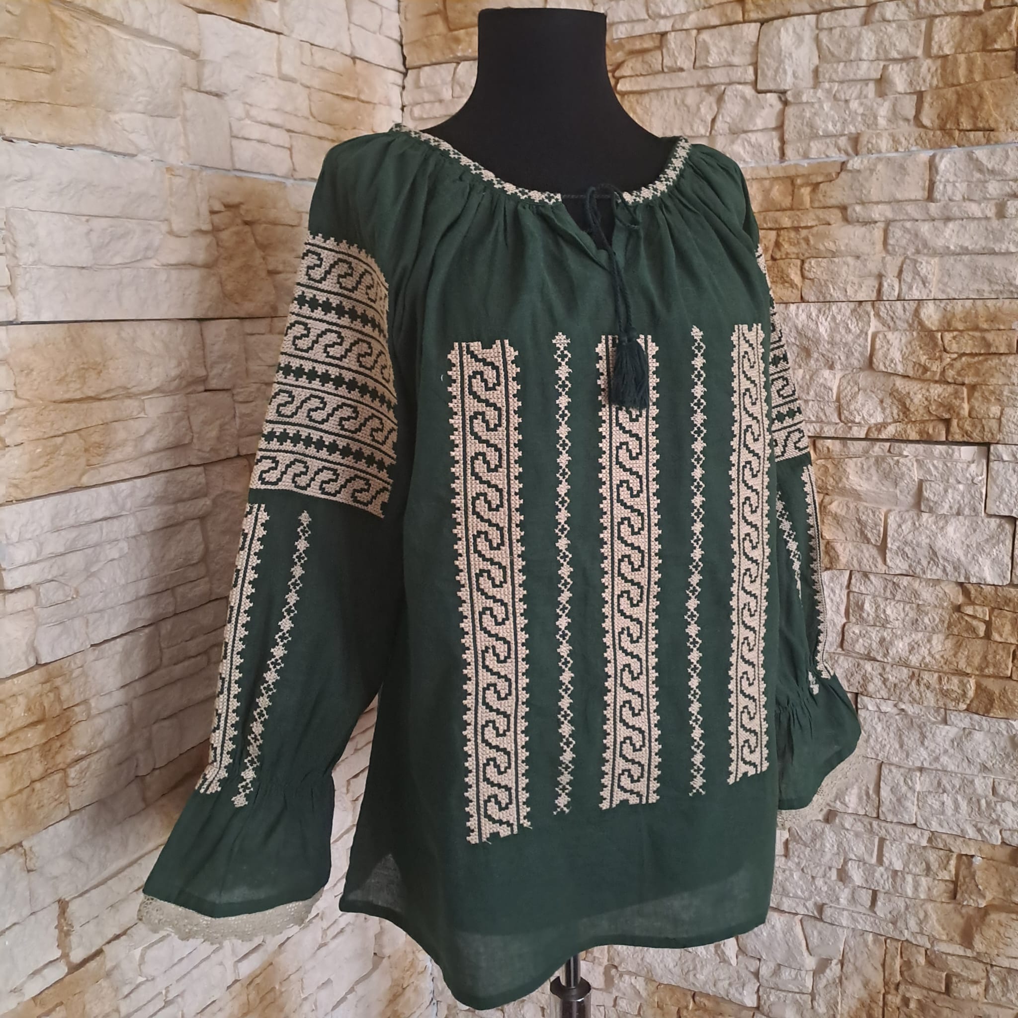 Ie fond verde brodata cu, ata bej, motiv geometric, ce reprezinta identitatea culturala si spirituala a purtatoarei. Aceasta este o piesa vestimentara ce se poarta in multe zone ale tarii. Maneca are terminatie cu volan si dantela. La gat are siret reglabil.