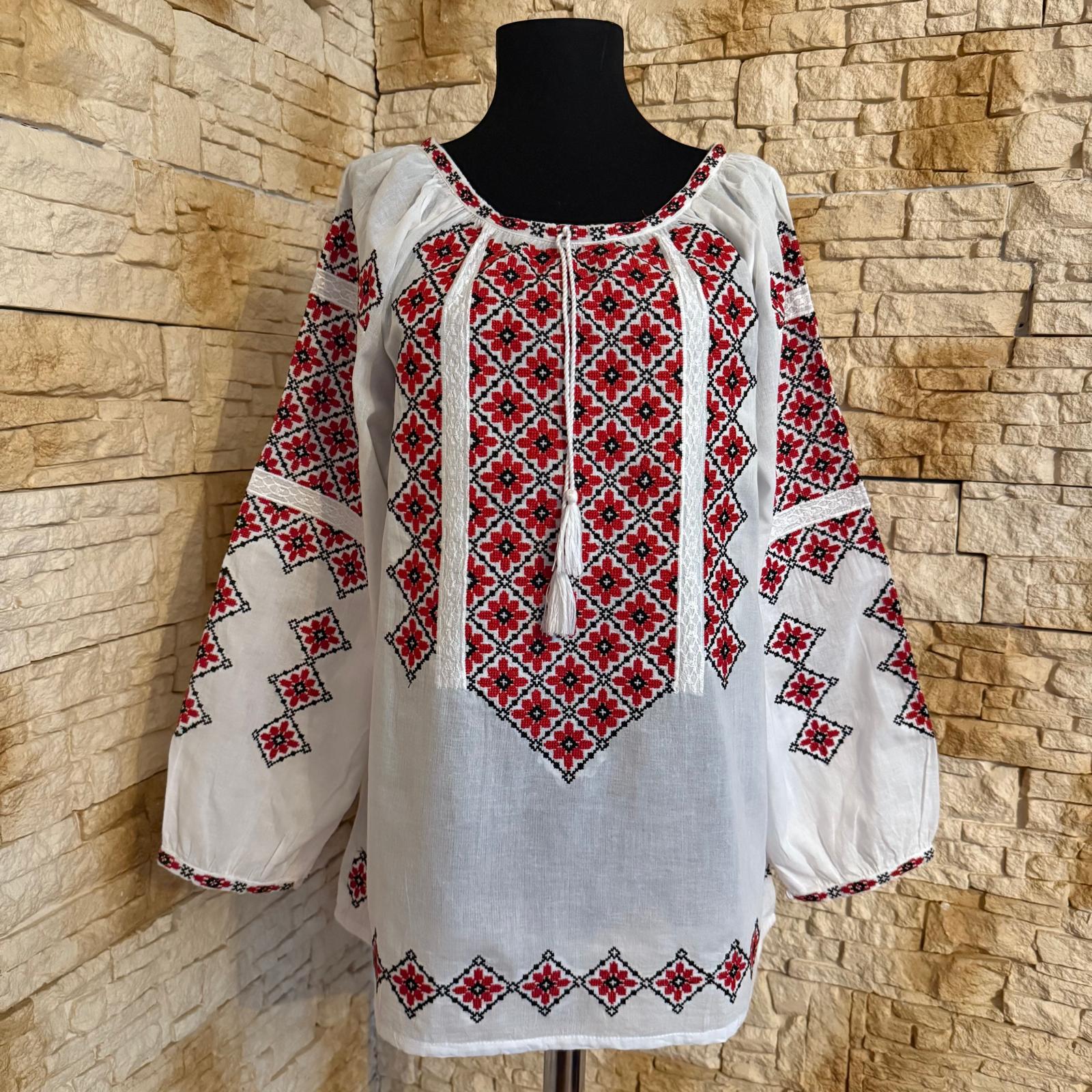 Ie traditionala fond alb brodata cu motive geometrice, ce reprezinta identitatea culturala si spirituala a purtatoarei. Aceasta este o piesa vestimentara ce poate fi purtata cu mandrie. Are maneca cu manseta ca terminatie. Culori folosite la broderie negru si rosu.