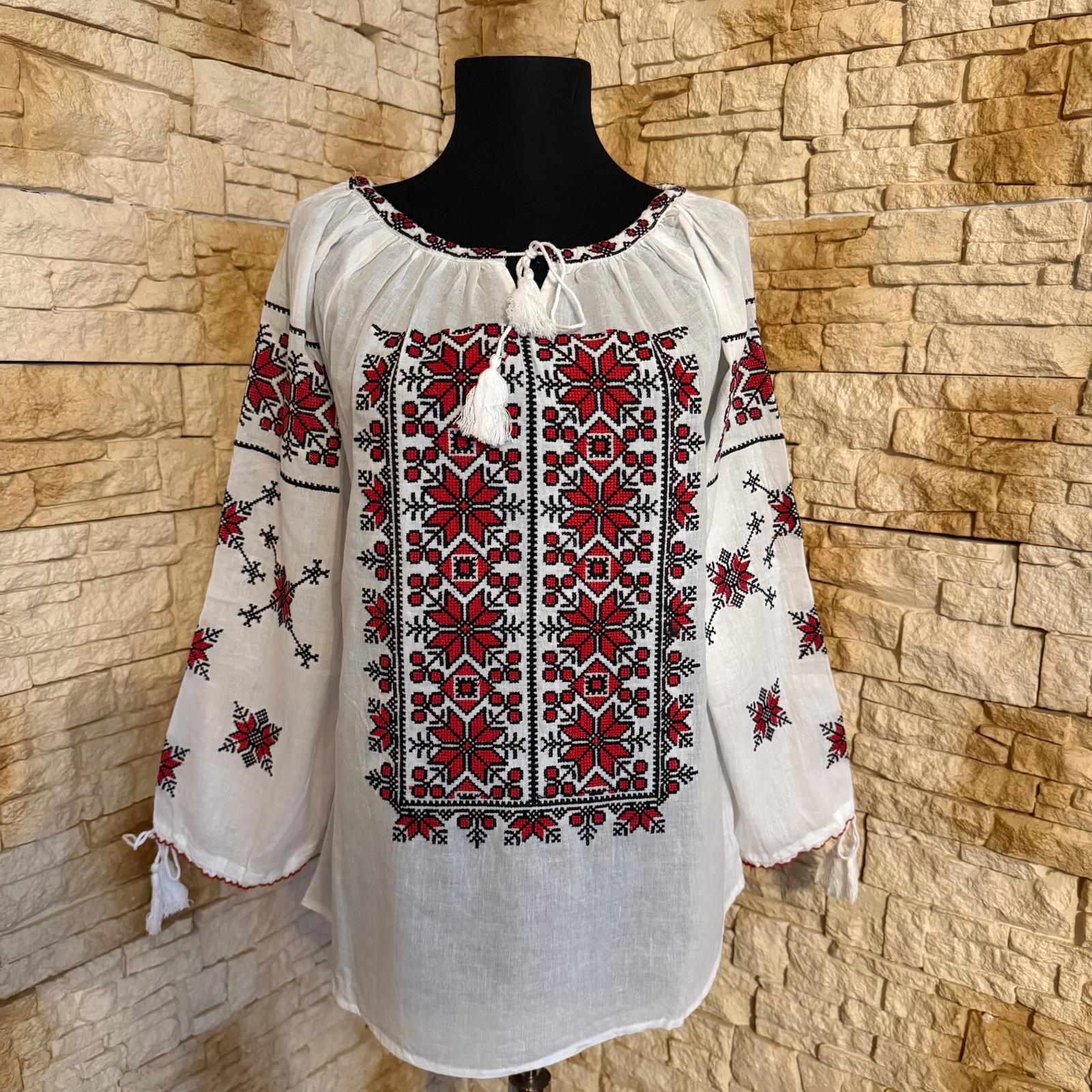 Ie traditionala fond alb brodata cu motive geometrice rosu cu negru, ce reprezinta identitatea culturala si spirituala a purtatoarei. Aceasta este o piesa vestimentara ce poate fi purtata cu mandrie. Are maneca cu siret reglabil ca terminatie.