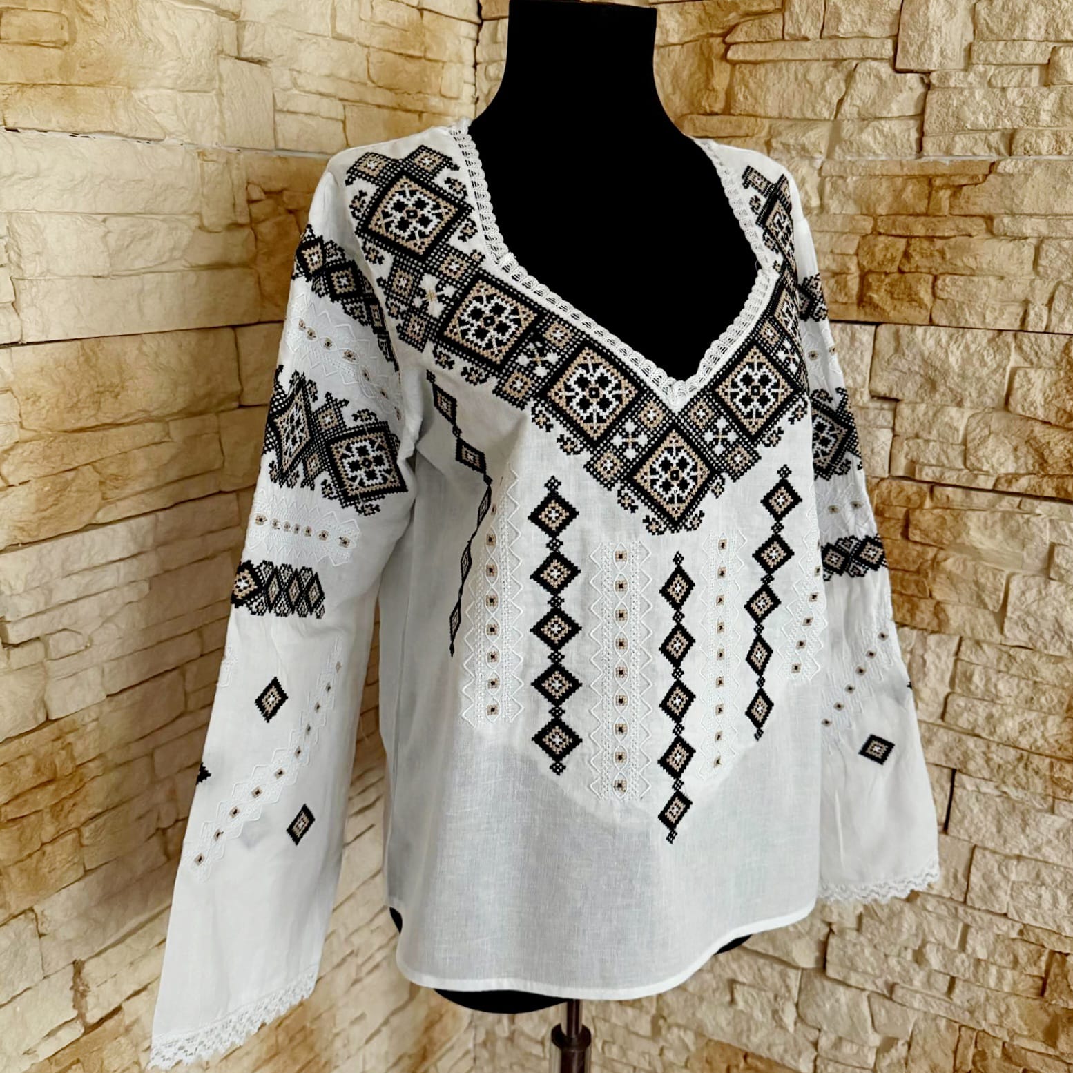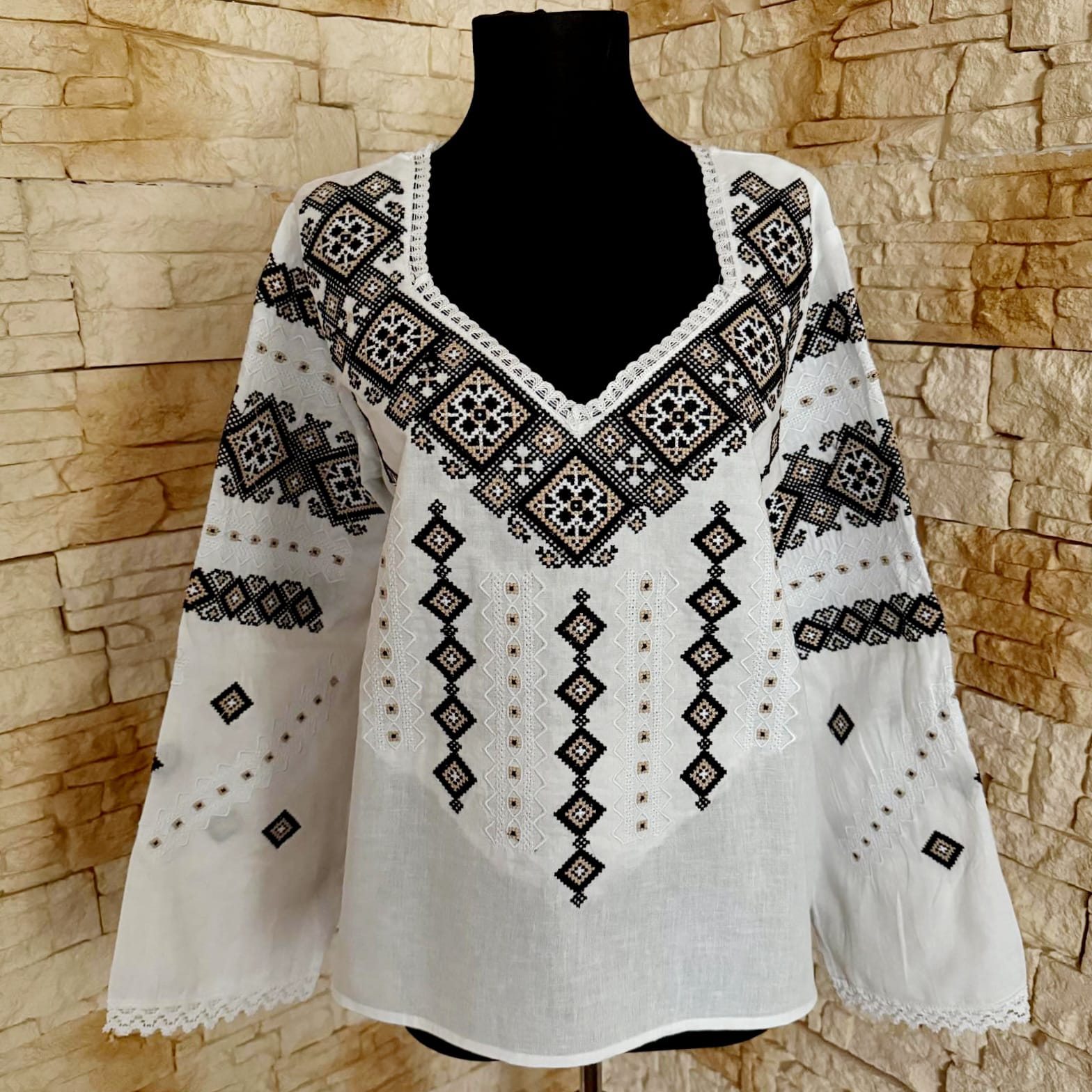 Ie traditionala fond alb brodata cu motive geometrice, ce reprezinta identitatea culturala si spirituala a purtatoarei. Aceasta este o piesa vestimentara ce poate fi purtata cu mandrie. Are maneca cu dantela ca terminatie. Culori folosite la broderie negru, bej si alb.