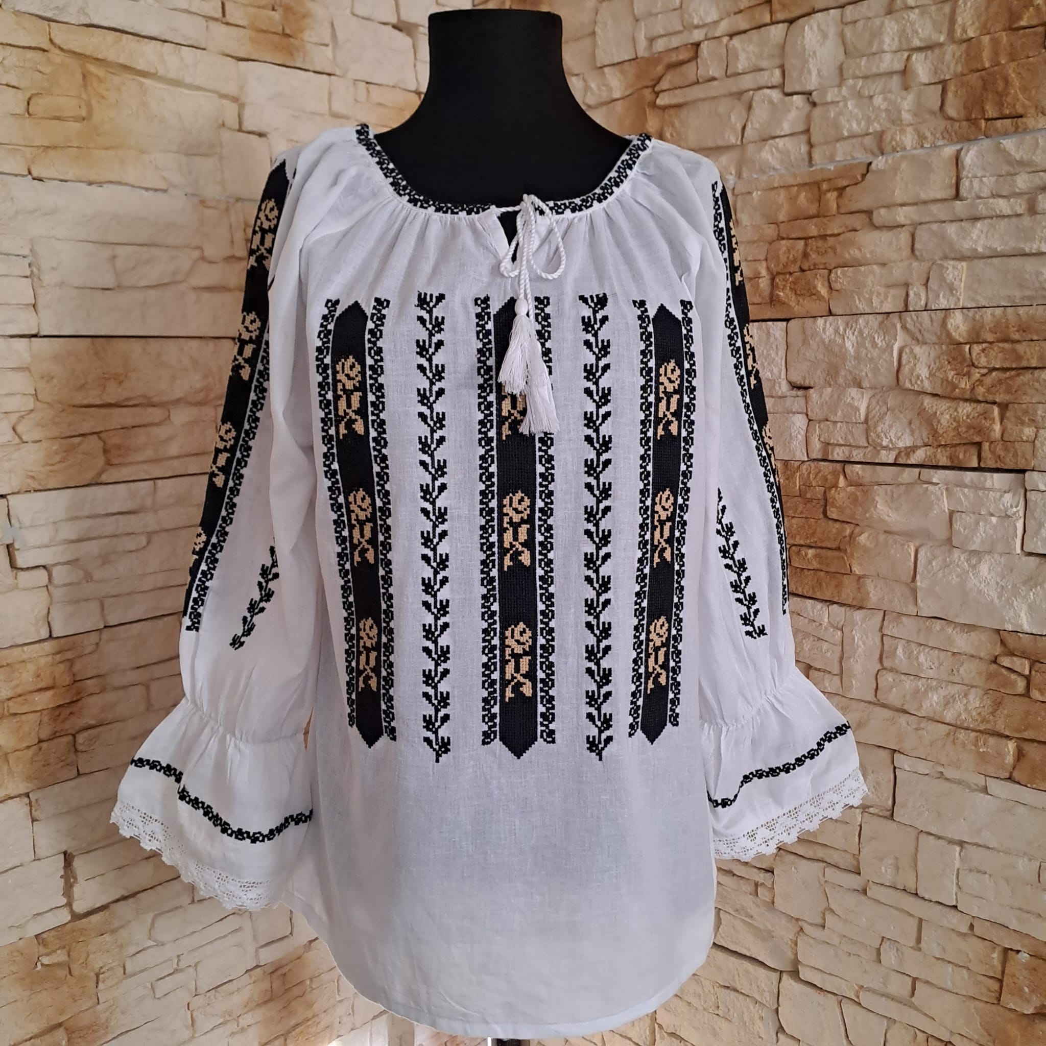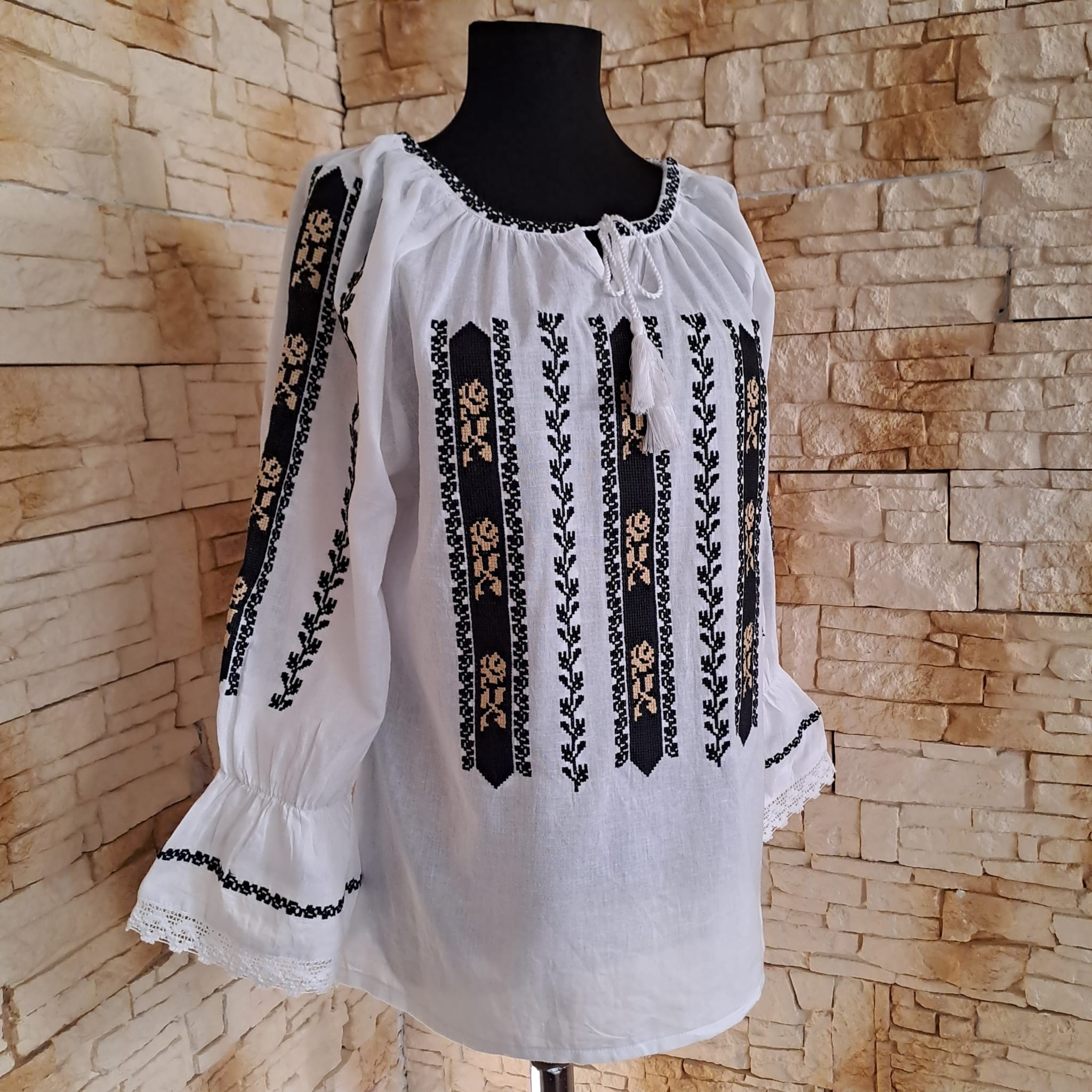 Ie traditionala fond alb brodata cu ata neagra si bej motive geometrice, ce reprezinta identitatea culturala si spirituala a purtatoarei. Aceasta este o piesa vestimentara ce poate fi purtata cu mandrie. Are maneca cu volan ca terminatie iar la gat are siret reglabil.
