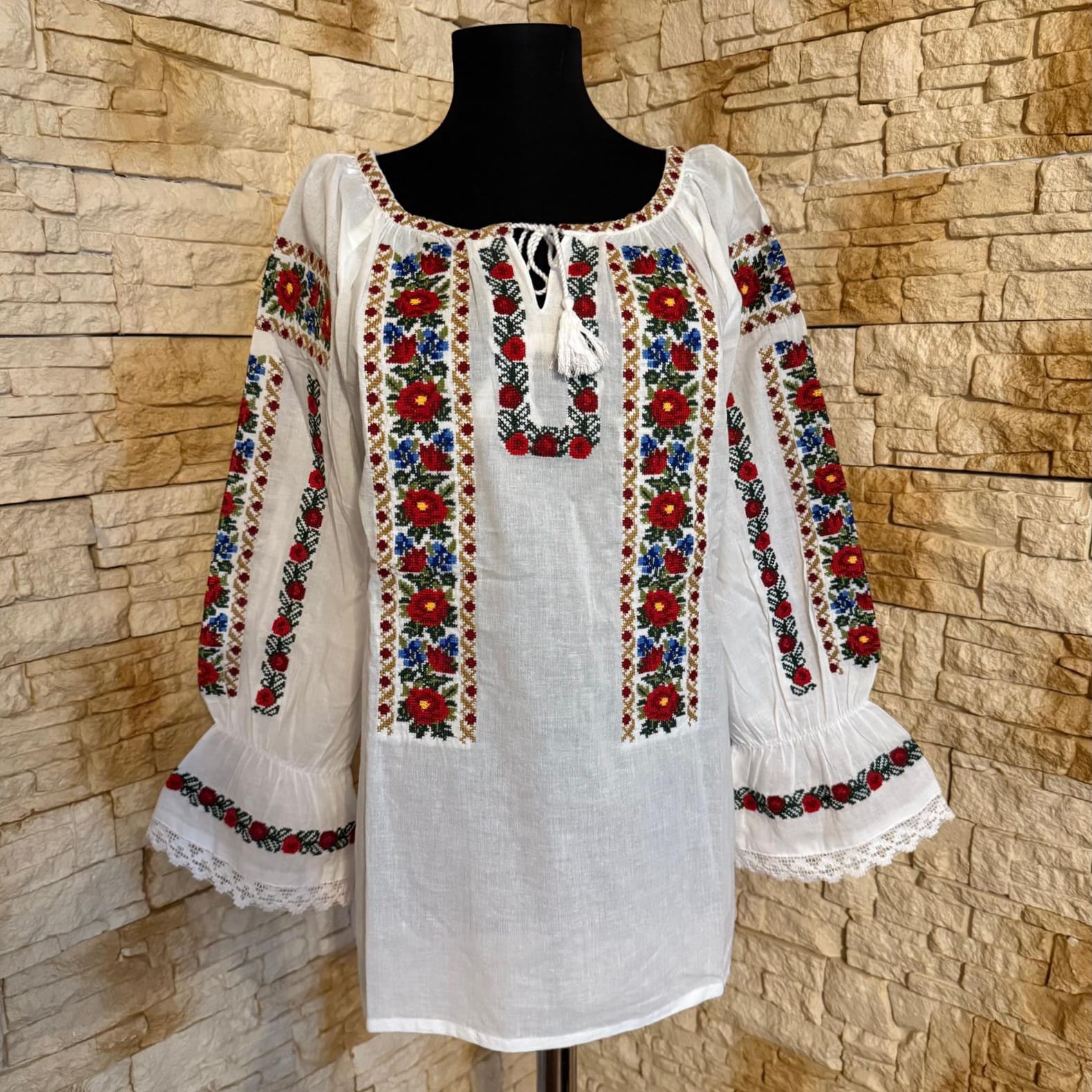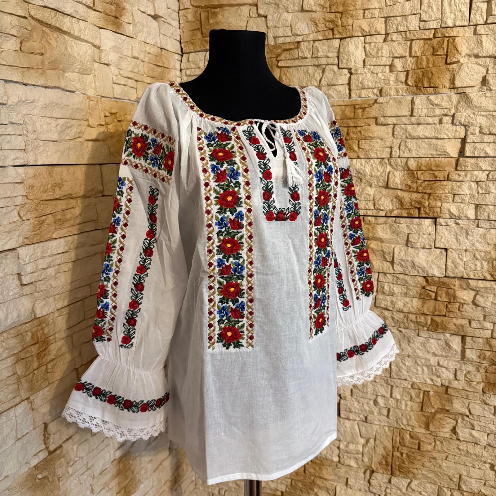 Ie traditionala fond alb brodata cu ata colorata, motive florale, ce reprezinta identitatea culturala si spirituala a purtatoarei. Aceasta este o piesa vestimentara ce poate fi purtata cu mandrie. Are maneca cu volan si dantela ca terminatie.