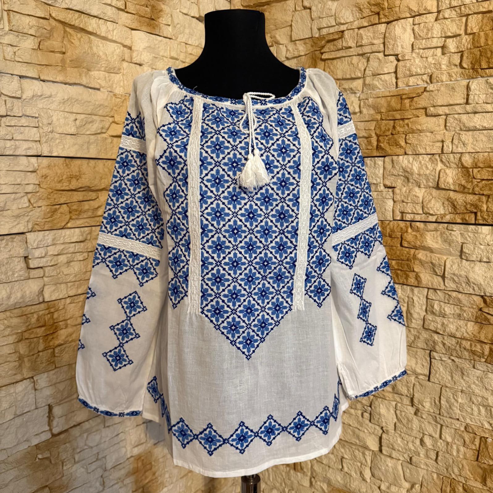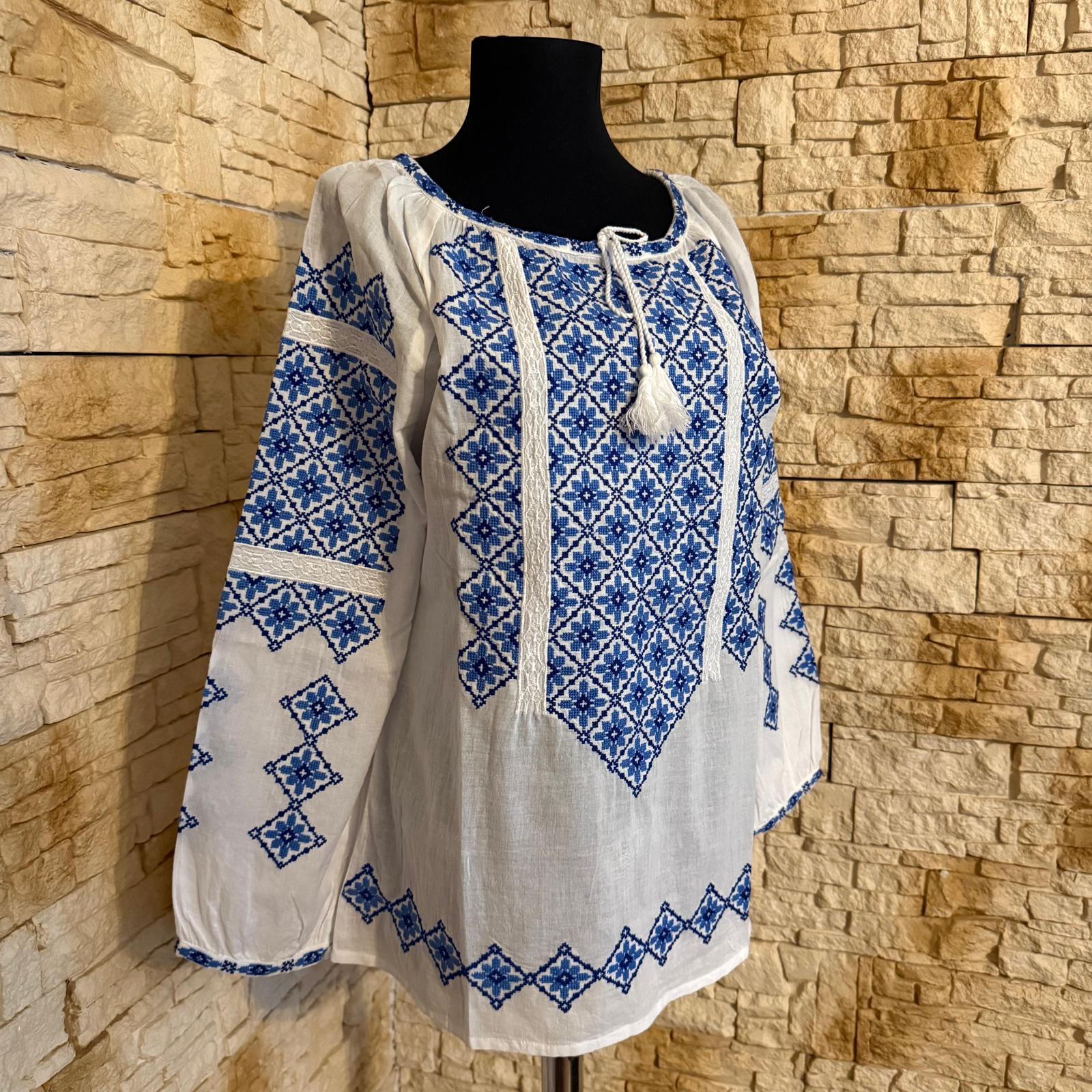Ie traditionala fond alb brodata cu ata albastra, motive geometrice, ce reprezinta identitatea culturala si spirituala a purtatoarei. Aceasta este o piesa vestimentara ce poate fi purtata cu mandrie. Are maneca cu manseta ca terminatie.