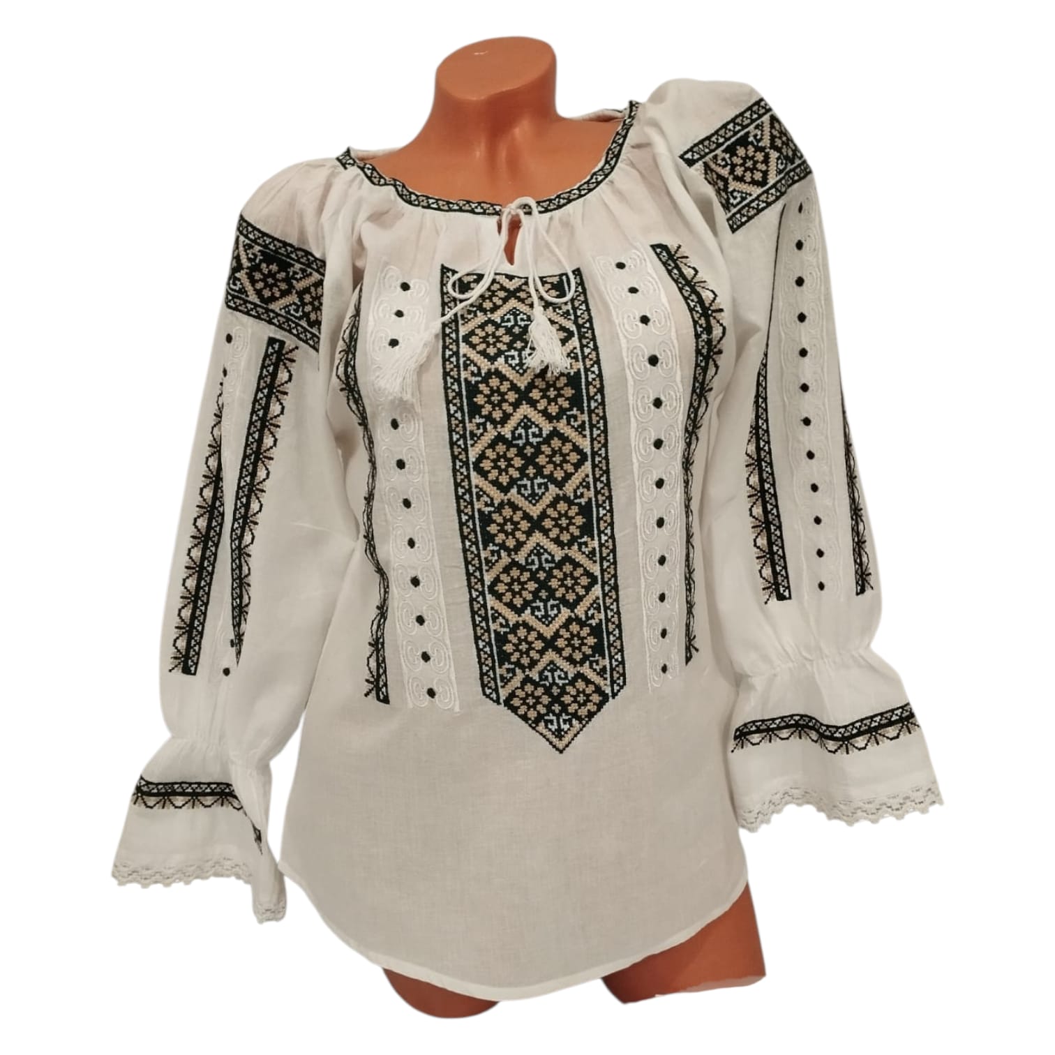 Ie traditionala fond alb brodata cu ata verde cu bej motive geometrice, ce reprezinta identitatea culturala si spirituala a purtatoarei. Aceasta este o piesa vestimentara ce poate fi purtata cu mandrie. Are maneca cu volan ca terminatie iar la gat are siret reglabil.