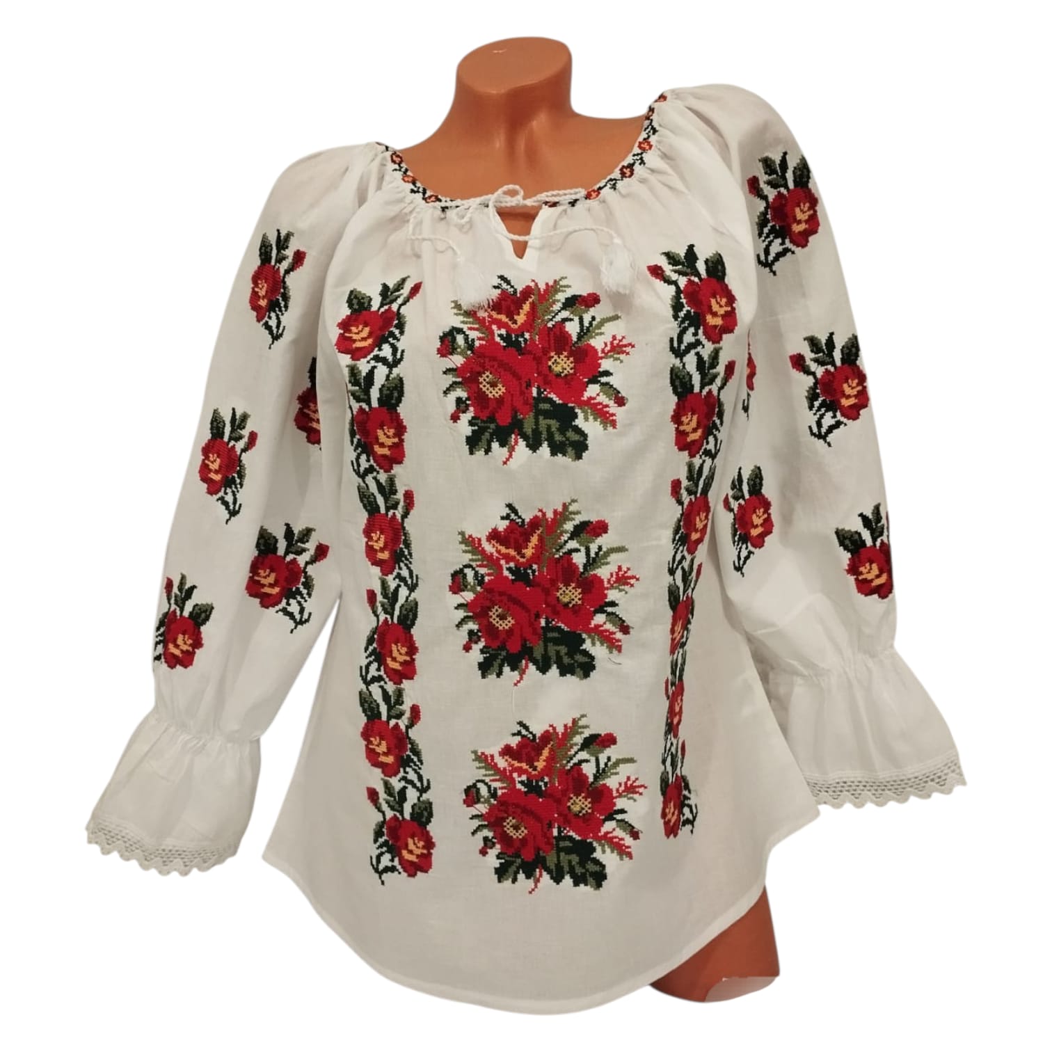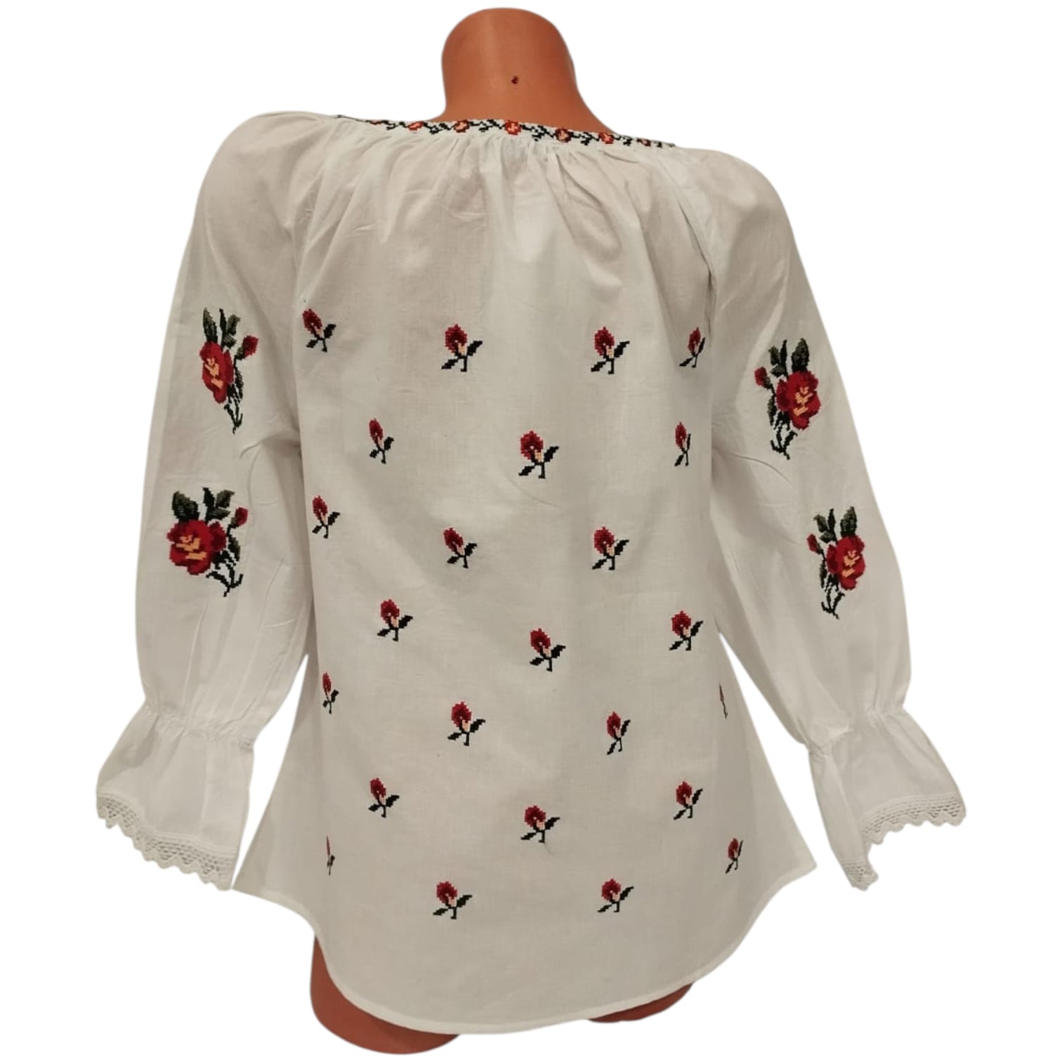 Ie traditionala fond alb brodata cu ata colorata motive florale, ce reprezinta identitatea culturala si spirituala a purtatoarei. Pe partea din spate este brodata cu floricele mici. Aceasta este o piesa vestimentara ce poate fi purtata cu mandrie. Are maneca cu volan si dantela ca terminatie iar la gat are tot siret reglabil.