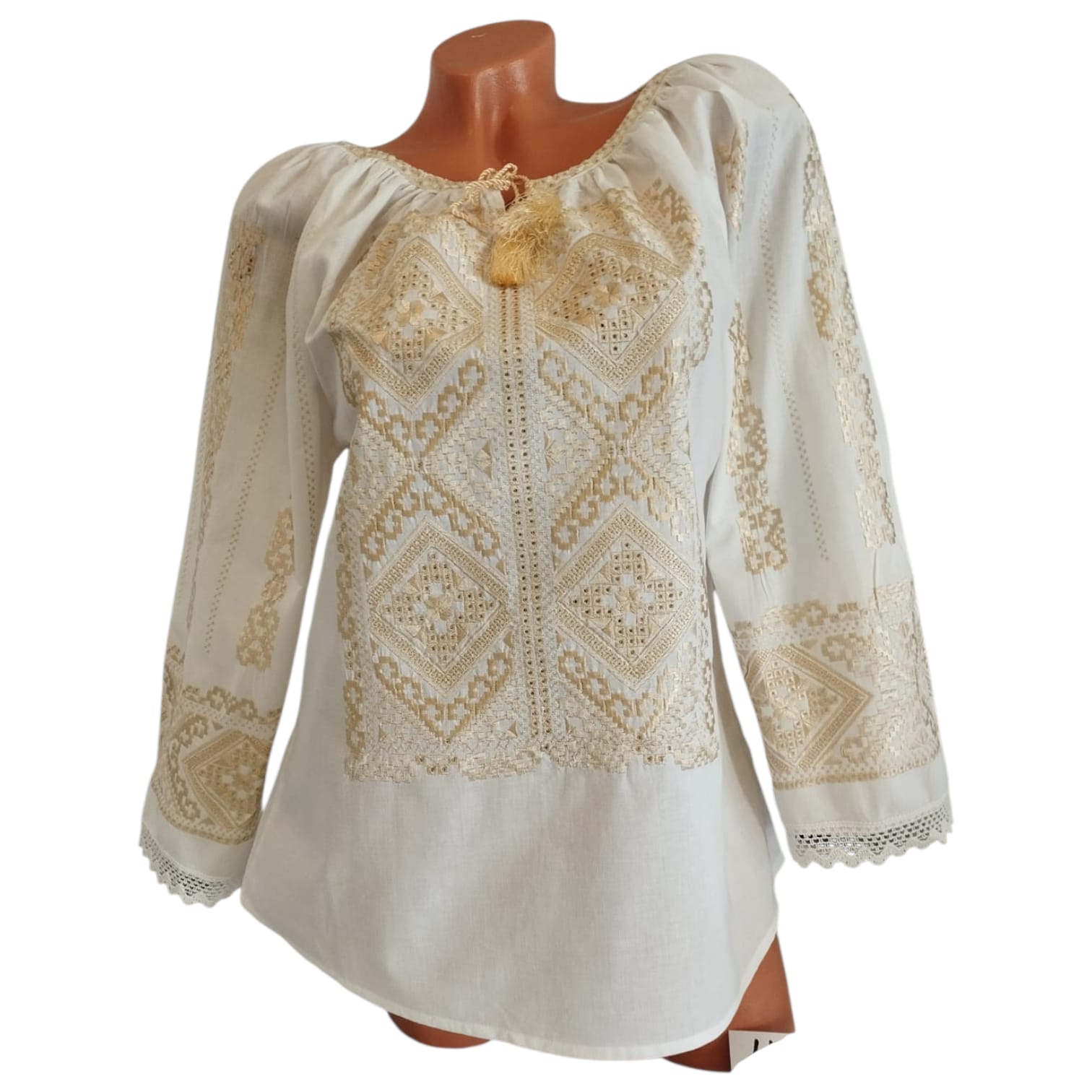 Ie traditionala fond alb brodata cu ata din matase bej motive geometrice, ce reprezinta identitatea culturala si spirituala a purtatoarei. Aceasta este o piesa vestimentara ce poate fi purtata cu mandrie. Are maneca dreapta cu dantela ca terminatie.