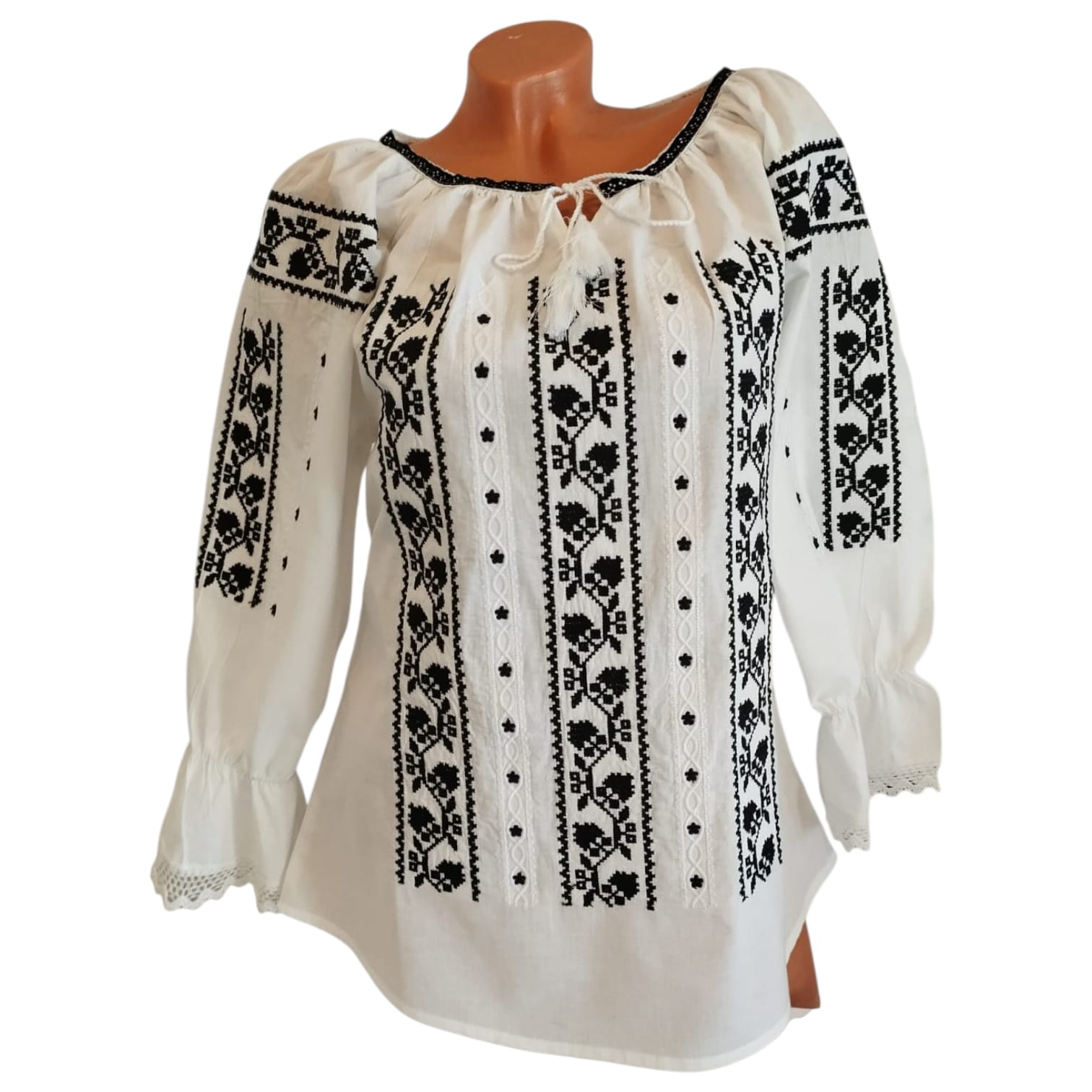 Ie traditionala fond alb brodata cu motive florale, ce reprezinta identitatea culturala si spirituala a purtatoarei. Aceasta este o piesa vestimentara ce poate fi purtata cu mandrie. Are maneca cu volan si terminatie cu dantela. Culori folosite , negru si alb.
