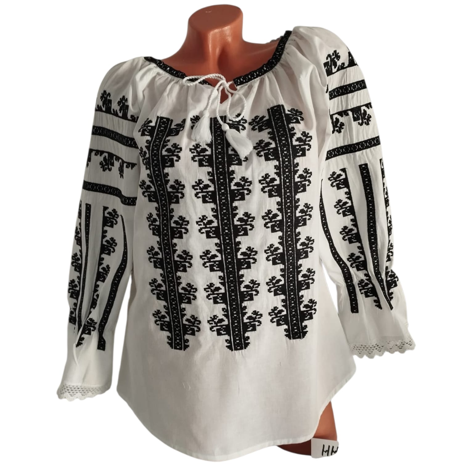Ie traditionala fond alb brodata cu ata neagra motive geometrice, ce reprezinta identitatea culturala si spirituala a purtatoarei. Aceasta este o piesa vestimentara ce poate fi purtata cu mandrie. Are maneca cu volan si terminatie cu dantela.