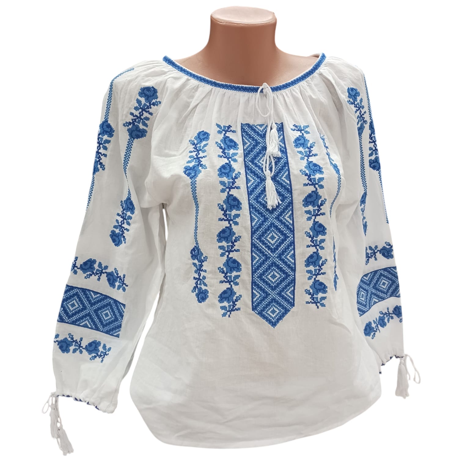 Ie traditionala fond alb brodata cu ata albastra, motive florale si geometrice, ce reprezinta identitatea culturala si spirituala a purtatoarei. Aceasta este o piesa vestimentara ce poate fi purtata cu mandrie. Are maneca cu siret reglabil ca terminatie.