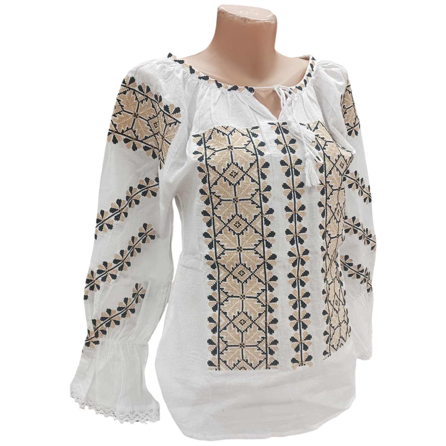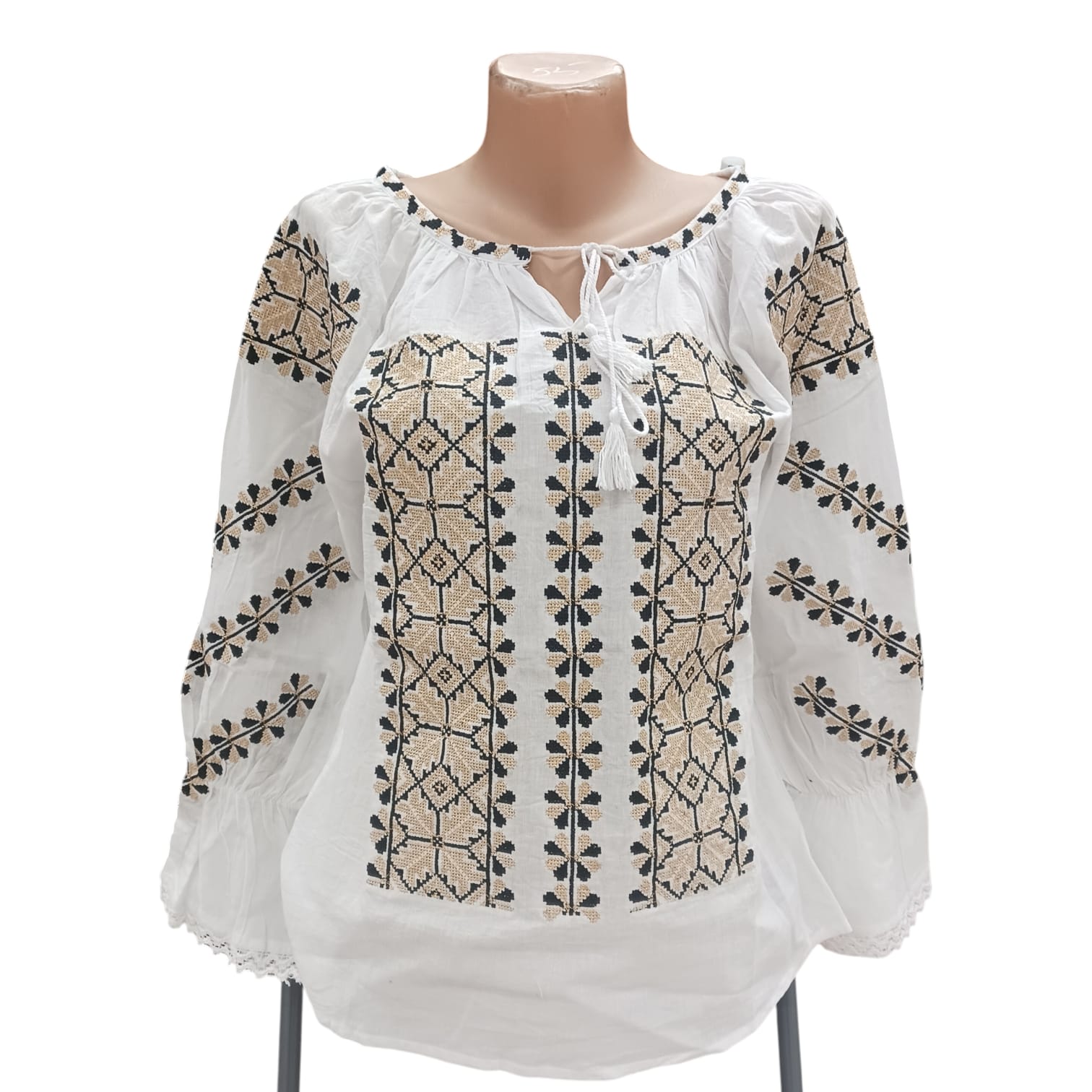 Ie traditionala fond alb brodata cu ata neagra si bej motive geometrice, ce reprezinta identitatea culturala si spirituala a purtatoarei. Aceasta este o piesa vestimentara ce poate fi purtata cu mandrie. Are maneca cu volan ca terminatie iar la gat are siret reglabil.