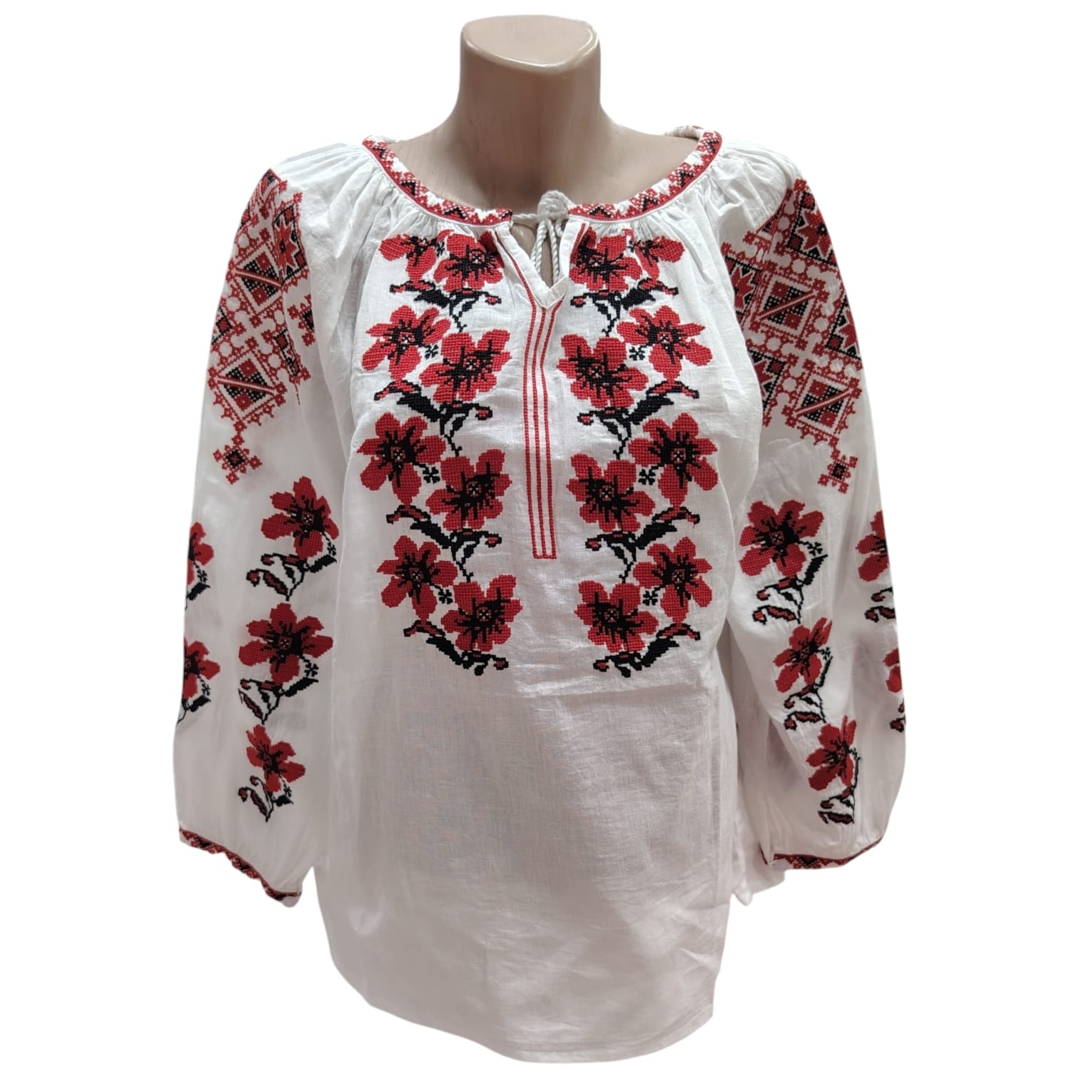 Ie traditionala fond alb brodata cu ata neagra si rosie motive geometrice si florale, ce reprezinta identitatea culturala si spirituala a purtatoarei. Aceasta este o piesa vestimentara ce poate fi purtata cu mandrie. Are maneca cu manseta ca terminatie iar la gat are siret reglabil.