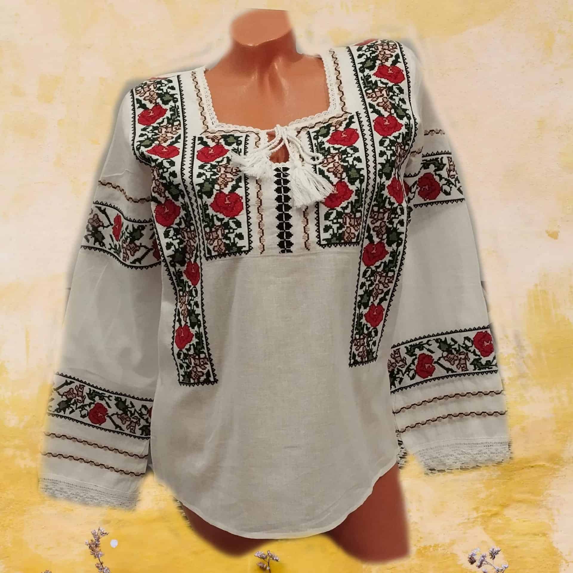 Ie traditionala fond alb brodata cu ata colorata, motive floral, ce reprezinta identitatea culturala si spirituala a purtatoarei. Aceasta este o piesa vestimentara ce poate fi purtata cu mandrie. Are maneca cu volan si dantela ca terminatie.