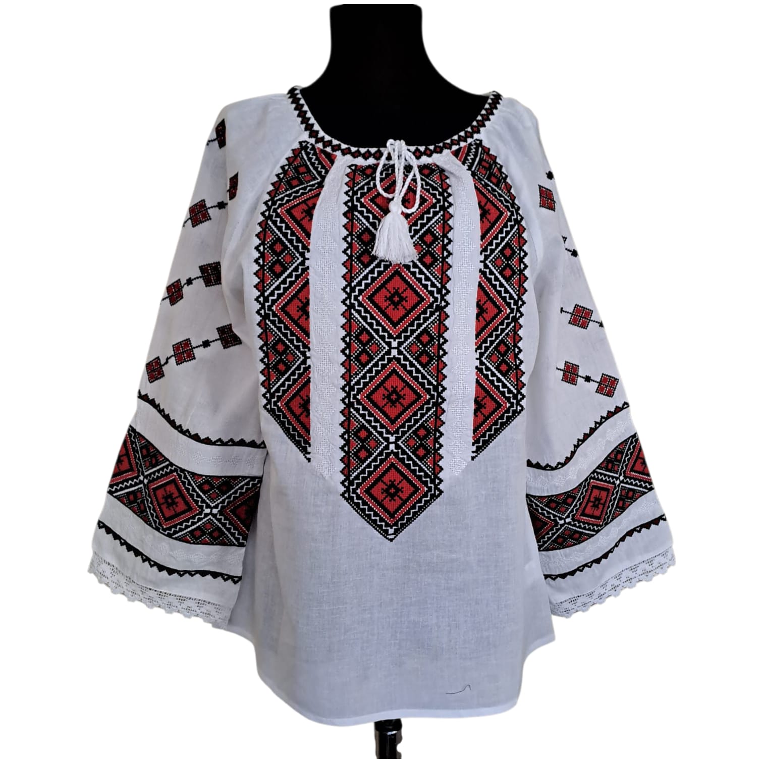 Ie traditionala fond alb brodata cu ata neagra si rosie motive geometrice, ce reprezinta identitatea culturala si spirituala a purtatoarei. Aceasta este o piesa vestimentara ce poate fi purtata cu mandrie. Are maneca dreapta cu dantela ca terminatie iar la gat are siret reglabil.