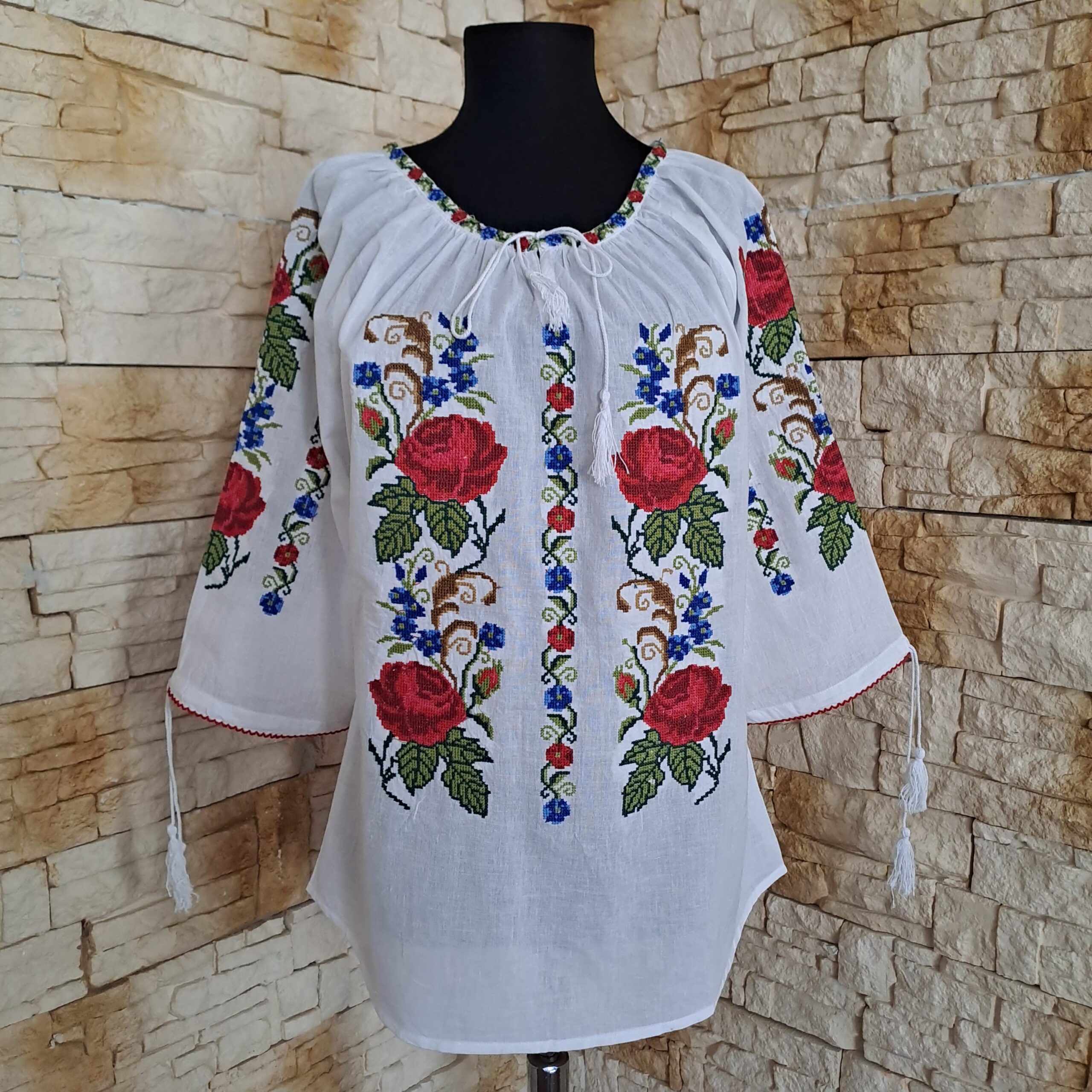 Ie traditionala fond alb brodata cu motive florale colorate, ce reprezinta identitatea culturala si spirituala a purtatoarei. Aceasta este o piesa vestimentara ce poate fi purtata cu mandrie. Are maneca cu siret reglabil ca terminatie .