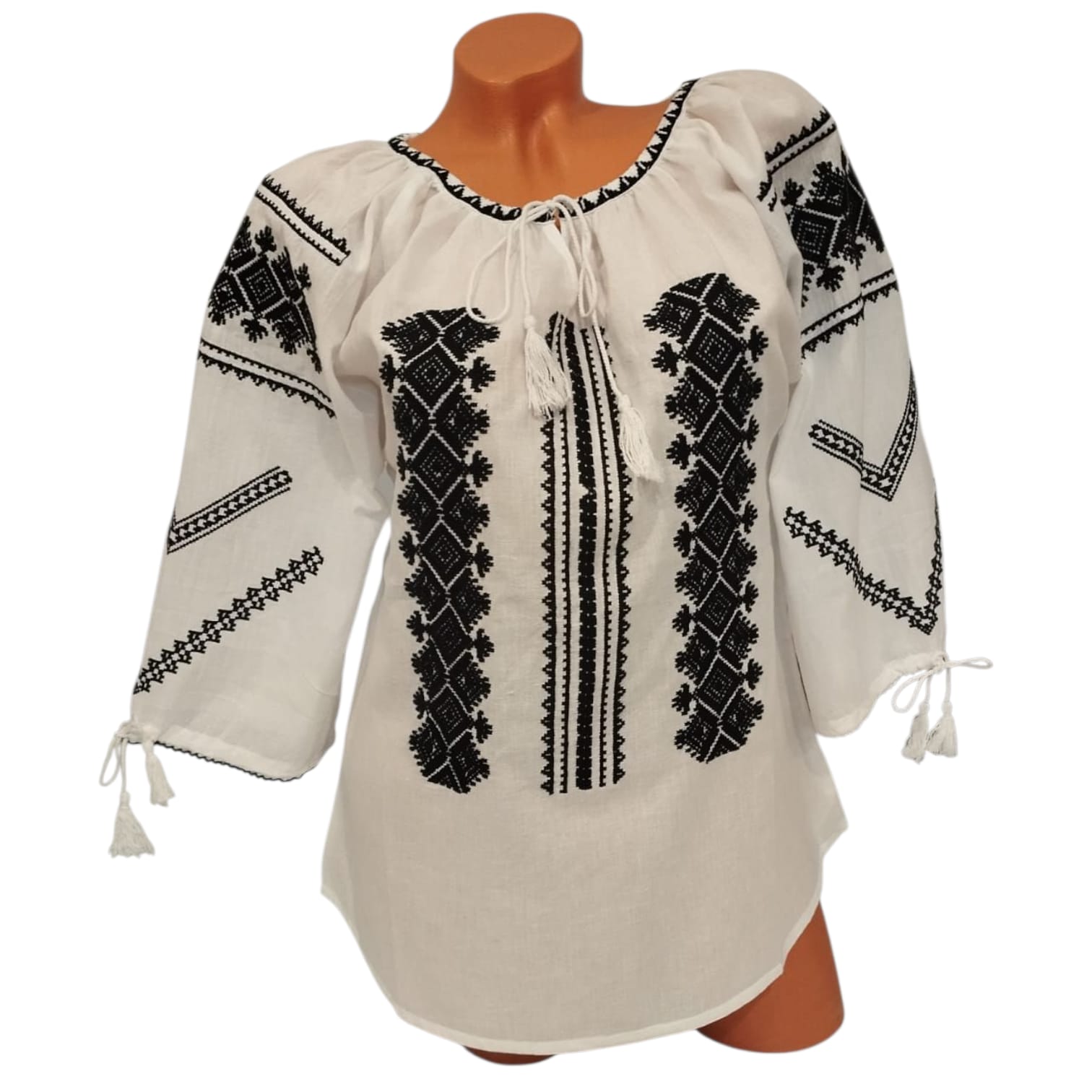 Ie traditionala fond alb brodata cu motive geometric ,ce reprezinta identitatea spirituala a purtatoarei. Aceasta este o piesa vestimentara ce poate fi purtata in diferite zone ale tarii . Ia are maneca 3/4 cu siret reglabil ca terminatie . Ia este brodata cu ata neagra.