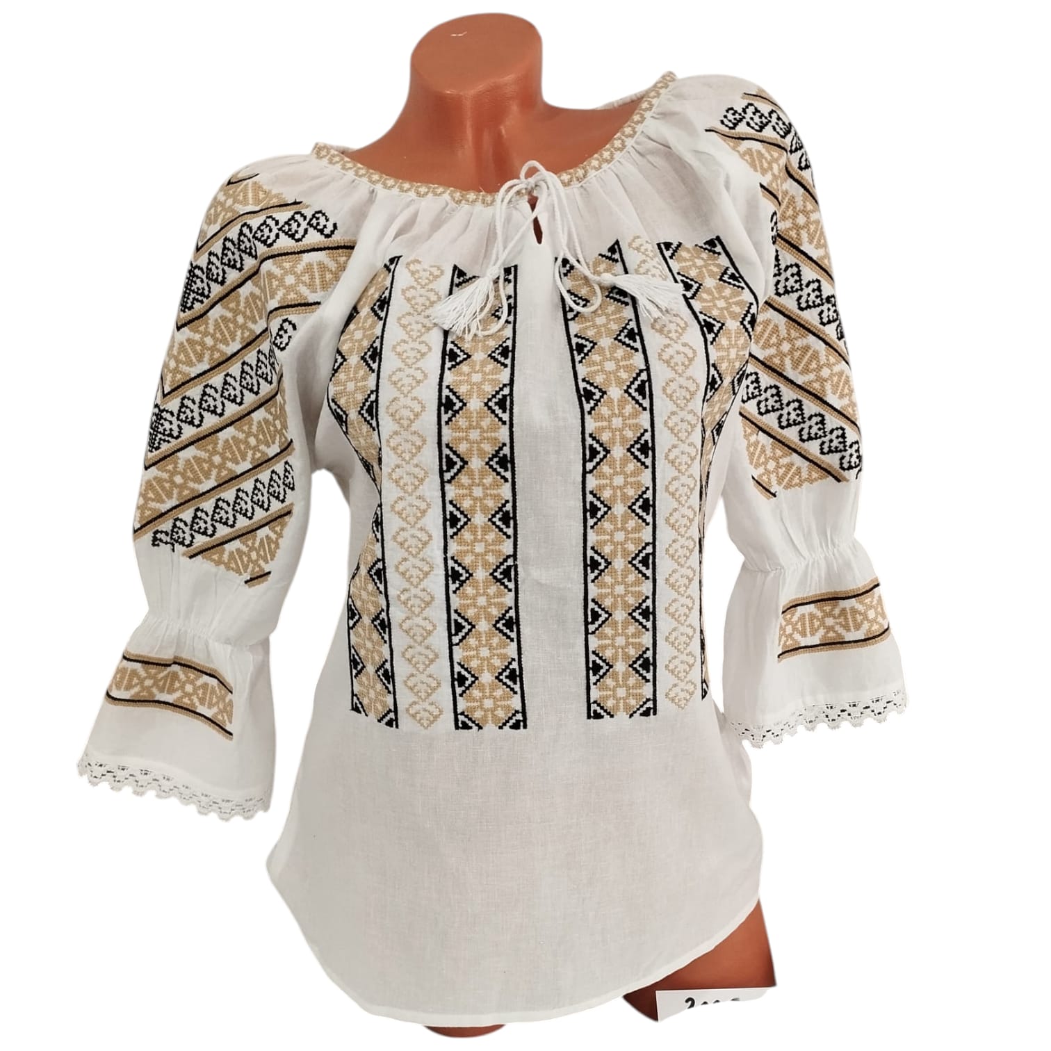 Ie traditionala fond alb brodata cu motive geometrice, ce reprezinta identitatea culturala si spirituala a purtatoarei. Aceasta este o piesa vestimentara ce poate fi purtata cu mandrie. Are maneca cu volan si dantela aplicata ca terminatie . Culori folosite la broderie negru si bej.