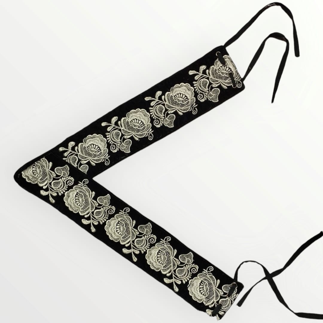 Brau traditional fond negru , brodat cu ata din matase bej, motiv floral. Avand material f. bun, catifea, se aseaza bine , conturand talia.