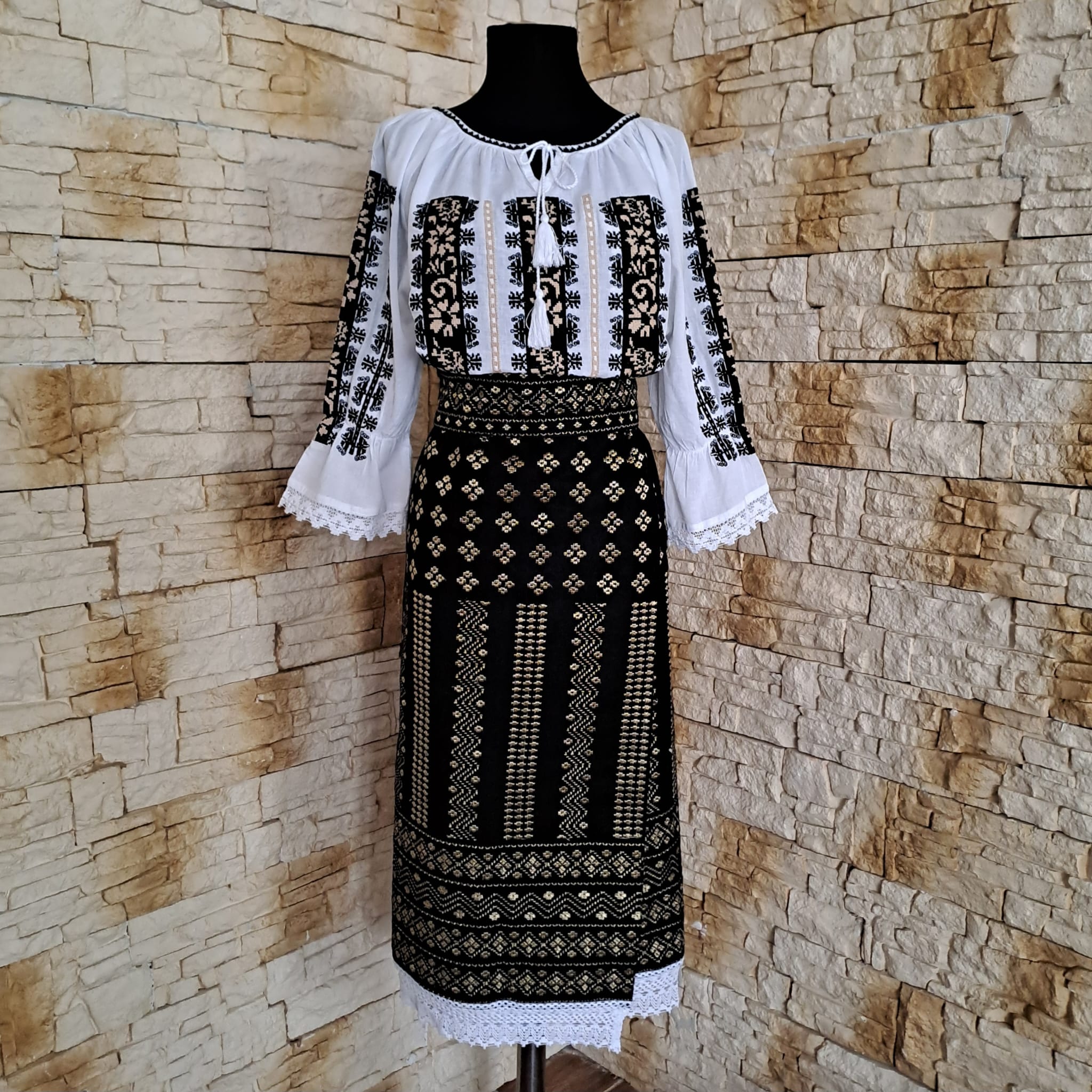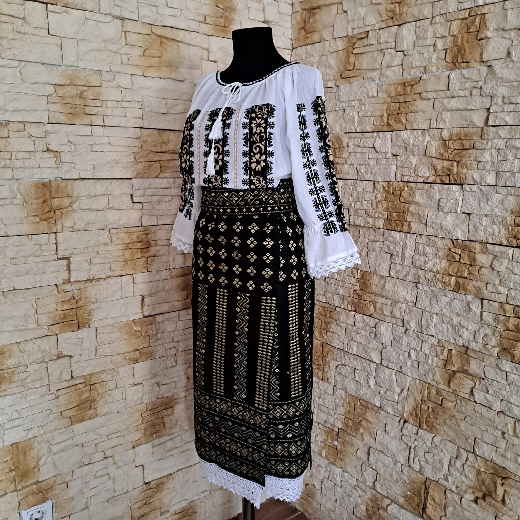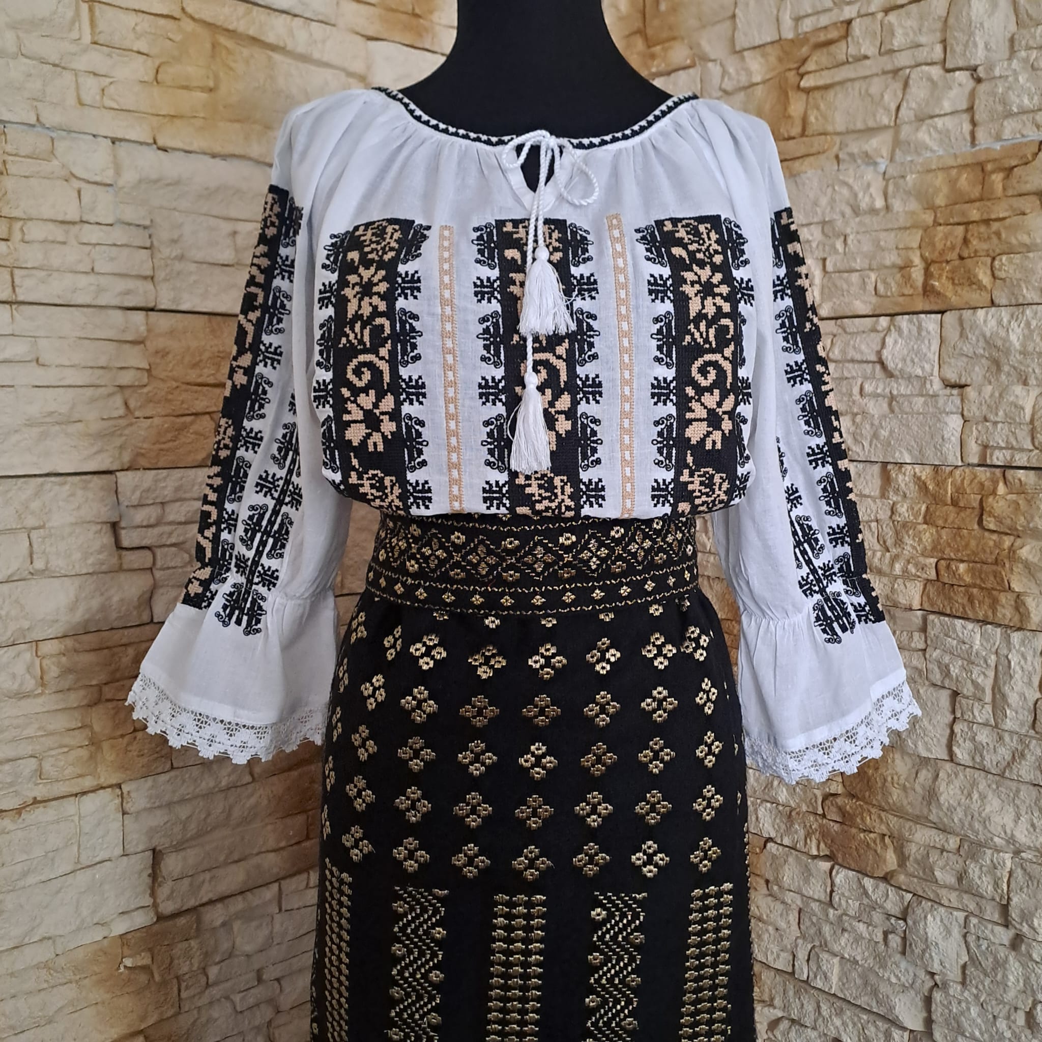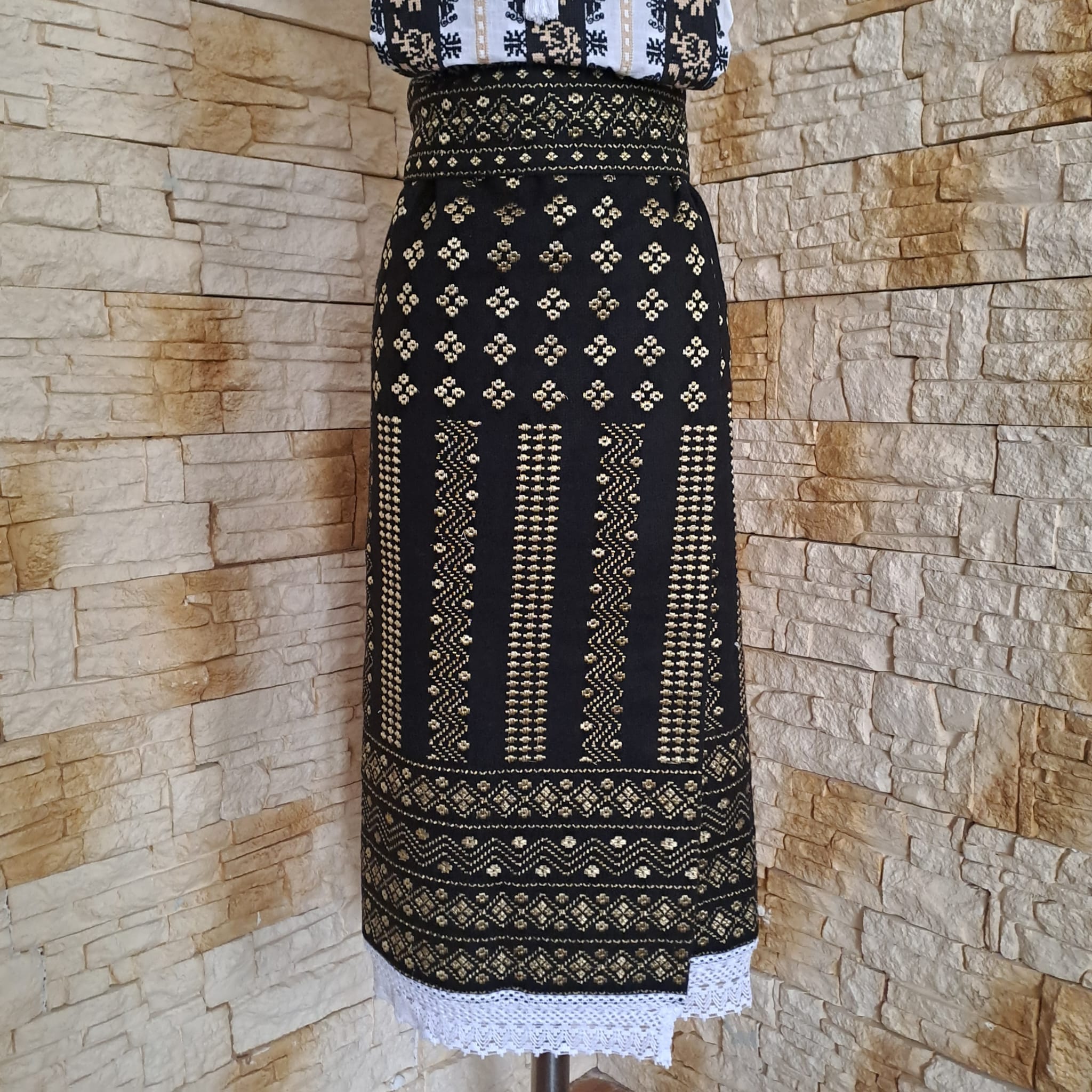 Materialul este stofa din lana brodata cu fir auriu. Are aplicata dantela din bumbac ca terminatie.