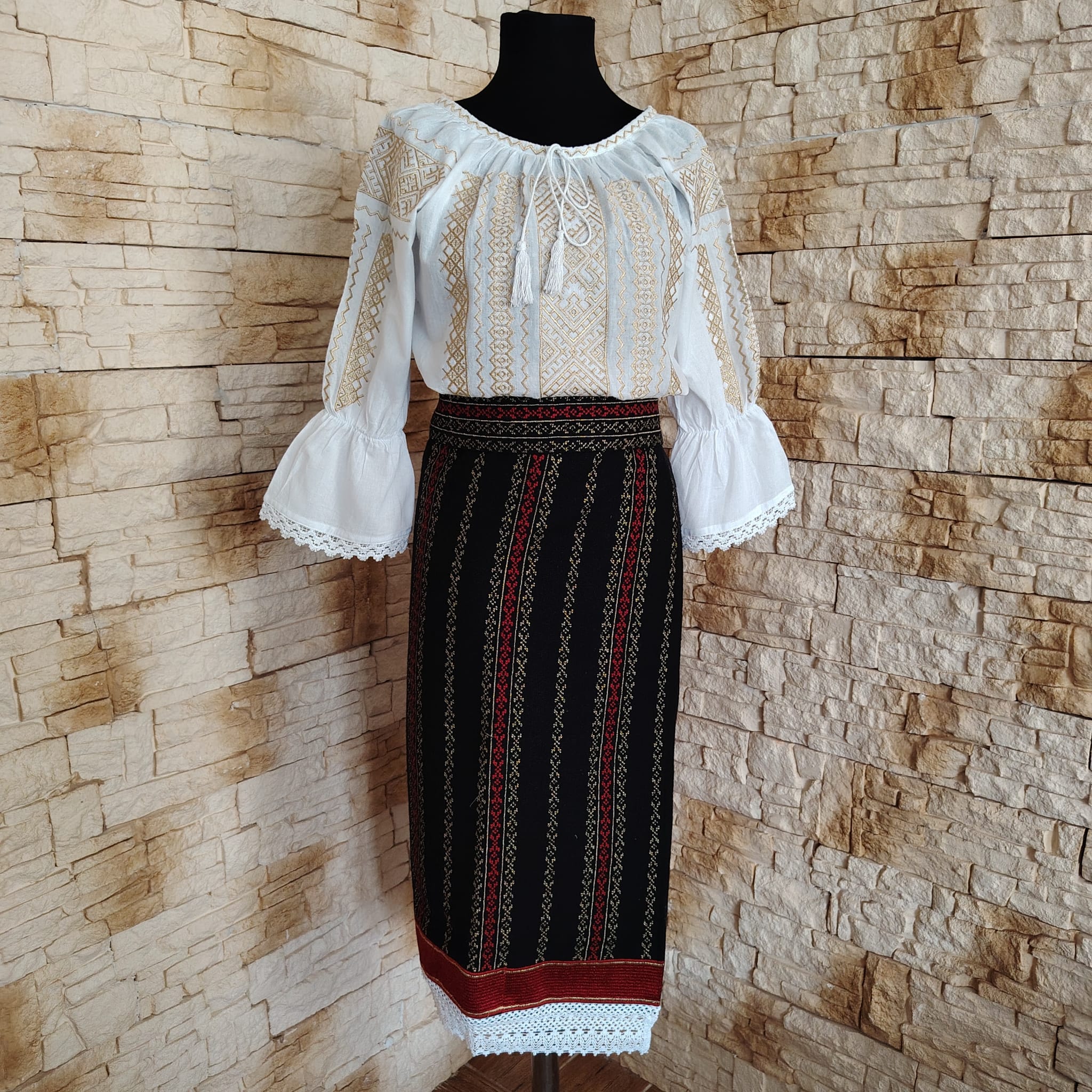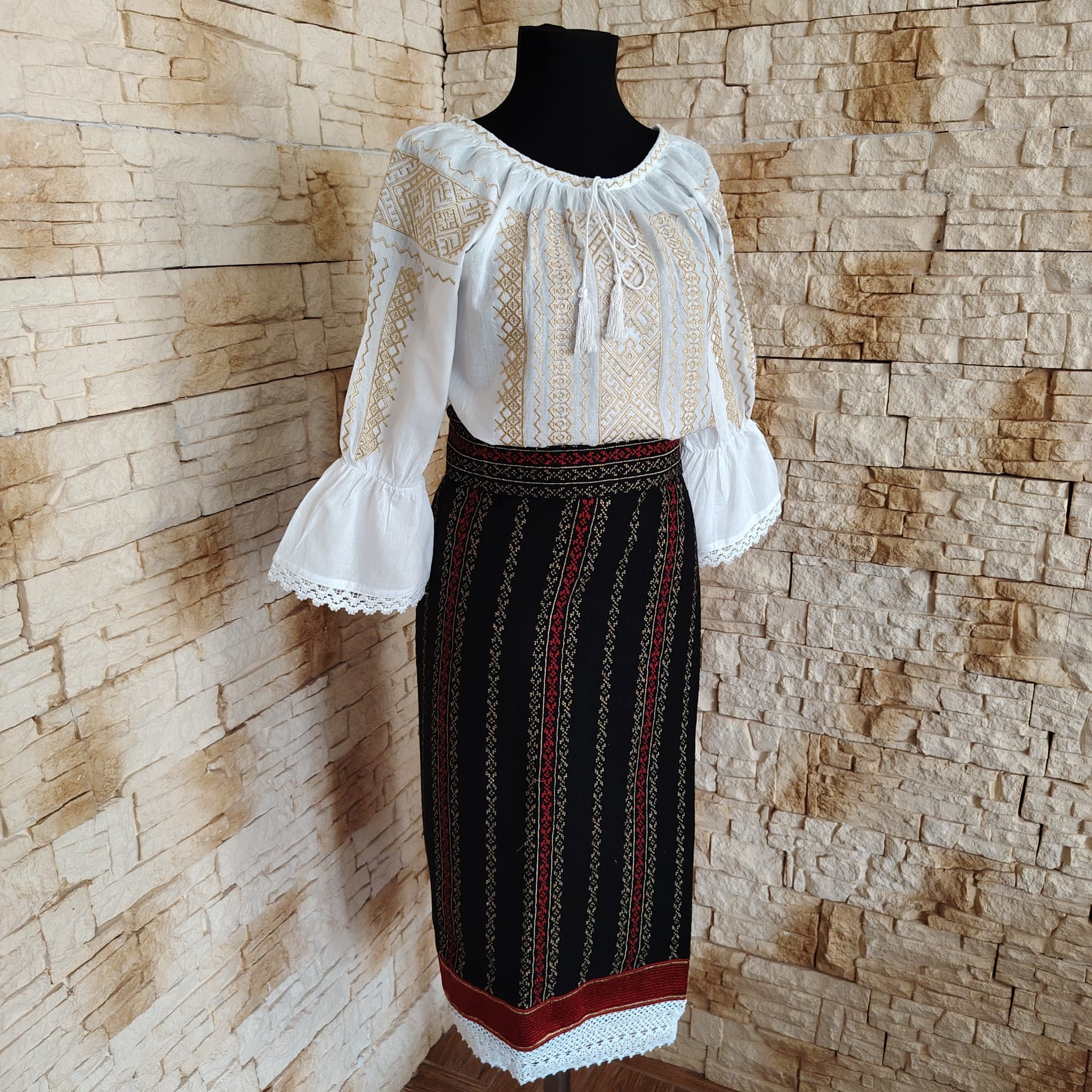 Costum traditional 3 piese, catrinta, brau si ie. Catrinta este din stofa neagra, brodata cu fir auriu si ata rosie pe verticata. Ca terminatie jos are dantela alba. Braul este din stofa ,brodat.  Ia este din in topit brodata cu fir auriu. Aceasta set este din zona Bucovinei si se poarta cu mandrie. Se poate purta pe dedesubt cu poale sau fara.