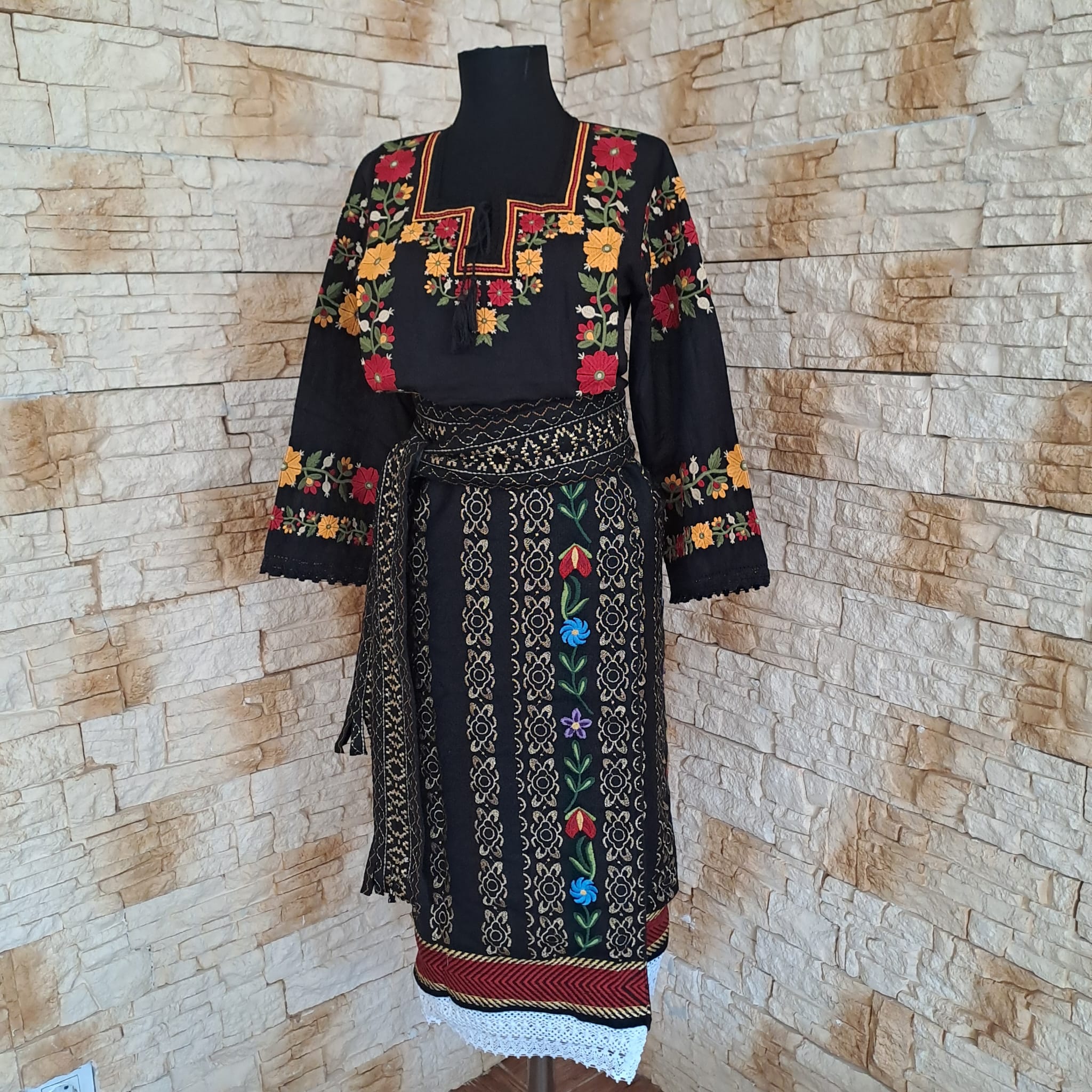 Materialul este stofa din lana brodata cu fir auriu. Are aplicata dantela din bumbac ca terminatie.