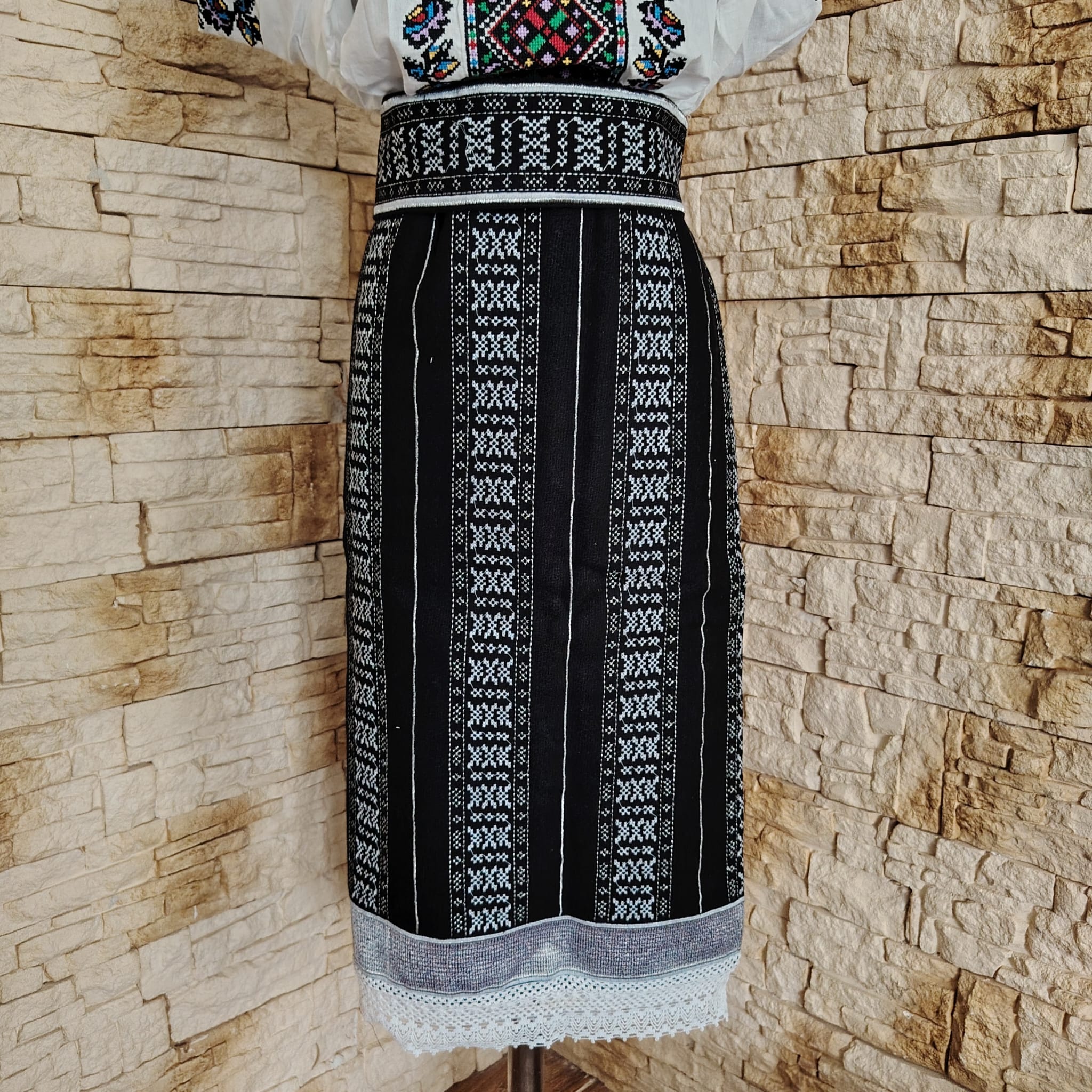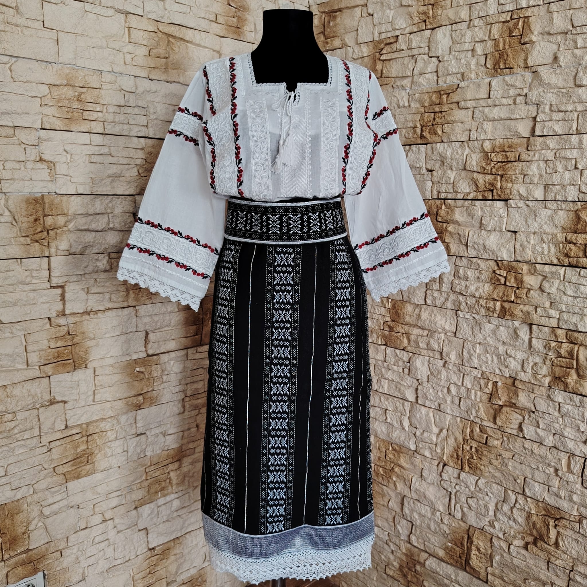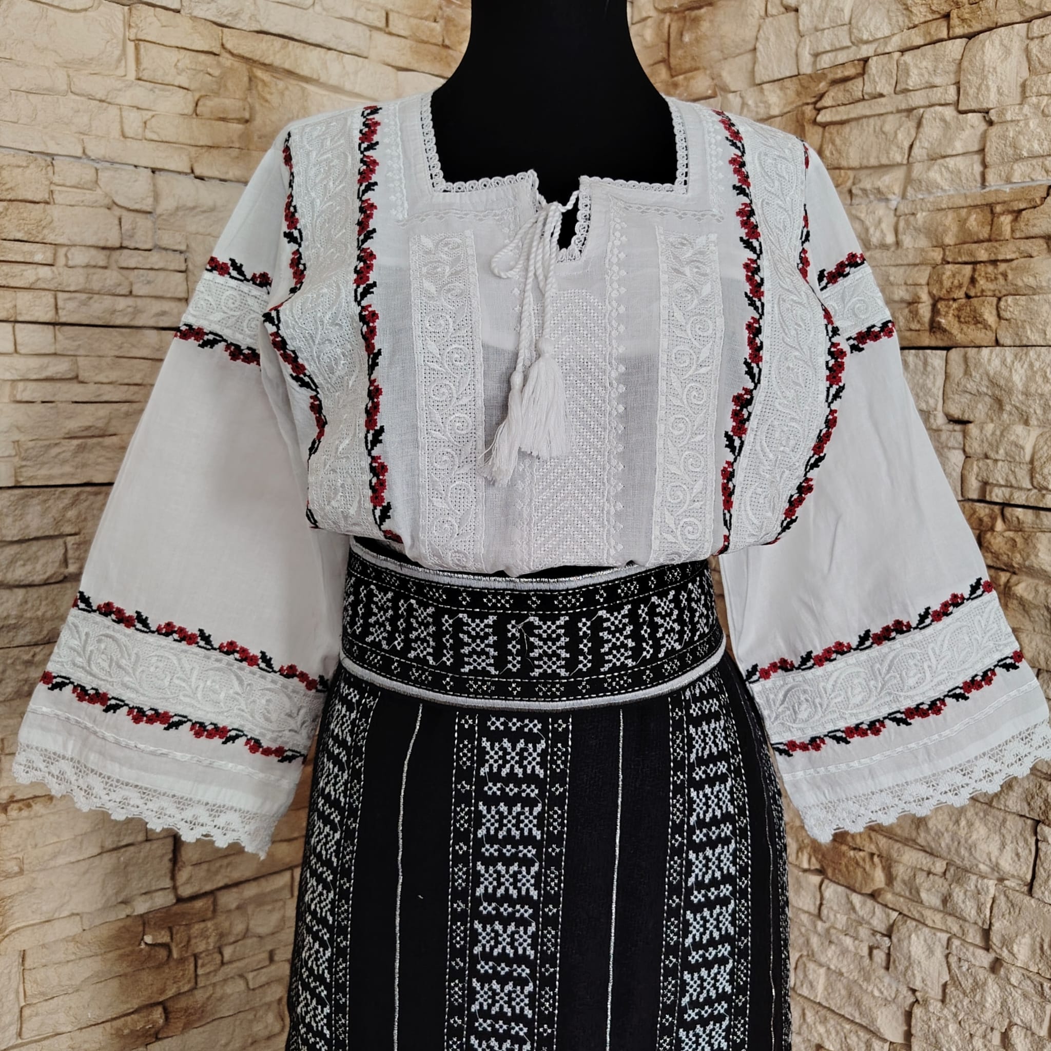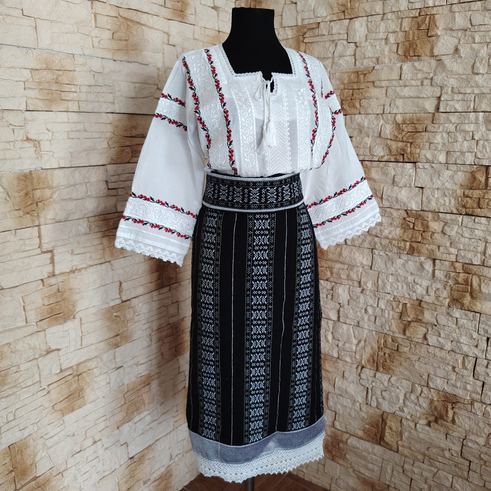 Materialul este stofa din lana brodata cu fir argintiu si ata alba. Are aplicata dantela din bumbac ca terminatie.
