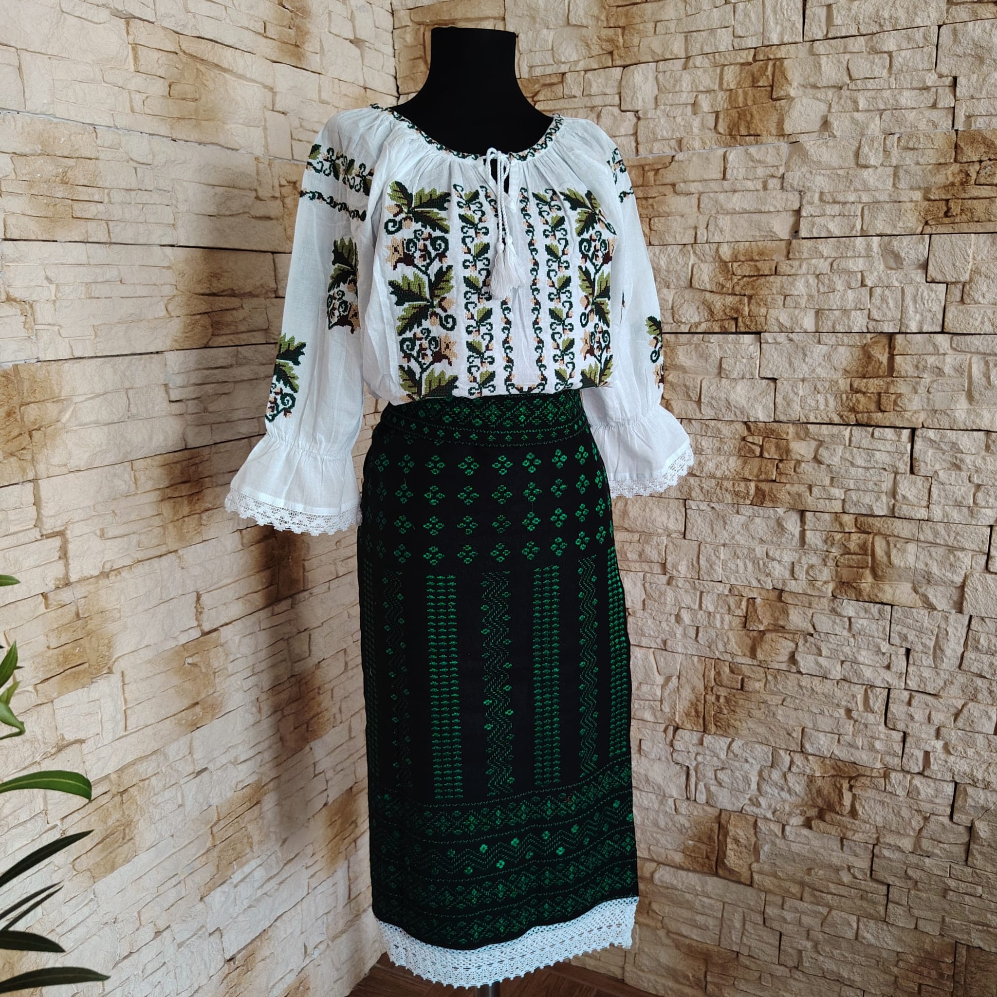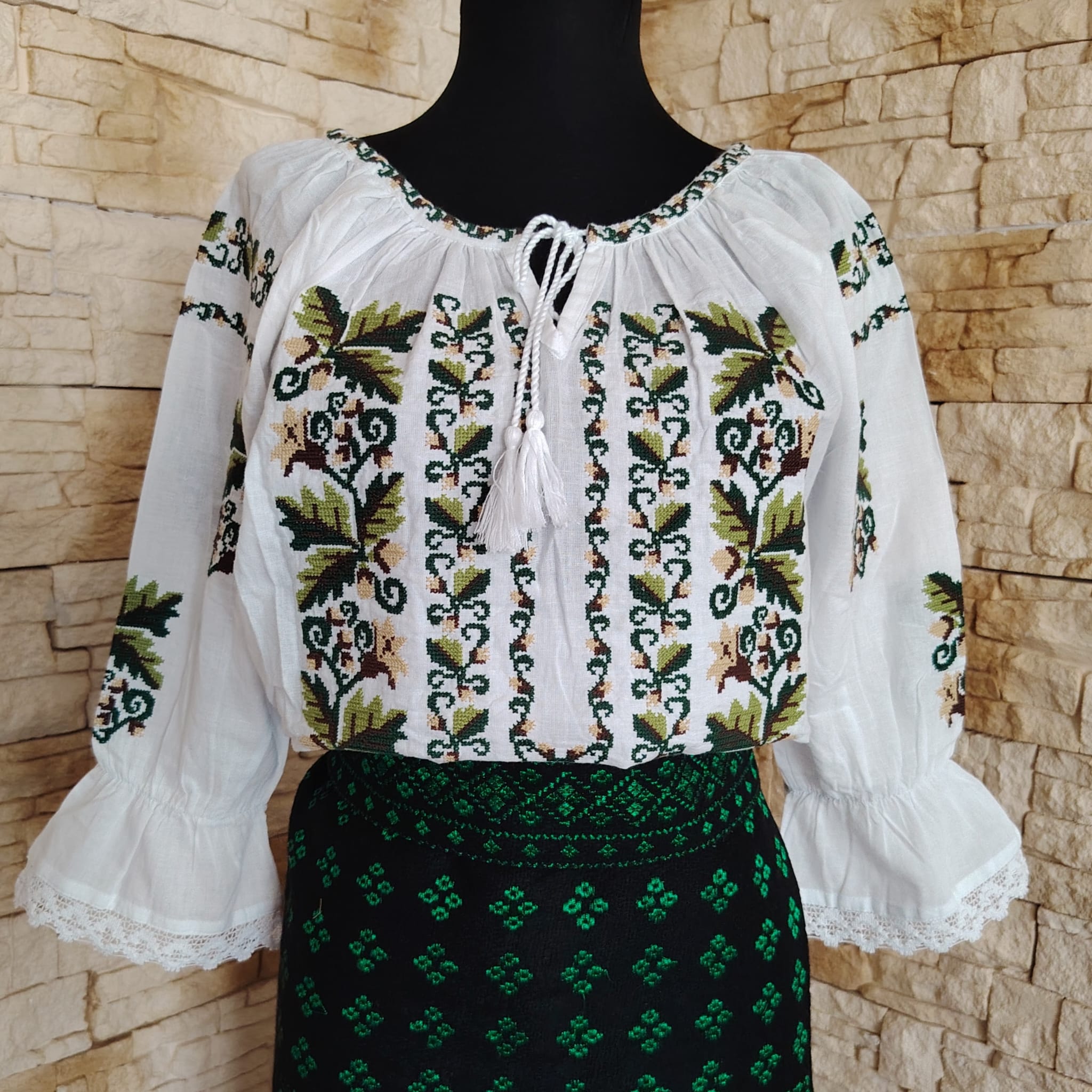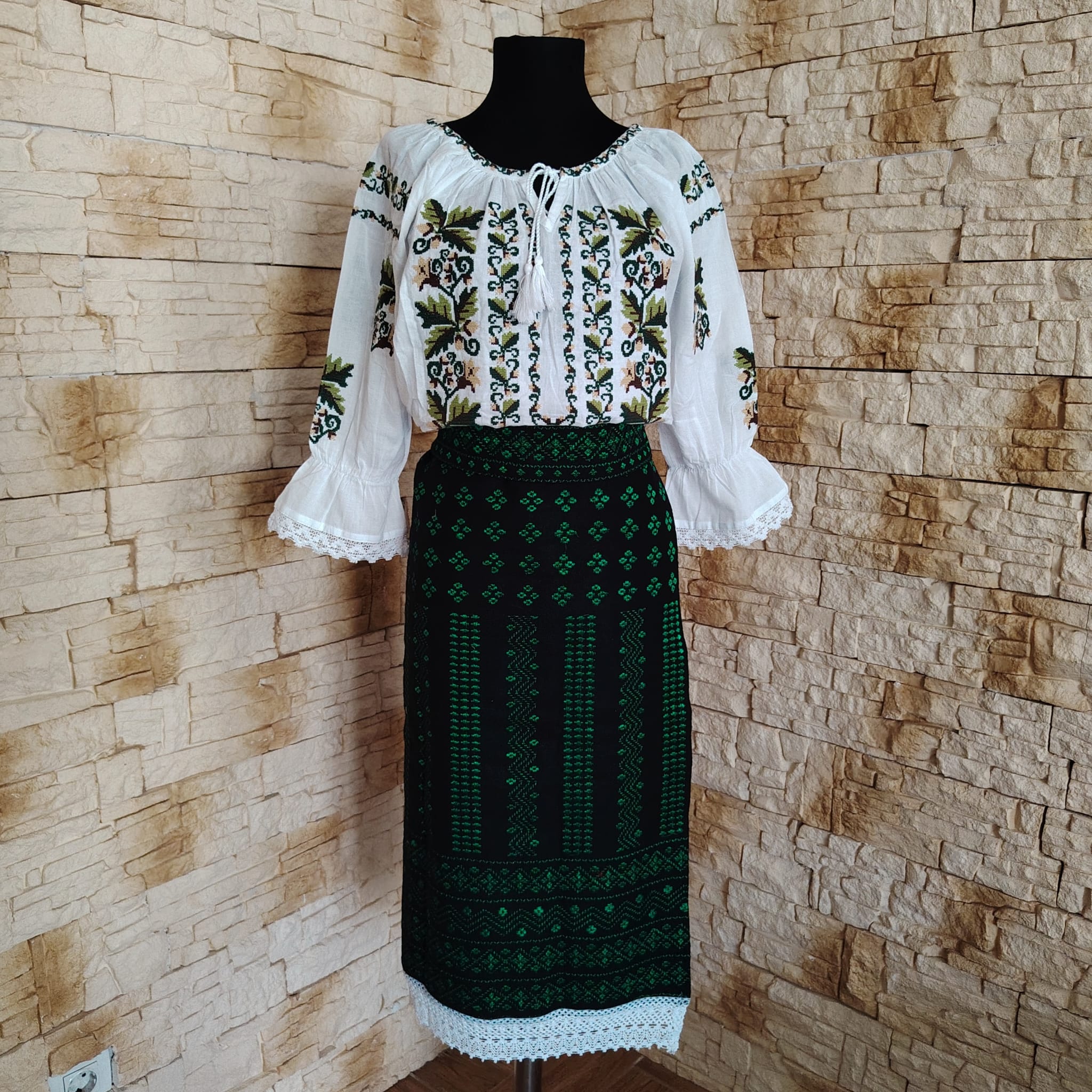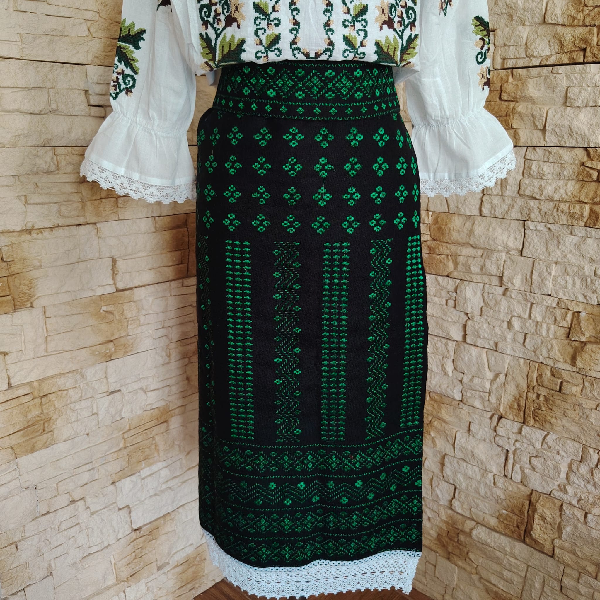 Materialul este stofa din lana brodata cu fir verde. Are aplicata dantela din bumbac ca terminatie.