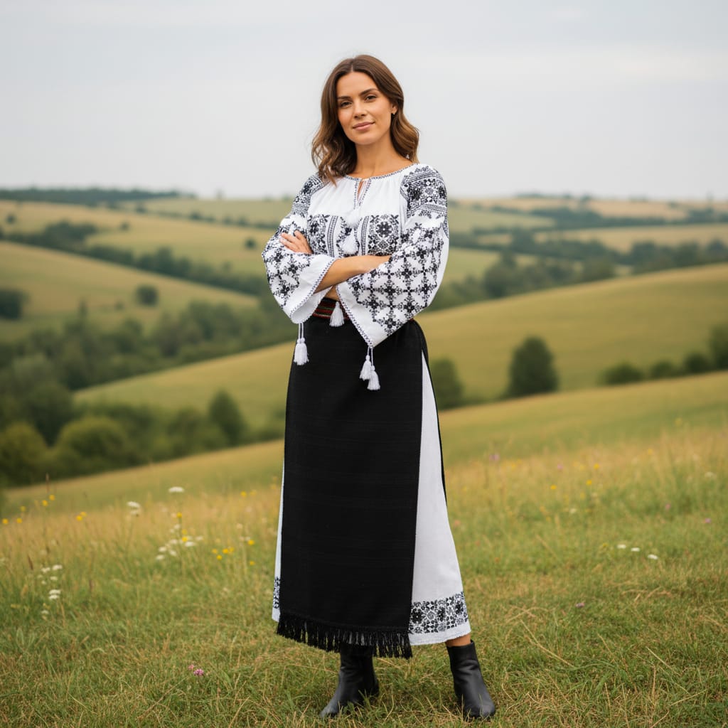 Ie fond alb, brodata cu ata neagra.