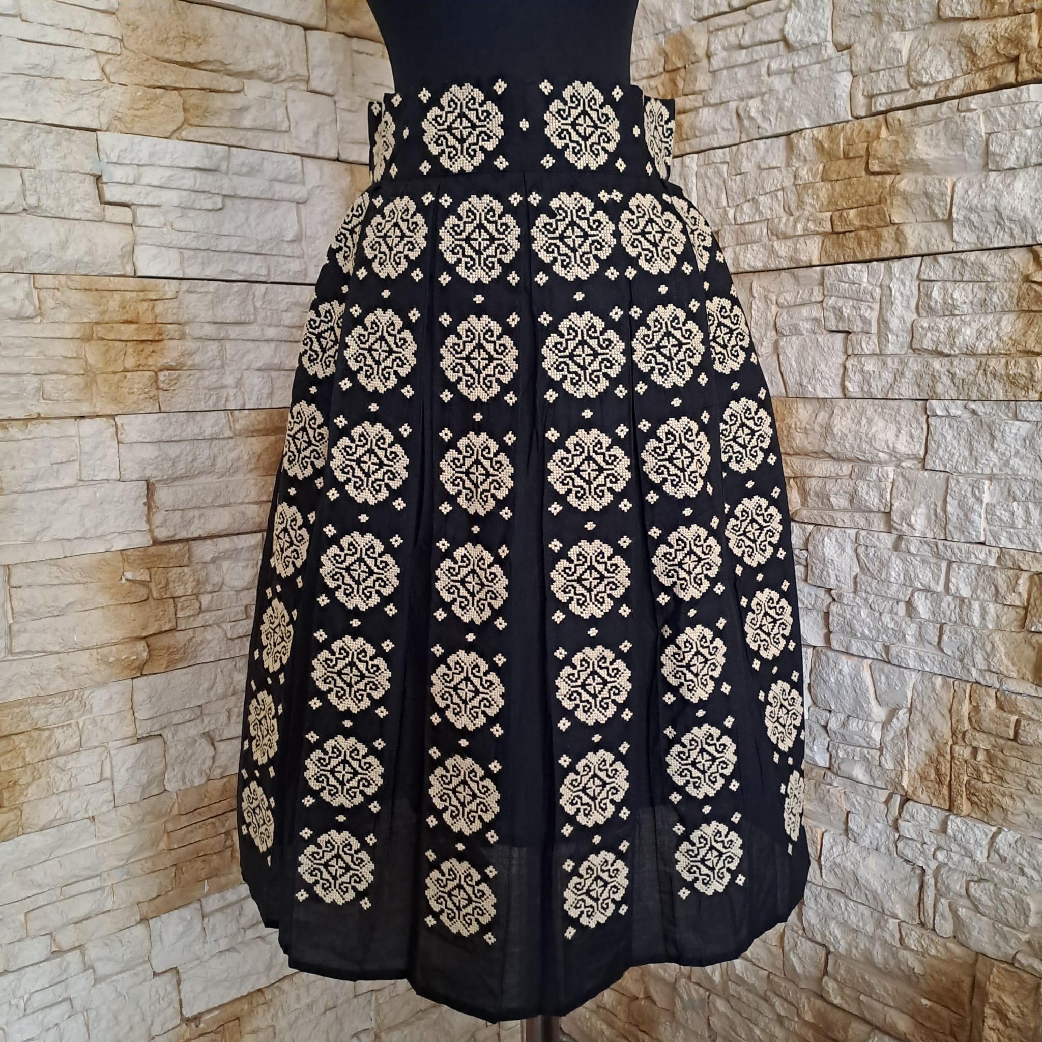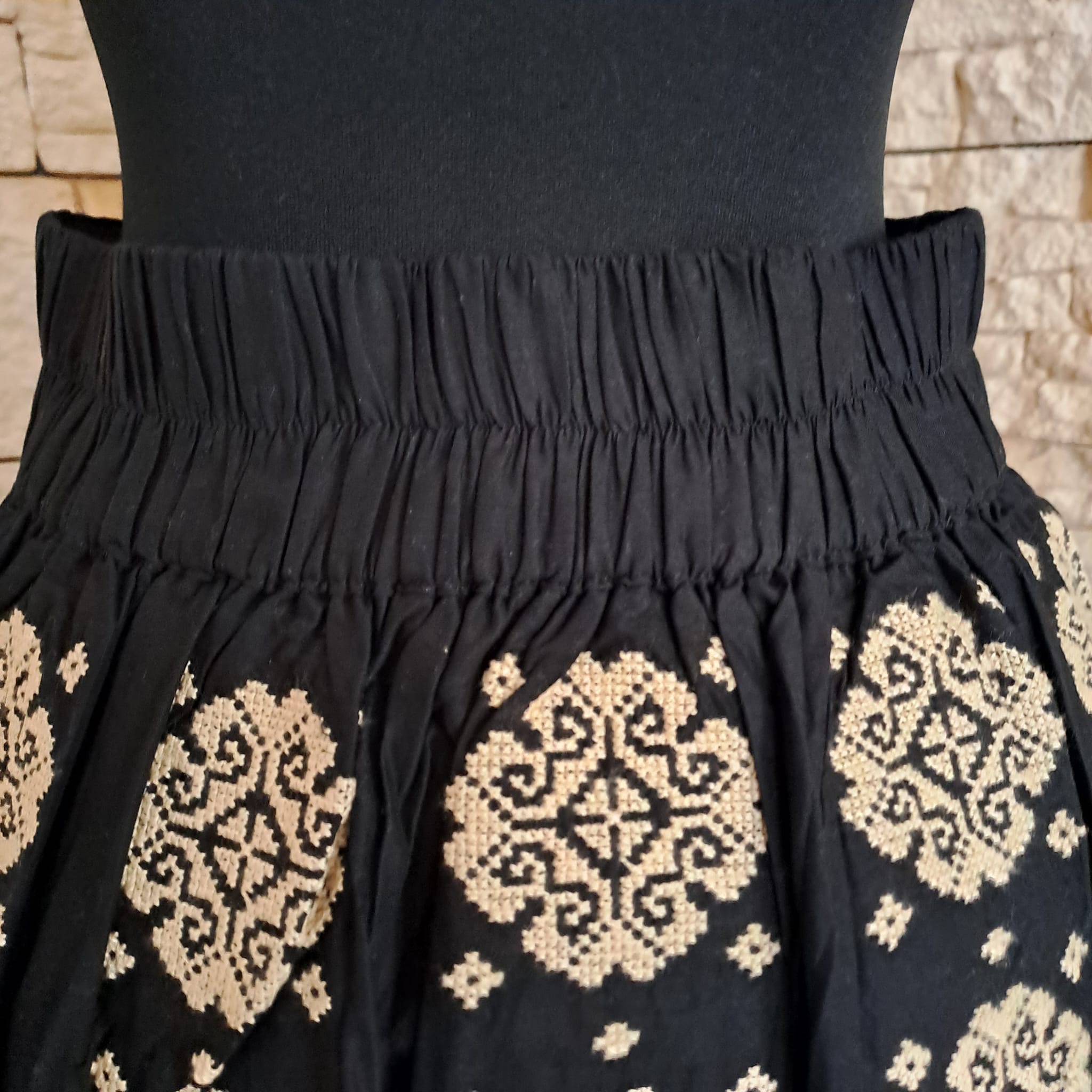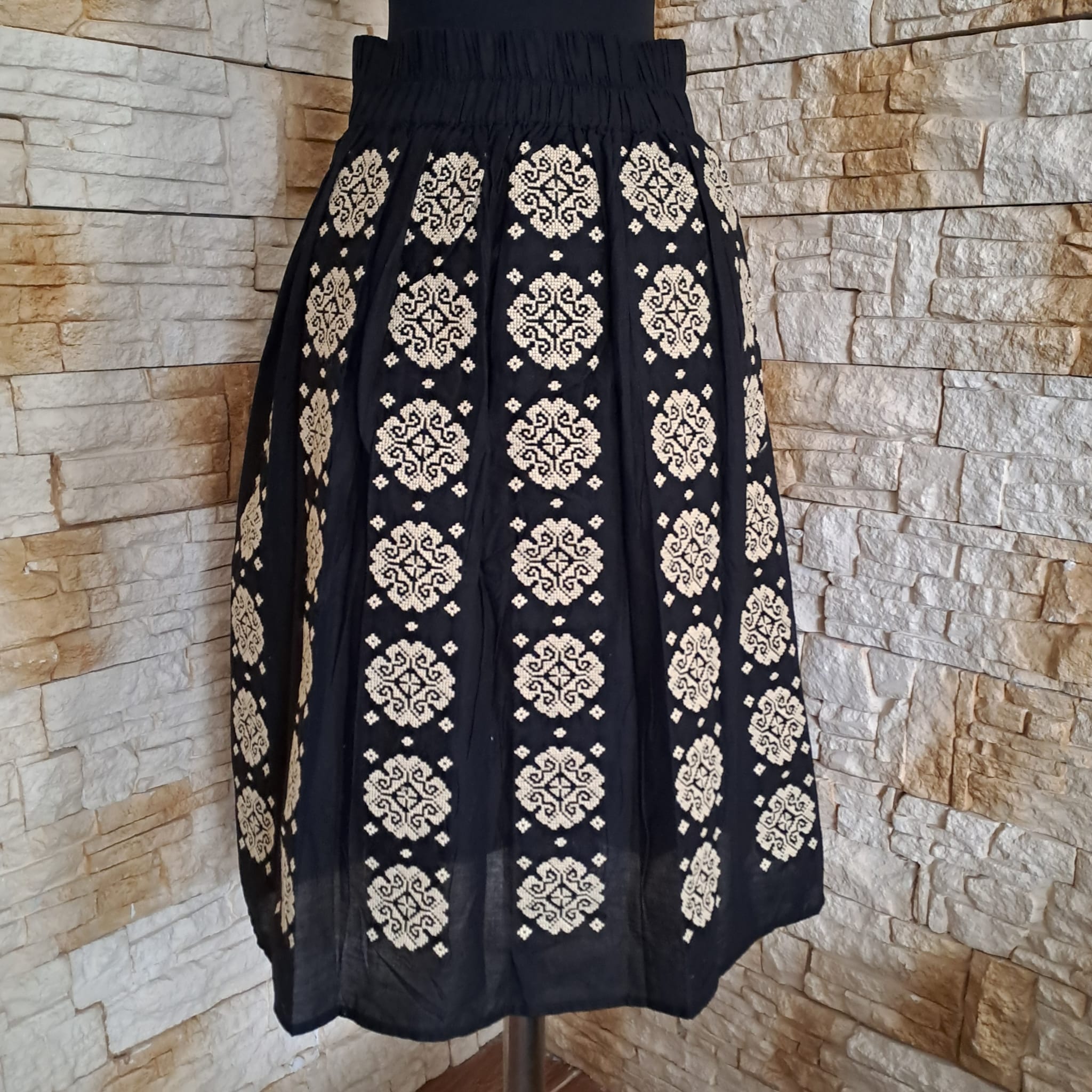 Fusta traditionala fond negru , brodata cu ata bej , figuri geometrice verticale.  Broderia este la betelie doar in partea din fata , in spate fiind elastic . Fusta  este brodata de jur imprejur . Fusta este lejera si comoda , usor de asortat si purtat. Nu este transparenta [ are jupa], nu intra la apa si nu ies culorile .