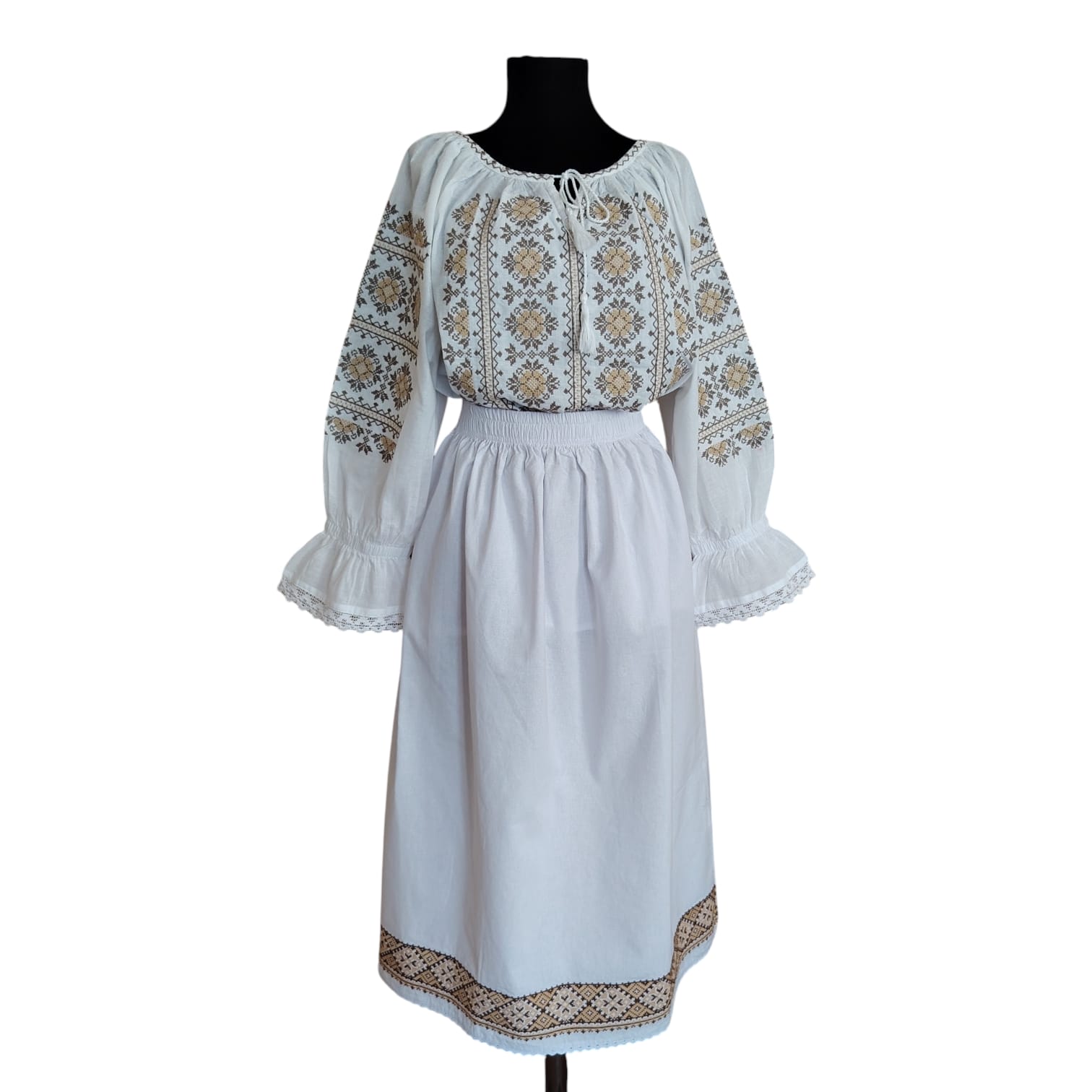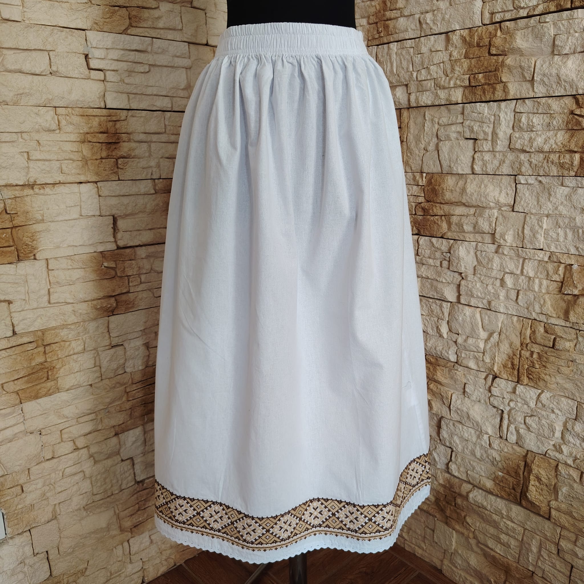 Produsul prezentat în imagine este o fustă tradițională, confecționată din bumbac 100%. Aceasta este o piesă vestimentară albă, lungă, decorată la bază cu o broderie geometrică în nuanțe de maro, realizată la mașină de tip război.