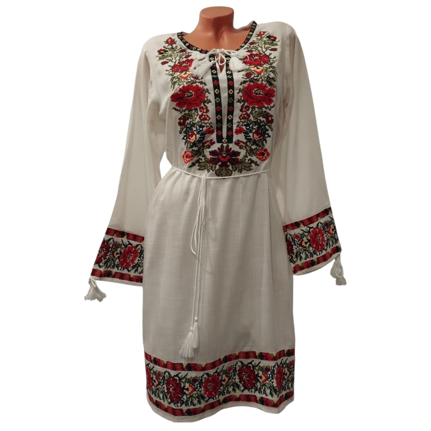 Rochie traditionala fond ALB, brodata cu ata colorata motiv floral. Cu o croiala lejera si un material racoros si moale, rochia se aranjeaza foarte bine. Are ca accesoriu cordon din matase . Este brodata pe piept, maneci si in partea de jos . Are atasate buzunare in parti si snur reglabil la gat si maneci . Rochia poate fi purtata la evenimente traditionala, dar si zi de zi , depinde de starea purtatoarei.