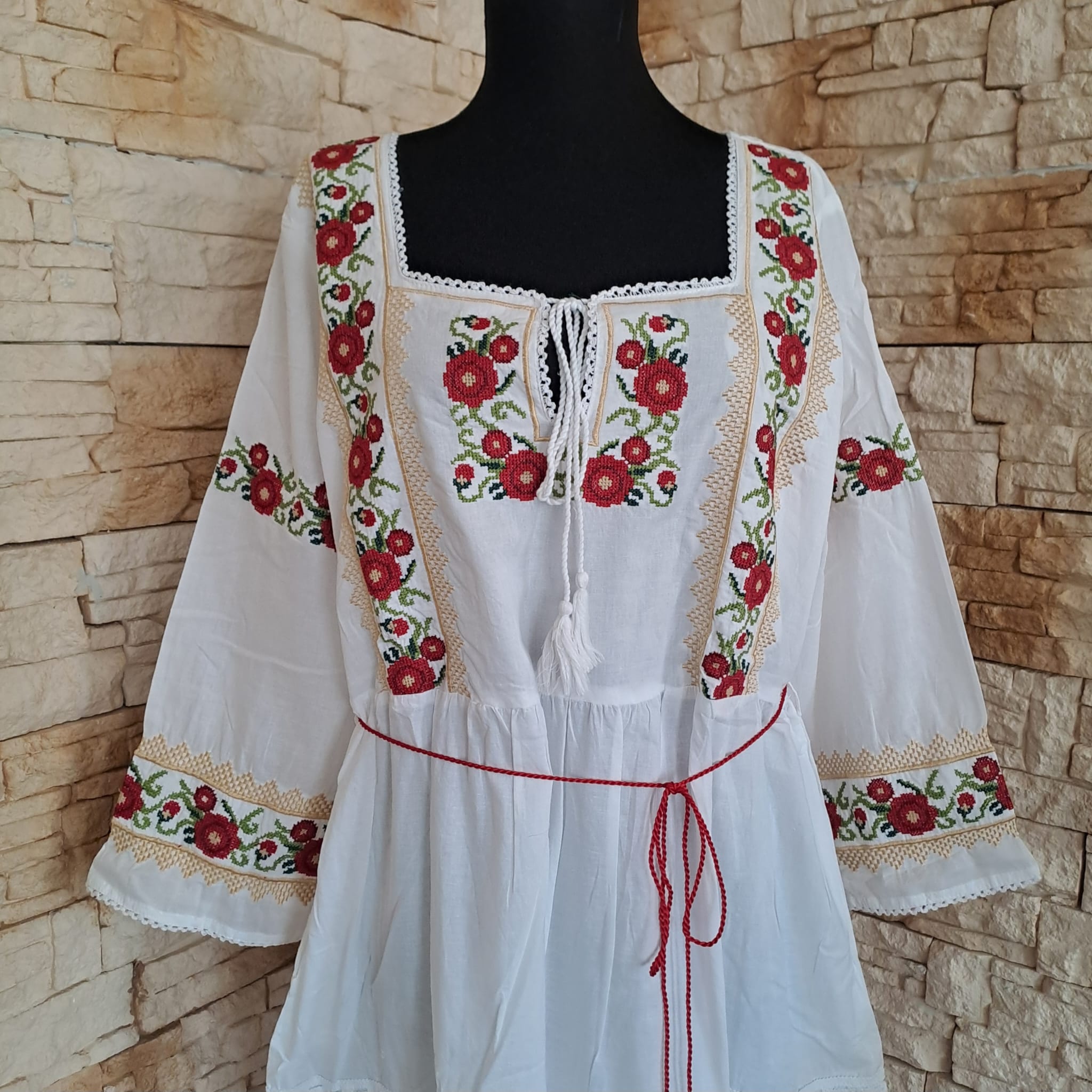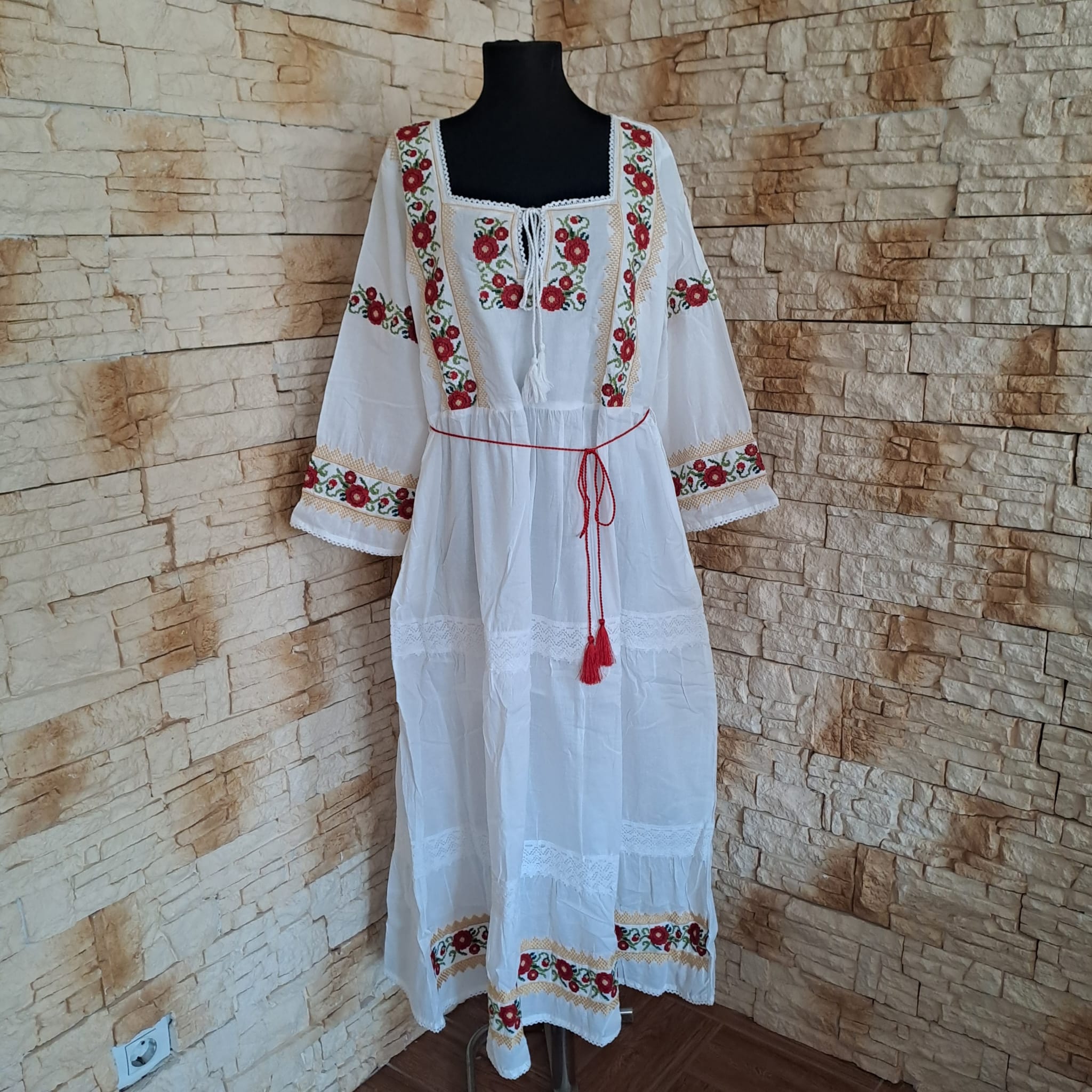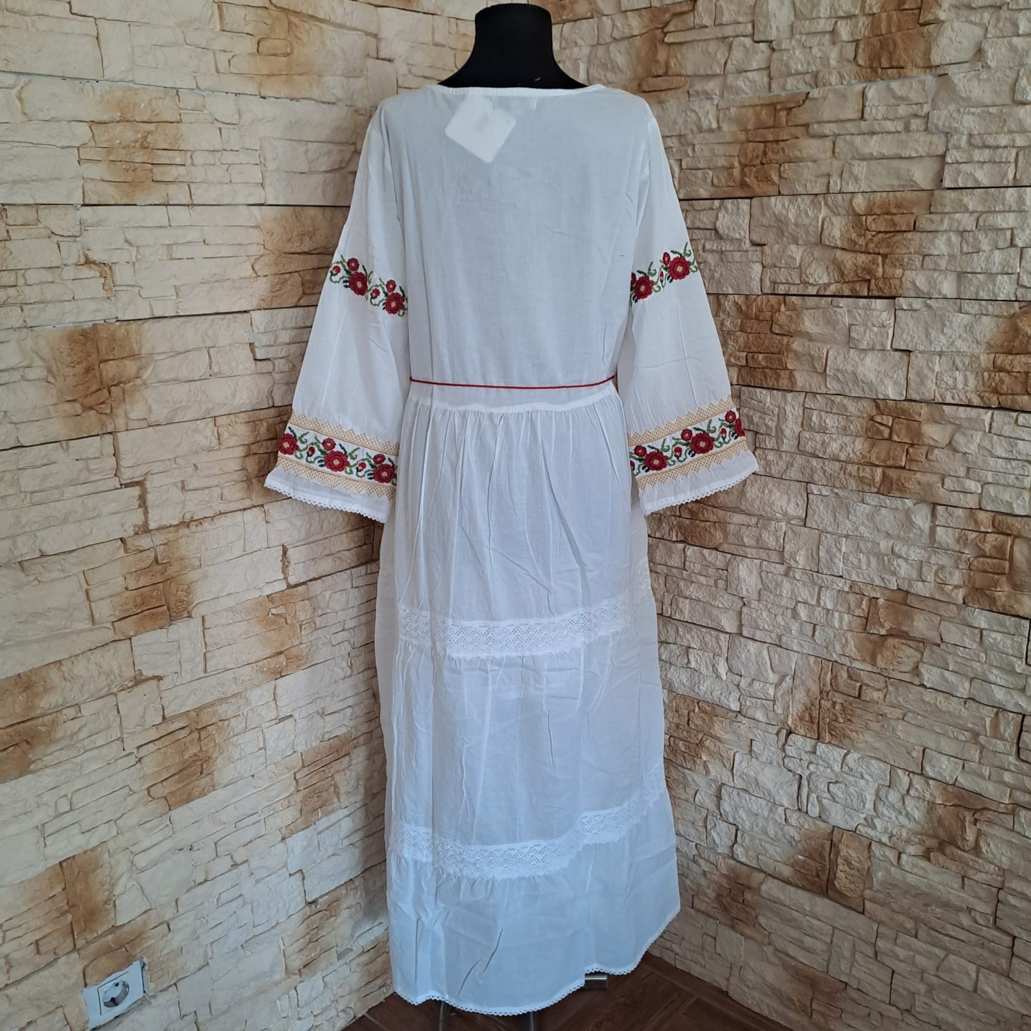 Rochie lunga fond alb, brodata cu figuri florale colorate. Cu o croiala lejera si un material racoros si moale, rochia se aranjeaza foarte bine. .Este brodata pe piept si in partea din fata, spatele fiind uni . Are maneca cu dantela ca terminatie. Rochia poate fi purtata la evenimente dar si zi de zi , depinde de starea purtatoarei. Nu este transparenta , are jupa.