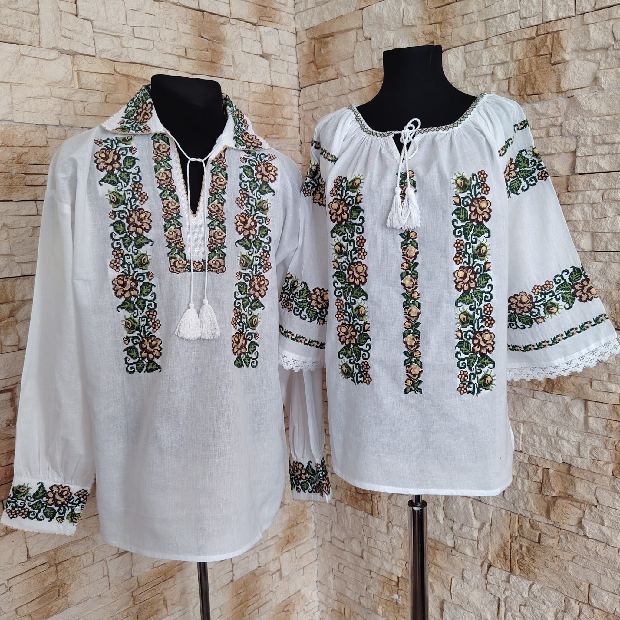 Setul format din ie pentru femei si camasa traditionala pentru barbat este fond alb , cu motive florale sau geometrice delicate, este decorată cu broderii tradiționale în tonuri contrastante, inspirate din motivele populare românești. Mânecile largi și croiala confortabilă oferă libertate de mișcare și eleganță, iar șnurul la gât adaugă un accent autentic.