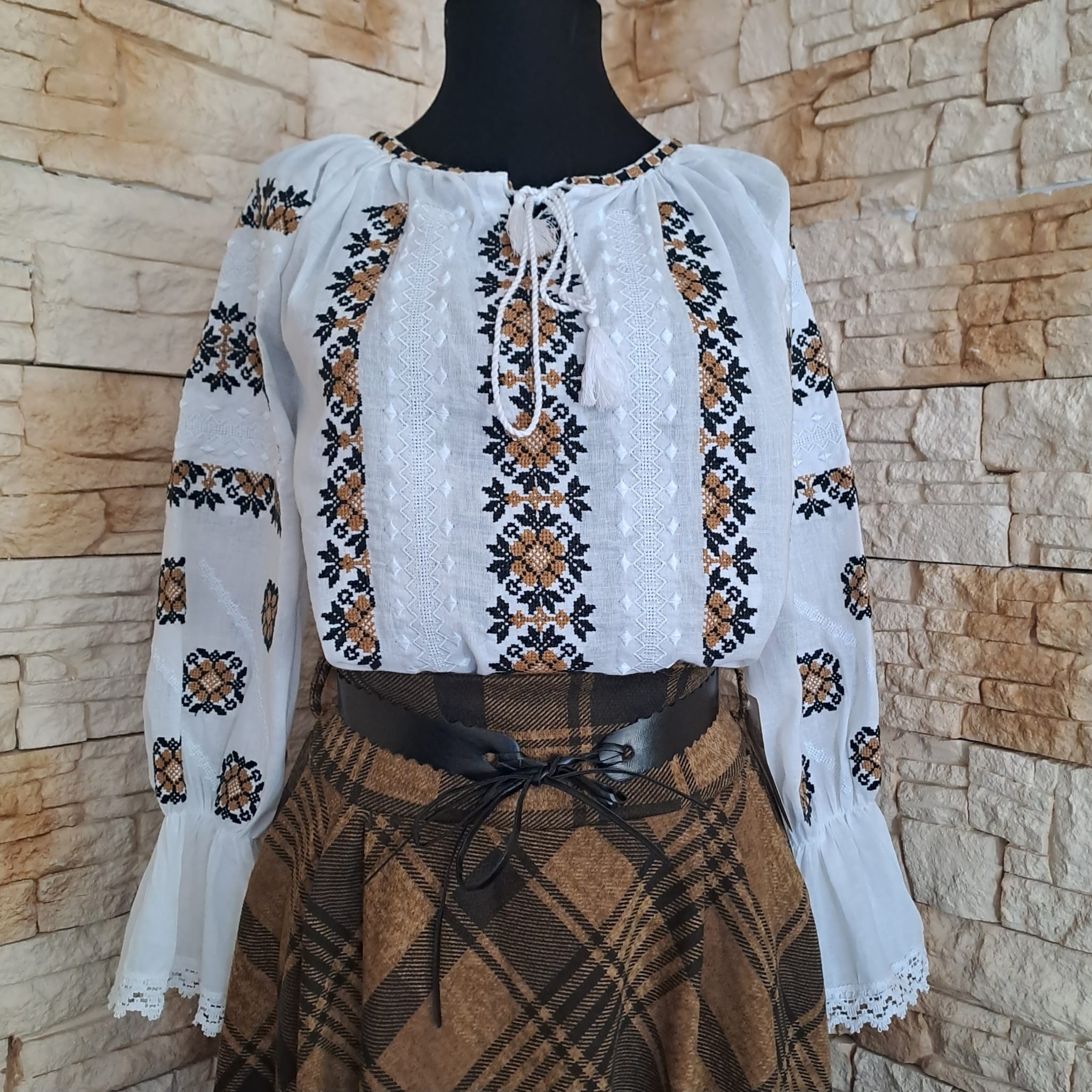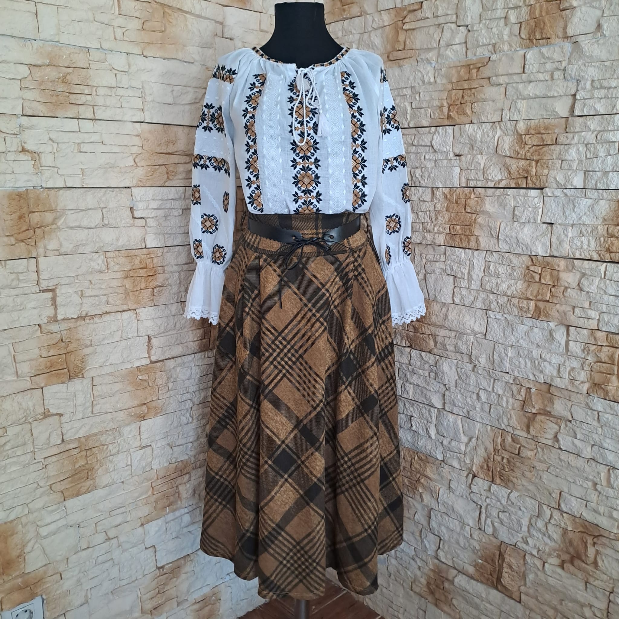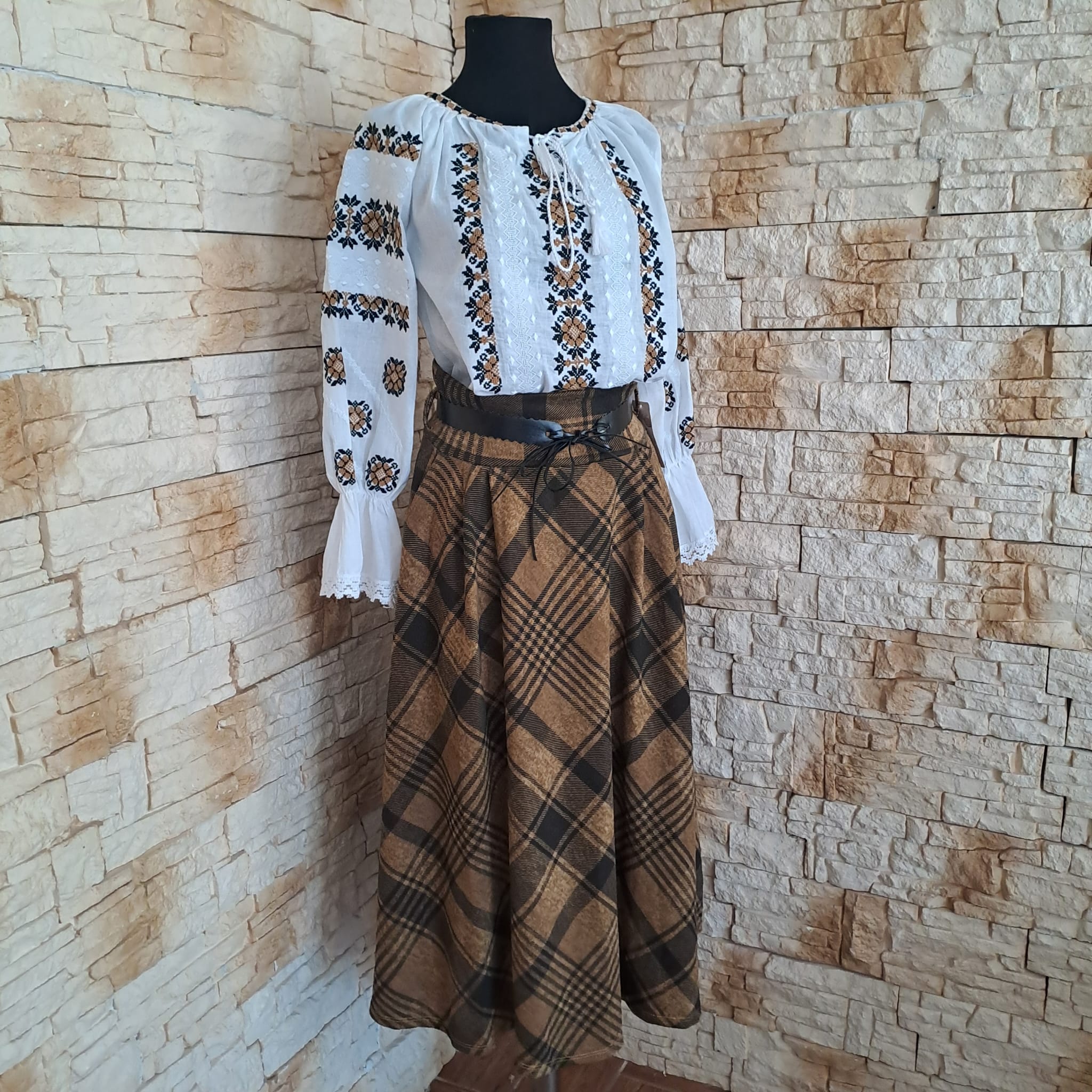 Set 2 piese( ie cu fusta in carouri) . Se poate purta zi de zi cu pantofi sau cizme.