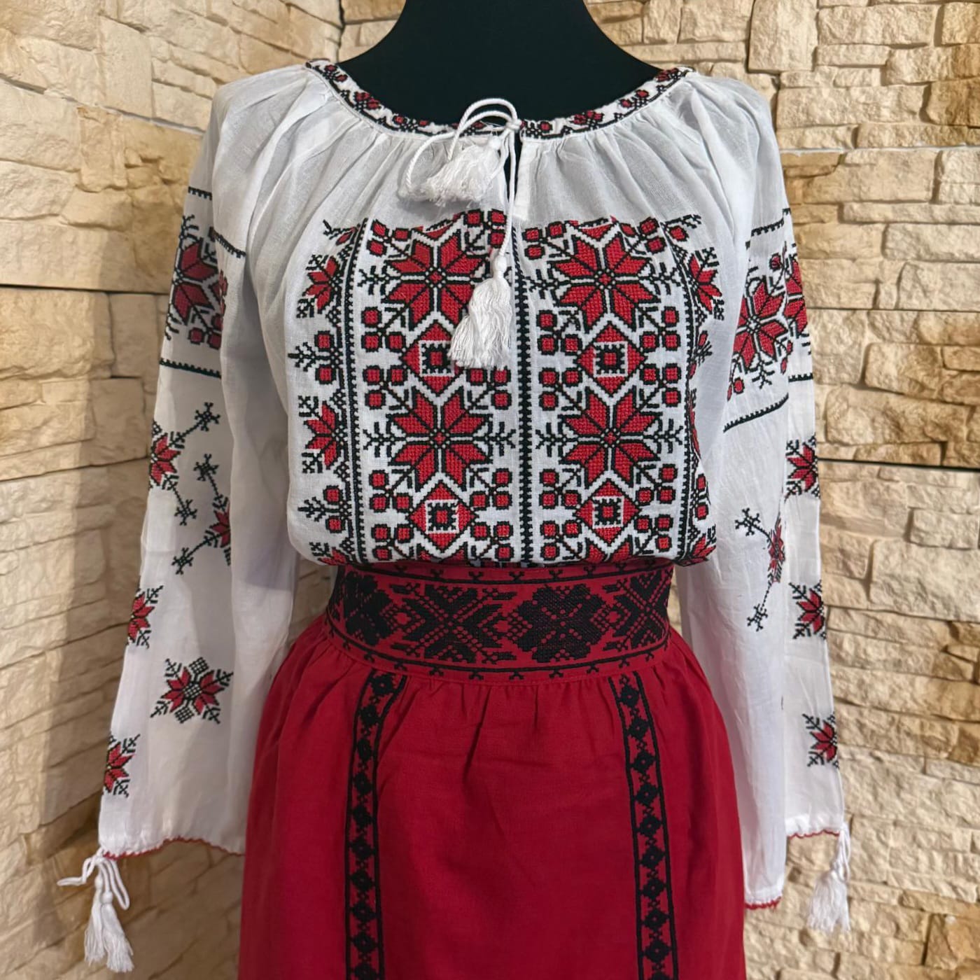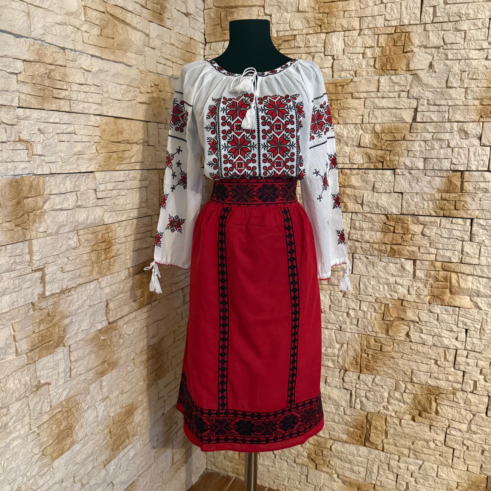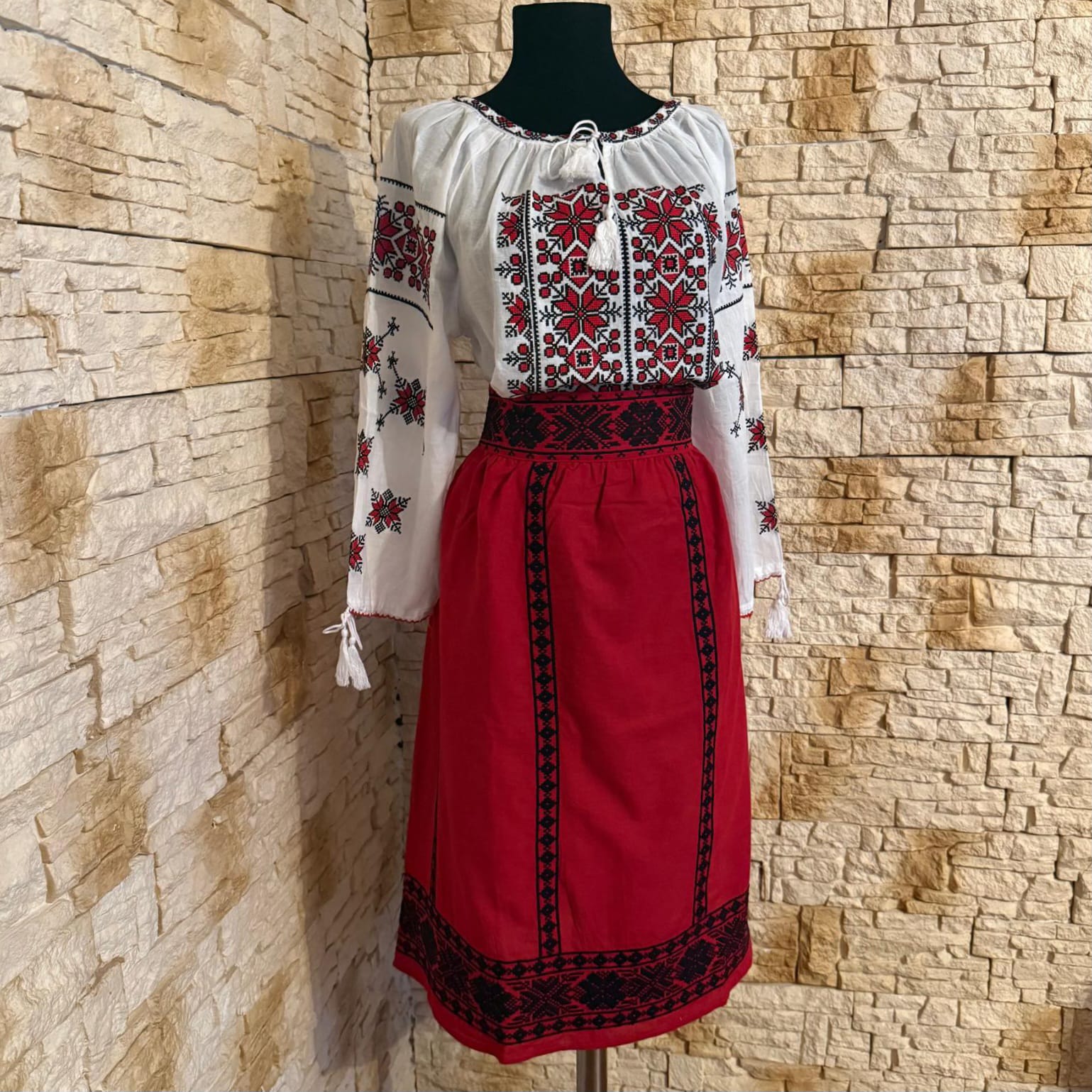 Set ie cu fusta , brodat motiv geometric. Ia este brodata cu ata neagra si rosie, iar fusta este fond rosu brodata cu ata neagra. Fusta este brodata la betelie in partea din fata iar la spate are elastic. In partea de jos si vertical, fusta este brodata de jur imprejur. Nu este transparenta, are jupa. Acesta este un costum ce se poarta cu drag la evenimente culturale sau traditionale.
